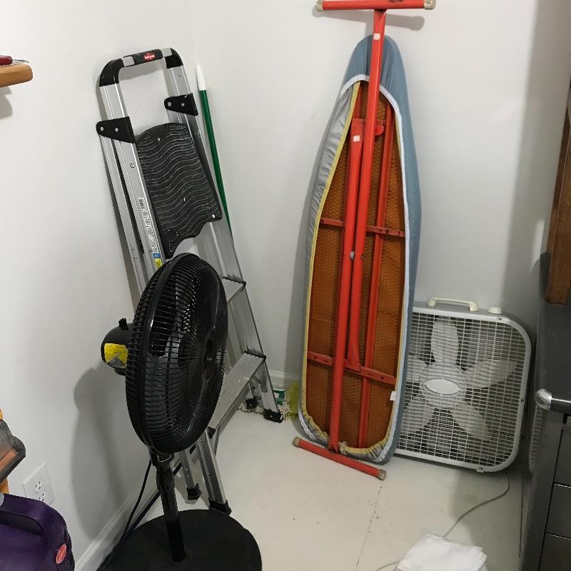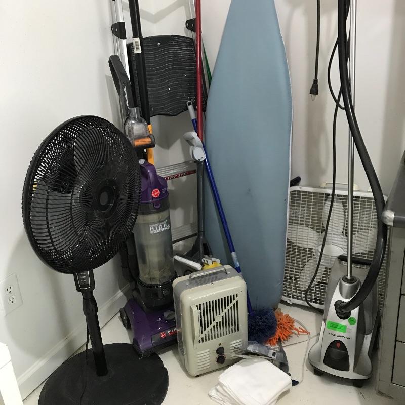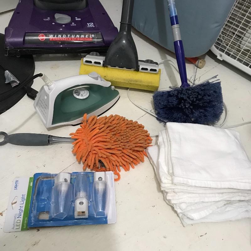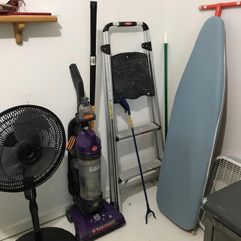 Perfect starter lot for a new house or apartment! Lot includes Rowenta steamer, Hoover vacuum, 4’ Rubbermaid step ladder, two floor fans, a small space heater and more! See photos for entire lot inventory and model numbers. All electric items turn on when plugged in. No shipping.