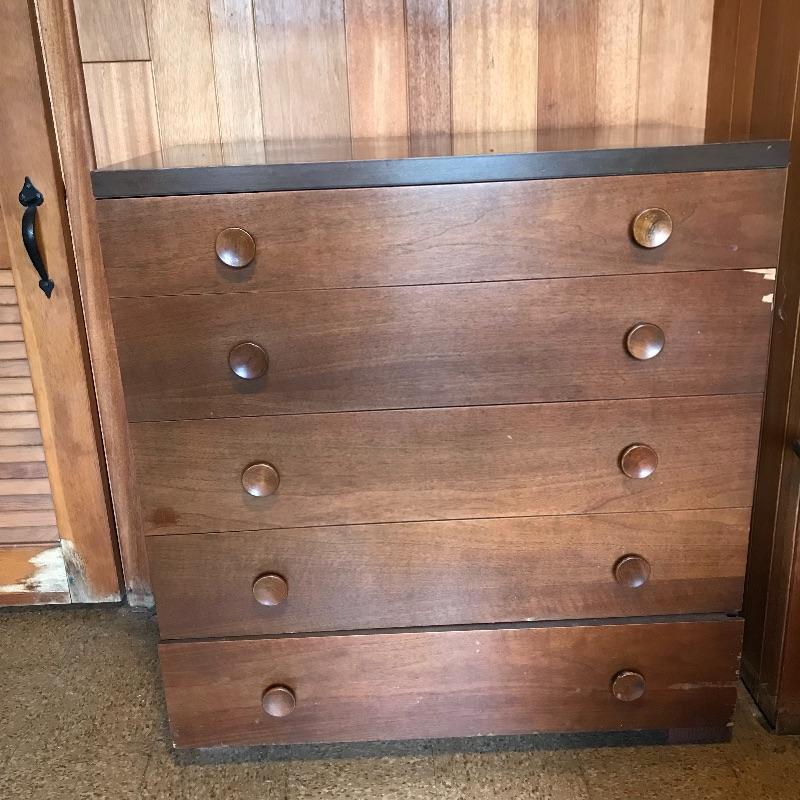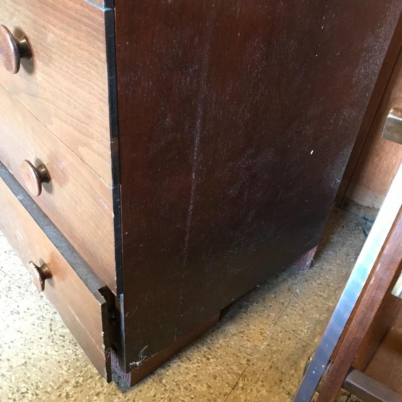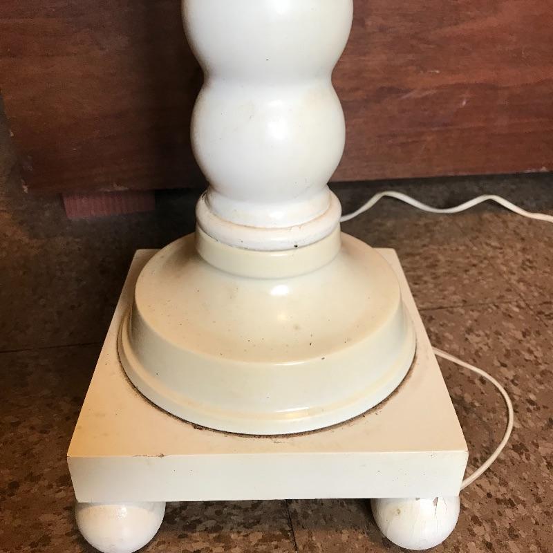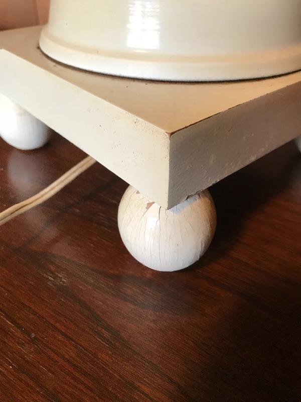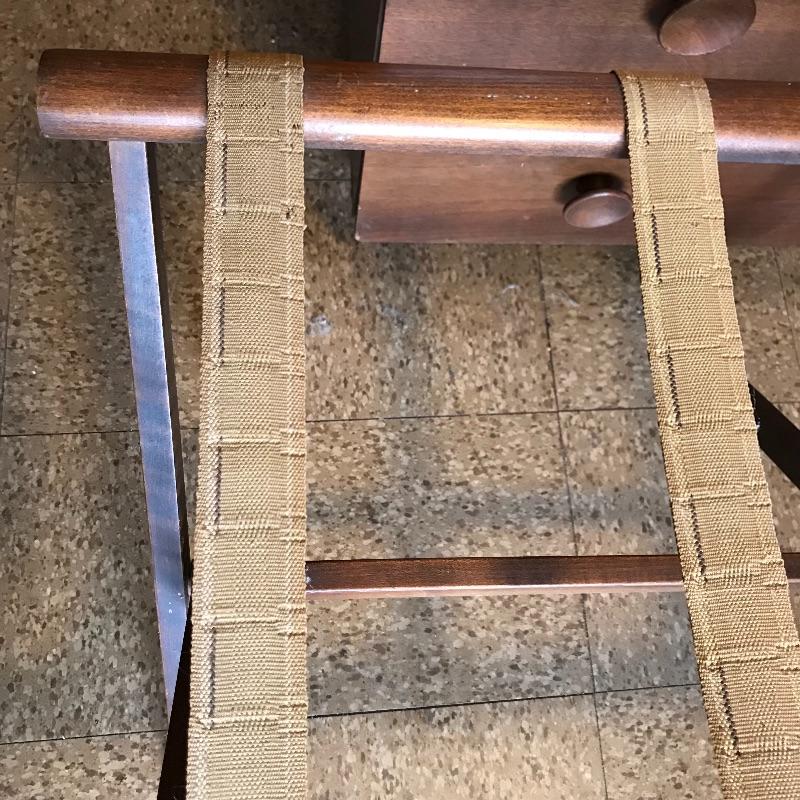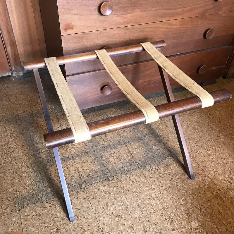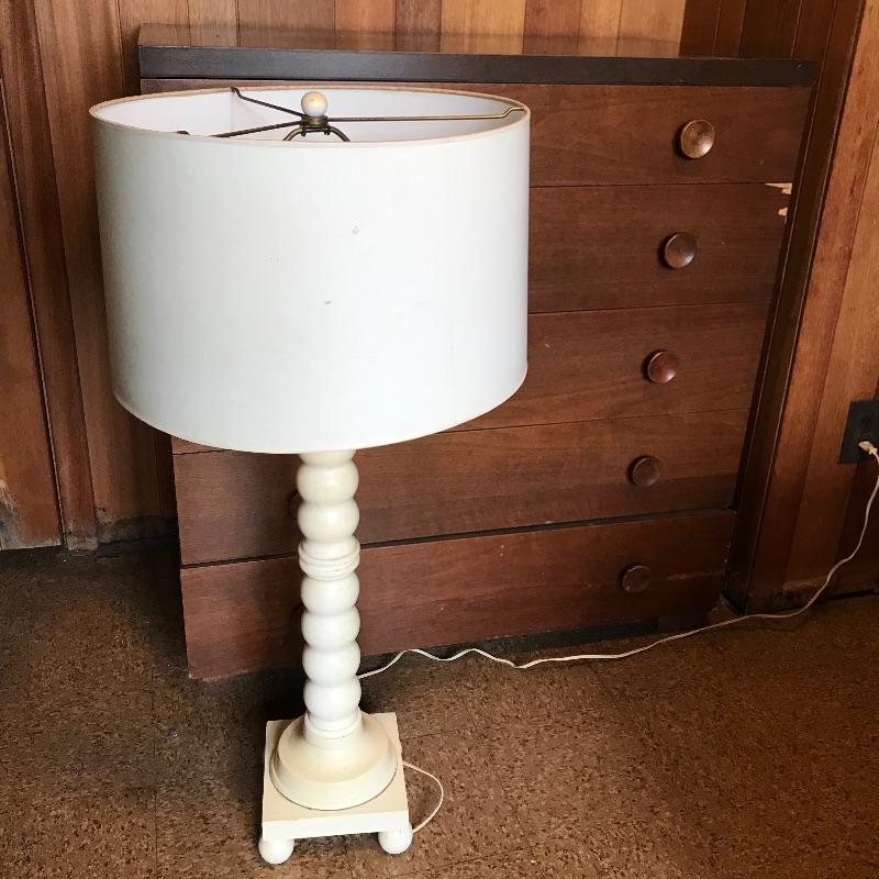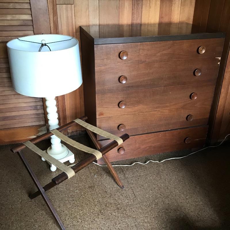 Perfect for your guest room, this MCM style dresser with creamy pink metal drawers. All the pulls are wooden. The dresser is approximately 34.25” x 19.5” x 34.25”, it has some chips in its veneer, see photos. Measuring in just slightly taller than the dresser is this shabby chic white lamp! The lamp is a little stained and it is unclear if a cleaner would work or maybe a paint job to match your needs. Lastly, always convenient, a small wooden luggage rack with canvas style straps. See photos. No shipping.