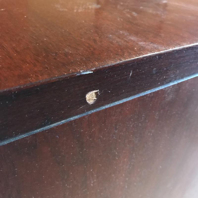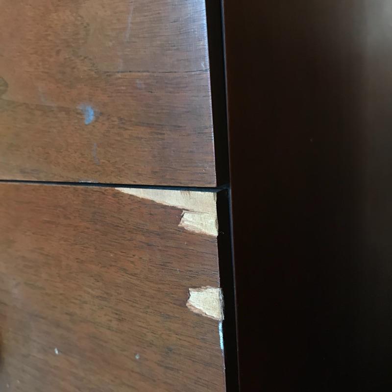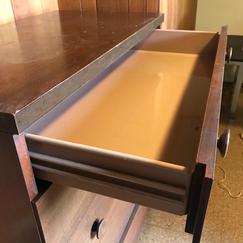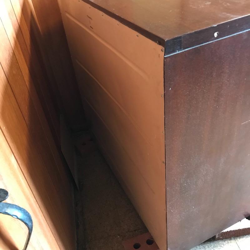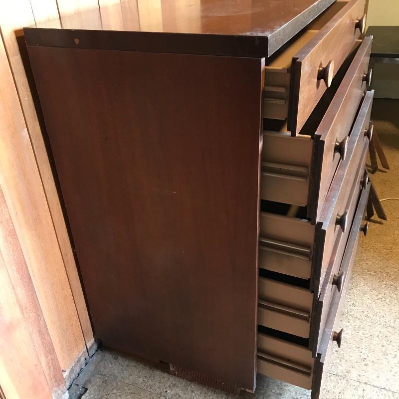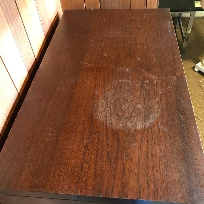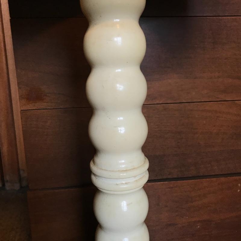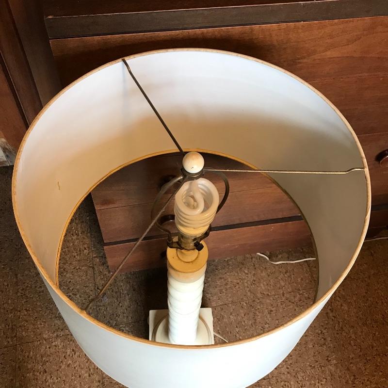 Perfect for your guest room, this MCM style dresser with creamy pink metal drawers. All the pulls are wooden. The dresser is approximately 34.25” x 19.5” x 34.25”, it has some chips in its veneer, see photos. Measuring in just slightly taller than the dresser is this shabby chic white lamp! The lamp is a little stained and it is unclear if a cleaner would work or maybe a paint job to match your needs. Lastly, always convenient, a small wooden luggage rack with canvas style straps. See photos. No shipping.