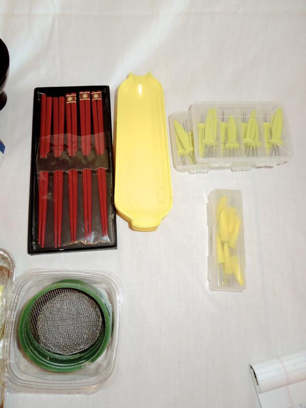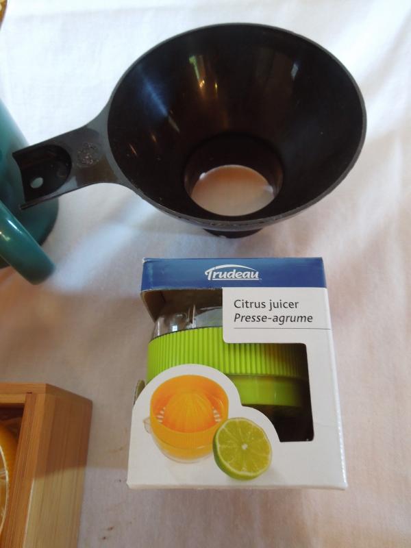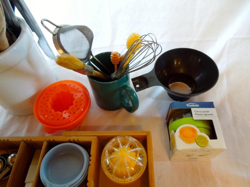 So many great kitchen gadgets including (but not limited to): corn holders; butter keepers; citrus juicers x 2; measuring cups; garlic press; spatulas; tongs; strainers; funnel; gravy separater and a teak adjustable storage tray.