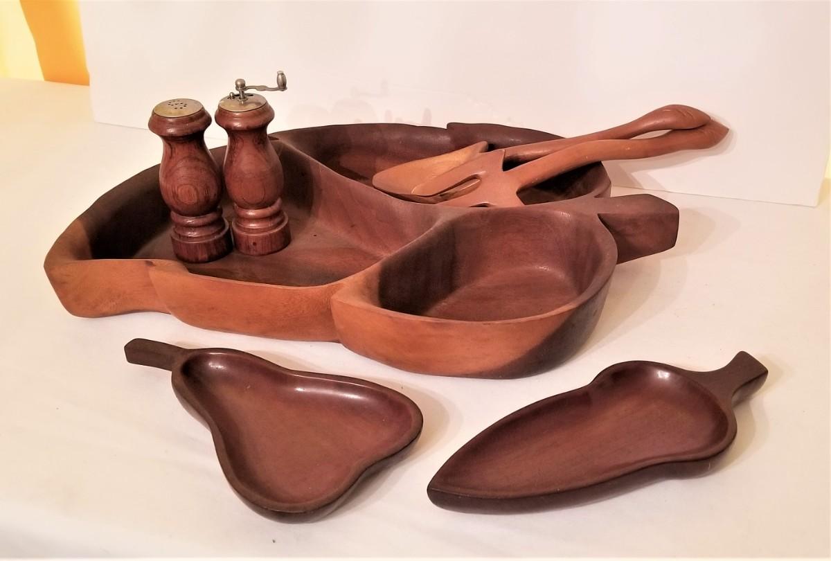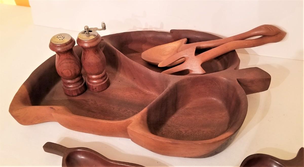 MicCentury "Monkey Wood" lot - late 60's, early 70's. You get all you see here - Salt/pepper, salad tongs, three serving dishes. For scale, the largest is 19" x 12". Good vintage condition.