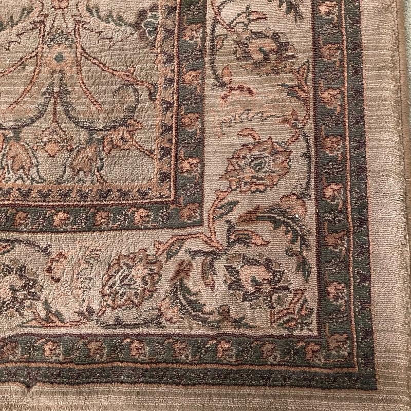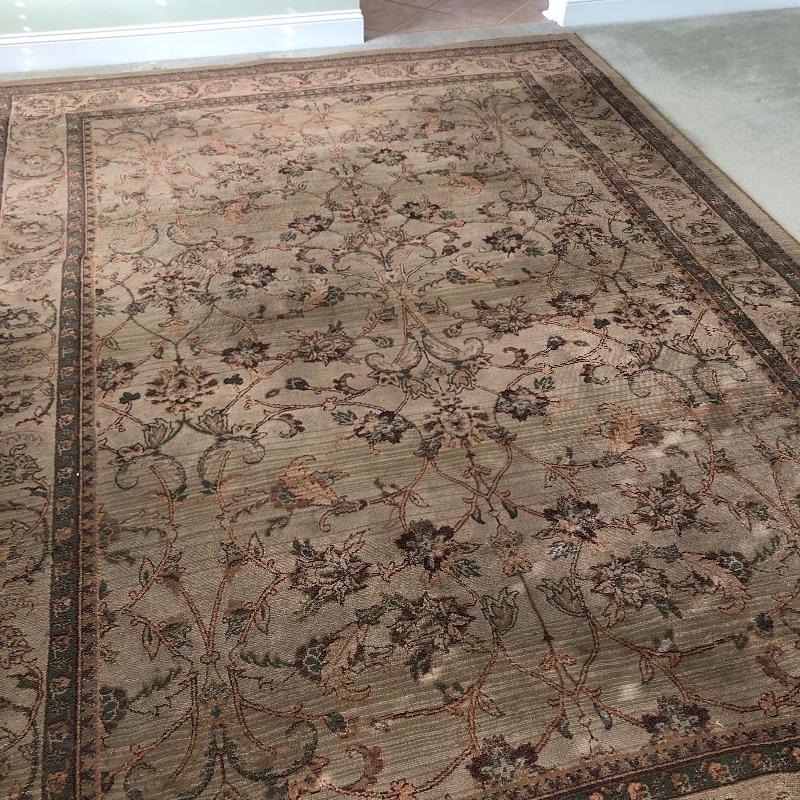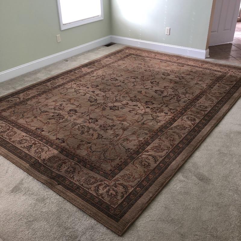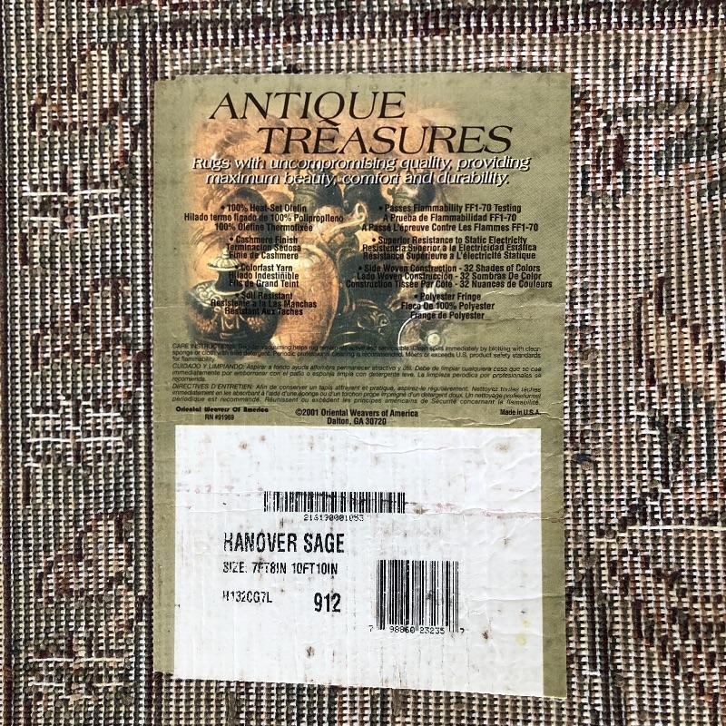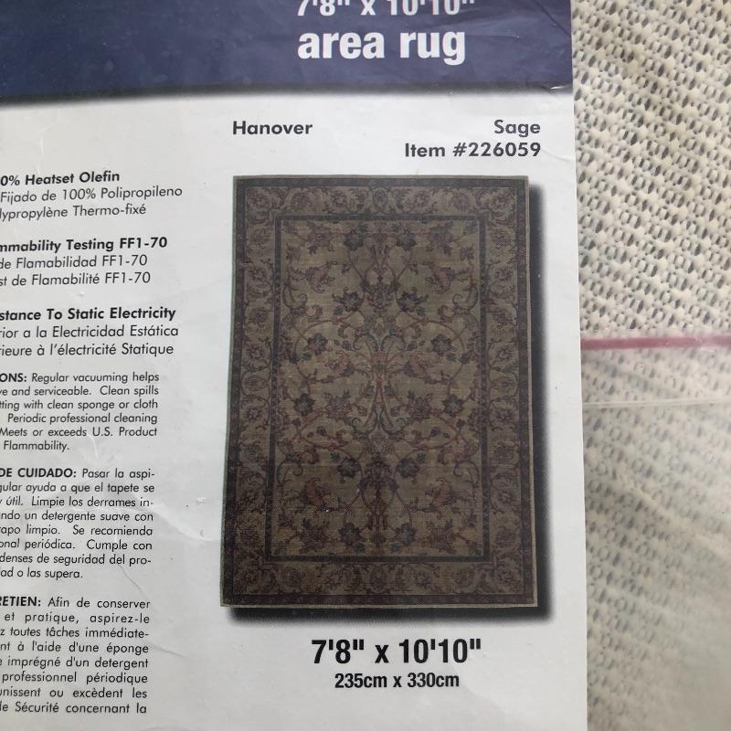 This lot includes an 100% polyester area rug and non-skid mat. The rug is Hanover Sage Style in brown and muted colors and measures 7’8” x 10’10”. Non-skid mat included. Good overall condition. Local pick up only.