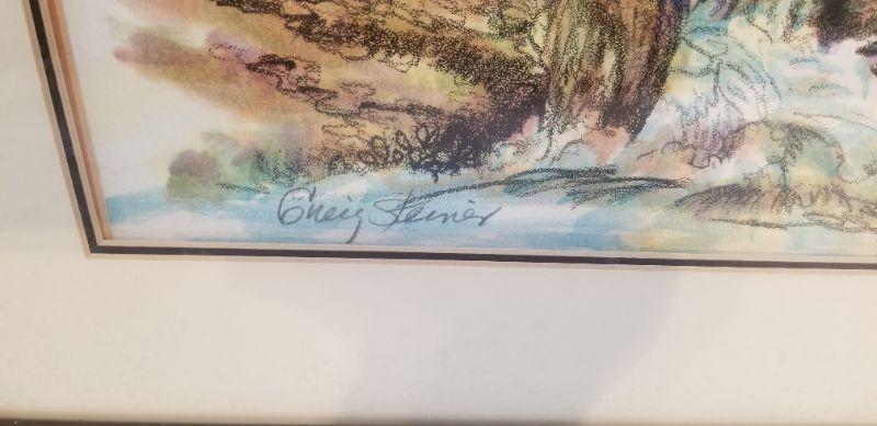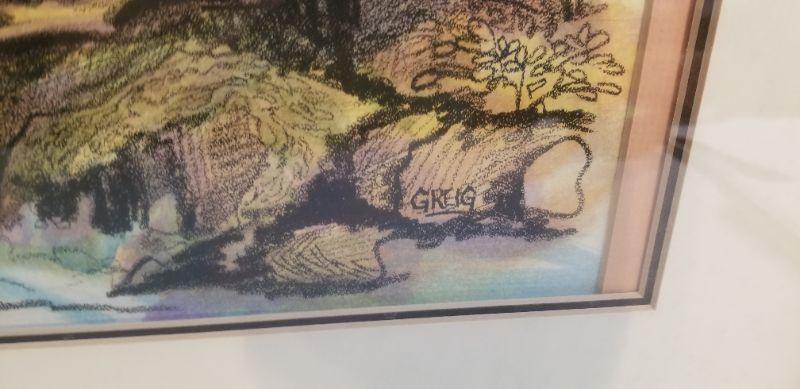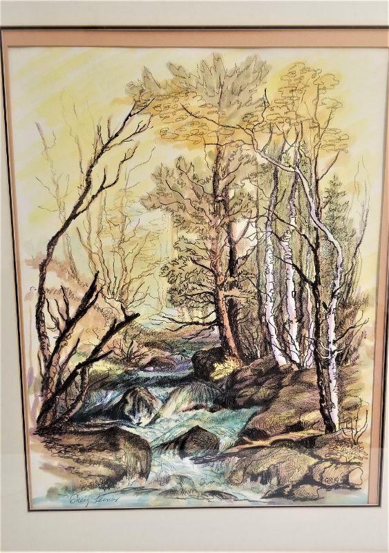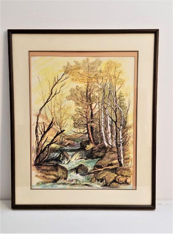 Lovely original woodland/creek scene by well-listed artist Greig Steiner, framed with triple mat, watercolor with charcoal overlay. Measures 23.25" x 28.5". His works of this size and quality usually sell in the 500.00 range.