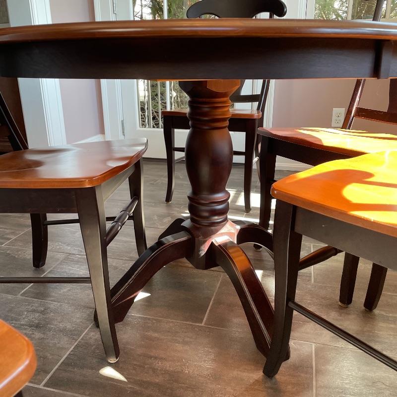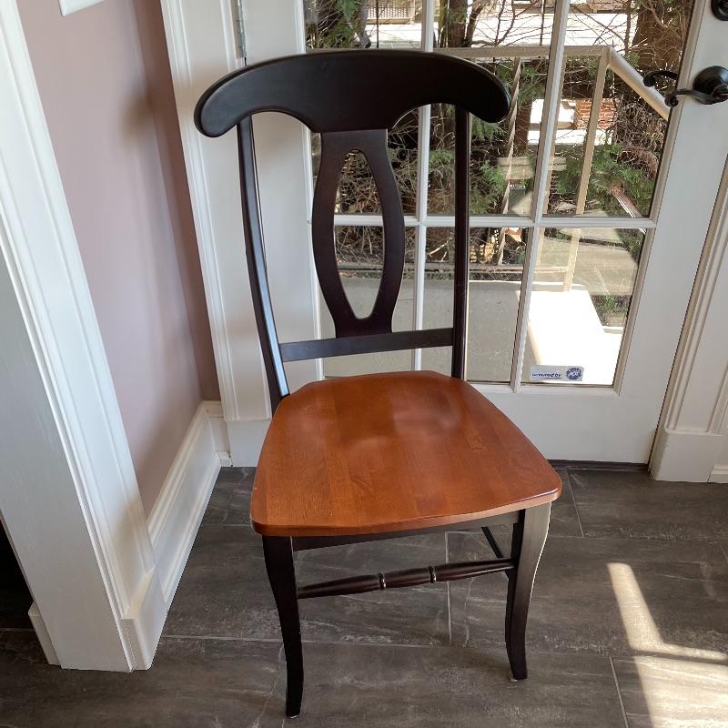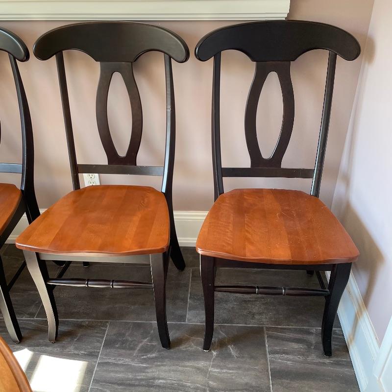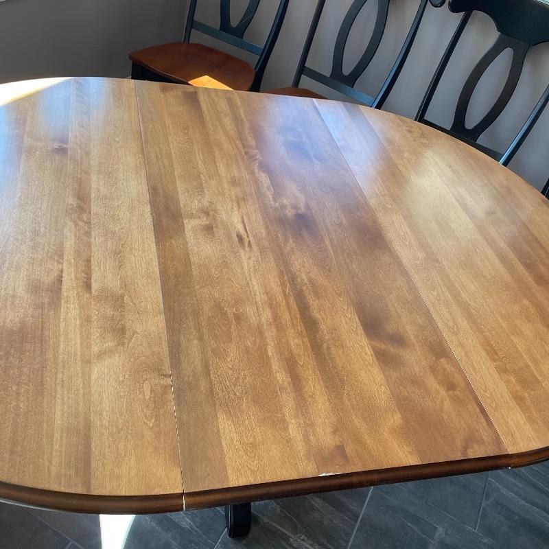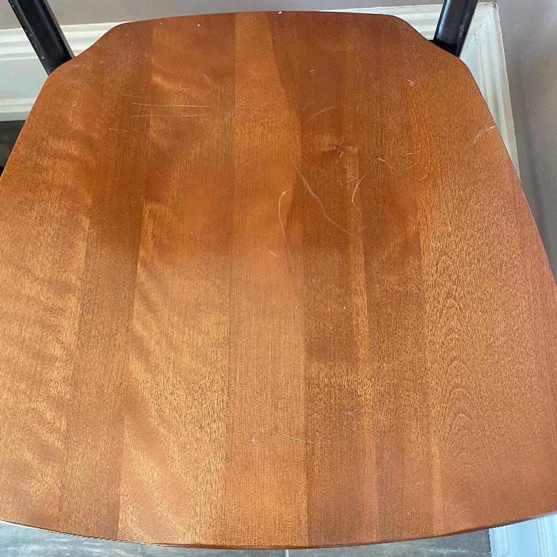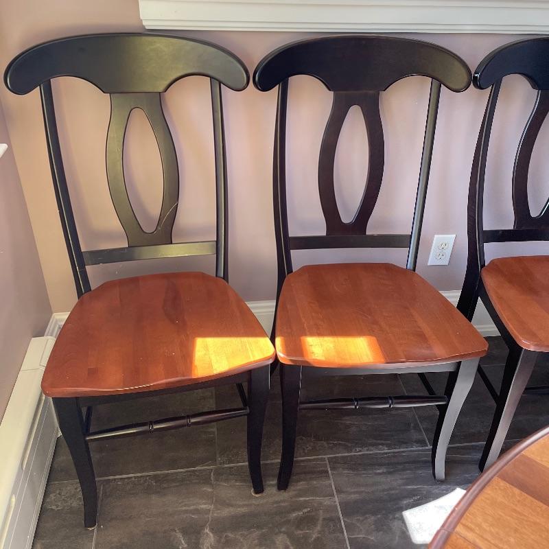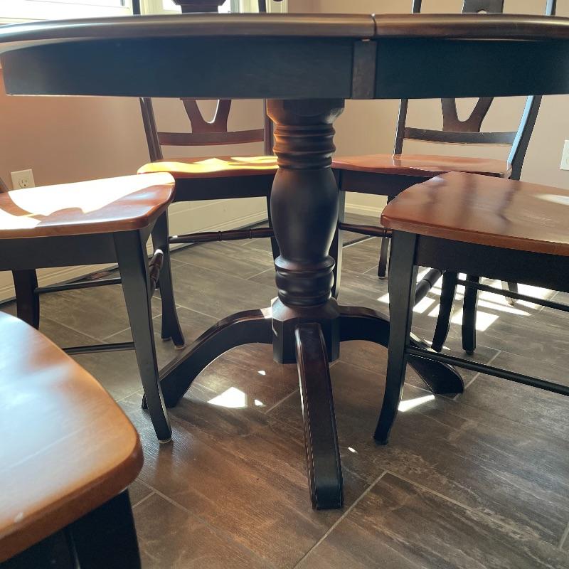 Here’s a great option for a smaller area or need for secondary dining table. This Canadian made table measures approximately 45.5”d x 30” and the leaf will add 20”. The modern chairs complete this sets cool look. The chairs have some blemishes and scratch and a couple seats are a little loose, but they are attached with screws and it might be an easy fix. See images, Table is large so you will want to bring help to load. Located on main level, four steps out. local pick up only.