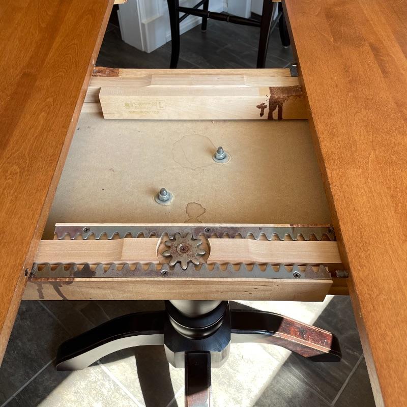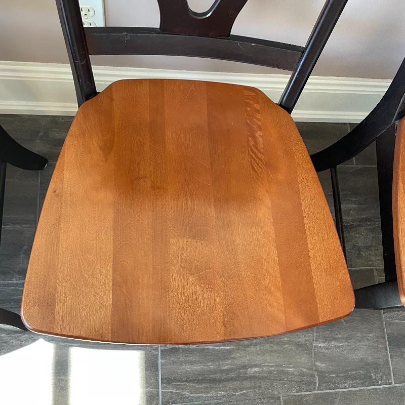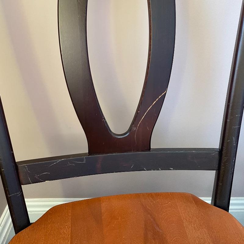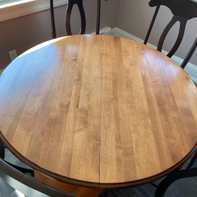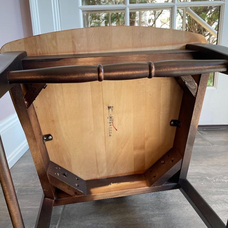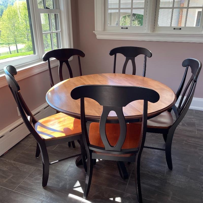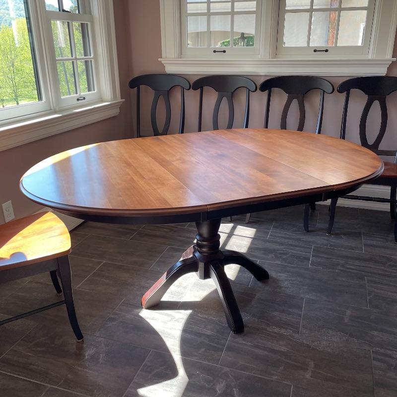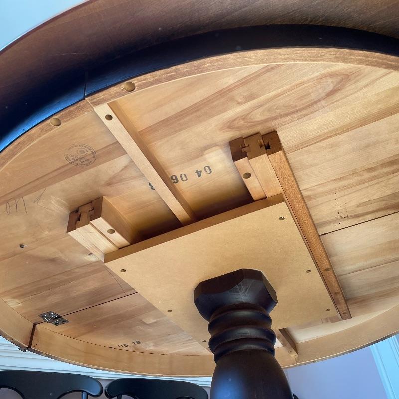 Here’s a great option for a smaller area or need for secondary dining table. This Canadian made table measures approximately 45.5”d x 30” and the leaf will add 20”. The modern chairs complete this sets cool look. The chairs have some blemishes and scratch and a couple seats are a little loose, but they are attached with screws and it might be an easy fix. See images, Table is large so you will want to bring help to load. Located on main level, four steps out. local pick up only.