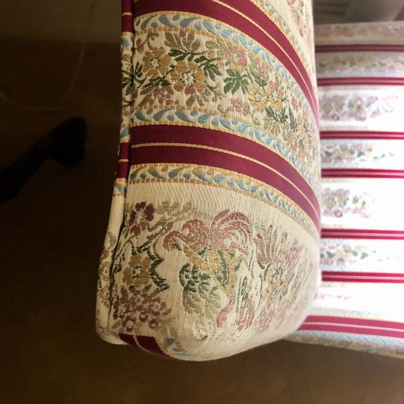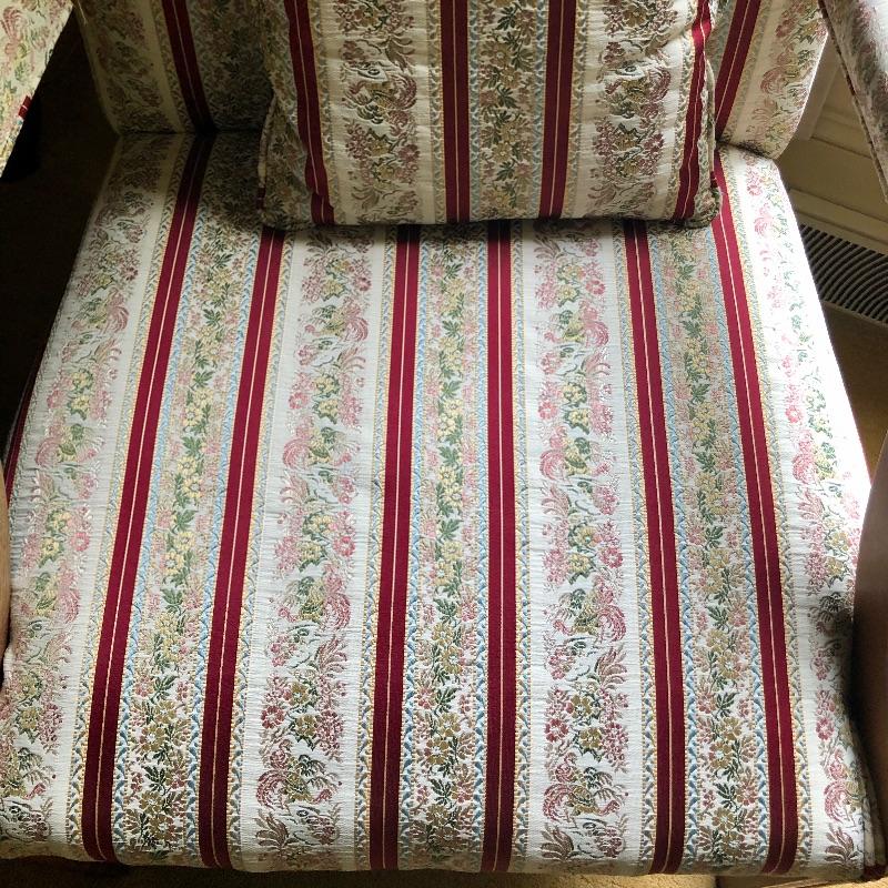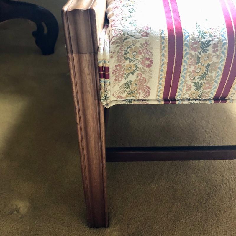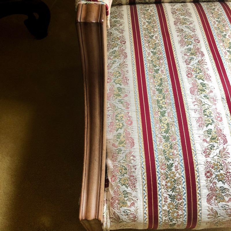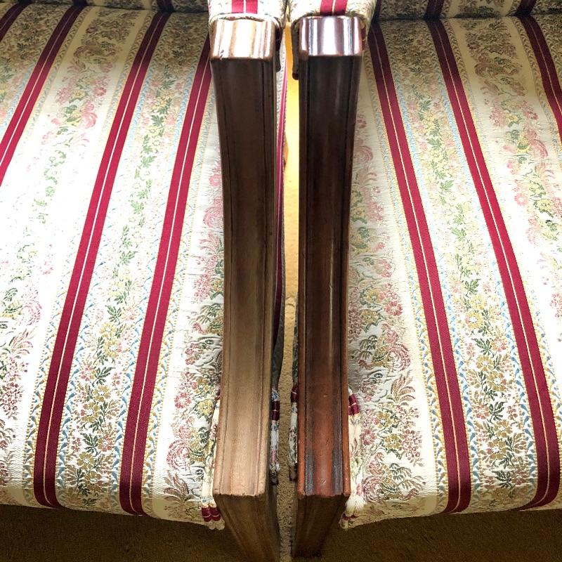 This antique pair of high back chairs appear to have been recently reupholstered as the fabric is impeccable. This pair will add opulent elegance to any room! The wood is uniformly lighter on the chair pictured on the left and one of the images highlights this. Please note there is only one accent cushion and the chair with the darker wood appears to have issues with the webbing in the seat area; in other words, the cushioned seat has sunk. It can easily be accessed from underneath to repair it.