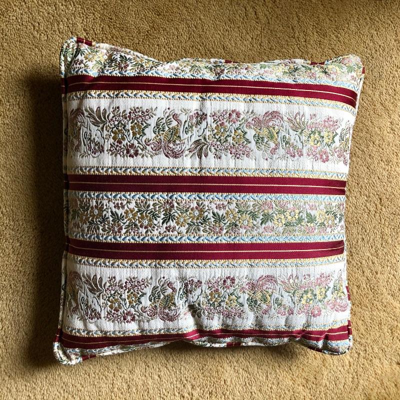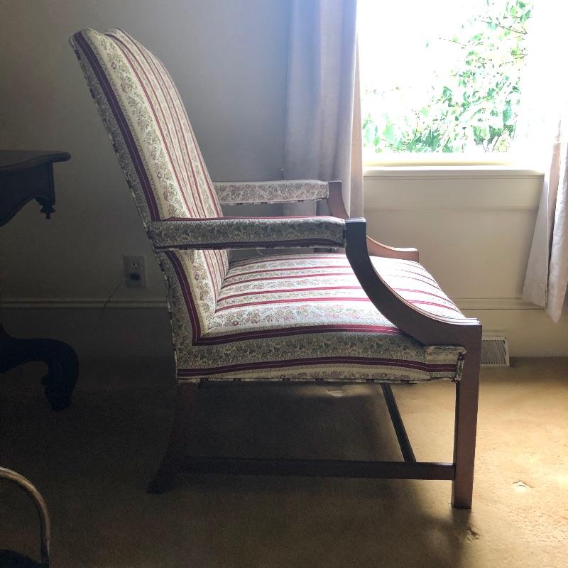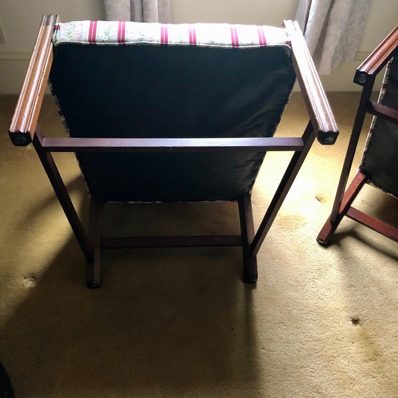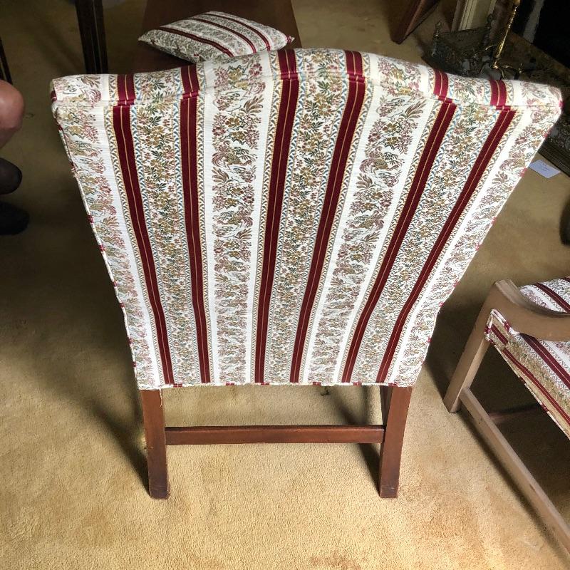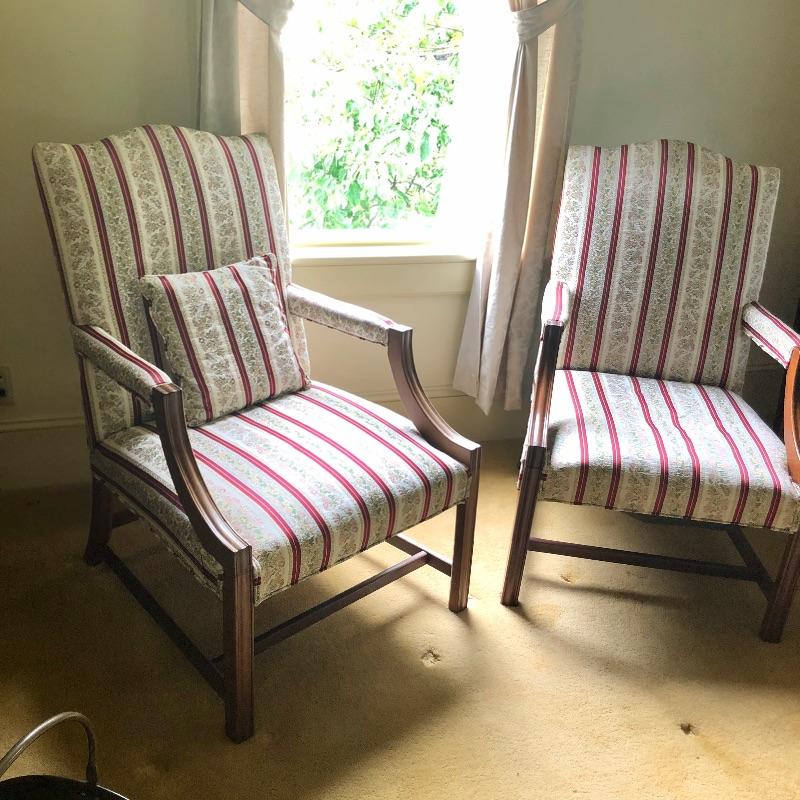 This antique pair of high back chairs appear to have been recently reupholstered as the fabric is impeccable. This pair will add opulent elegance to any room! The wood is uniformly lighter on the chair pictured on the left and one of the images highlights this. Please note there is only one accent cushion and the chair with the darker wood appears to have issues with the webbing in the seat area; in other words, the cushioned seat has sunk. It can easily be accessed from underneath to repair it.