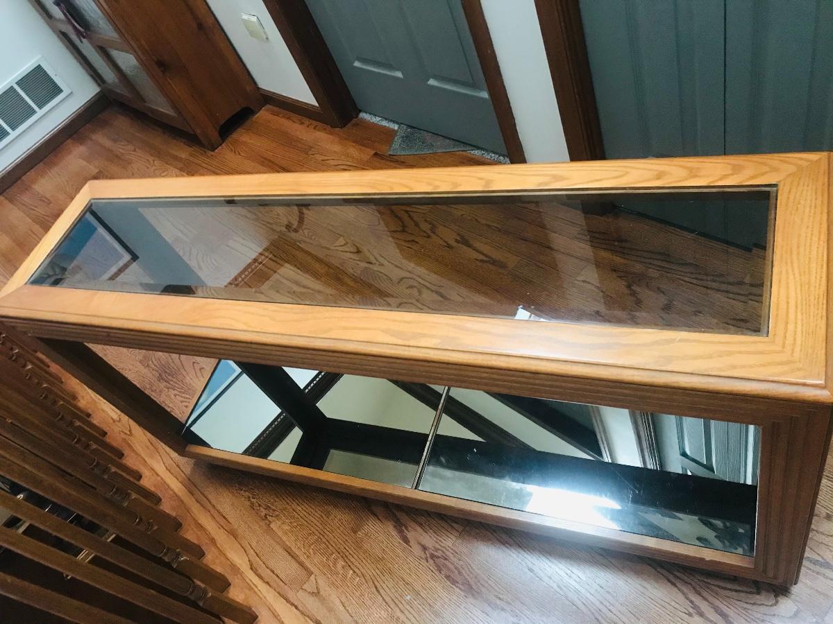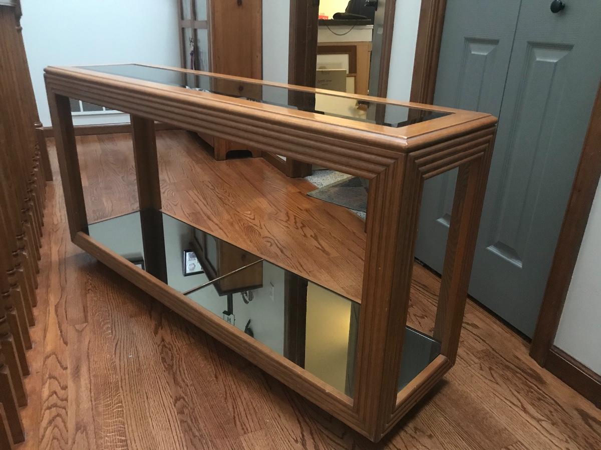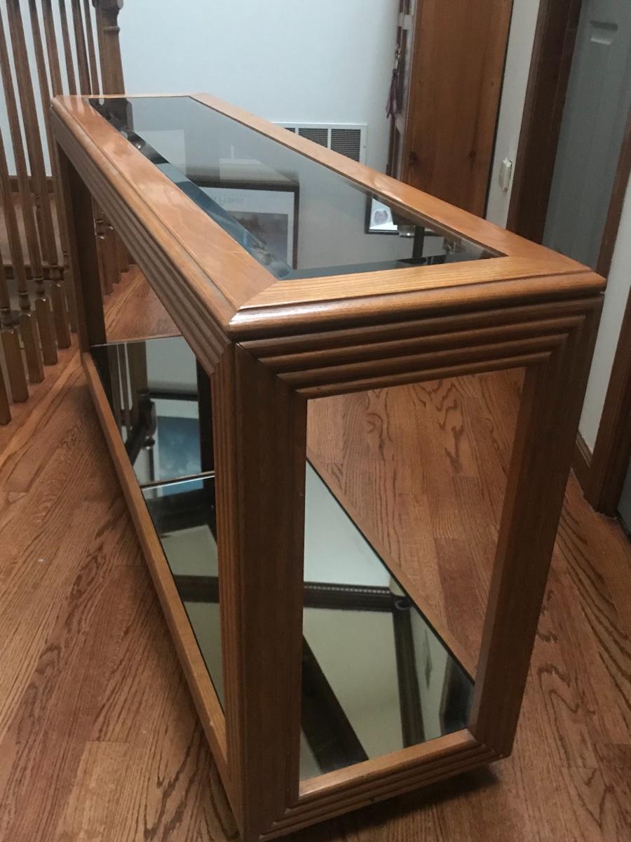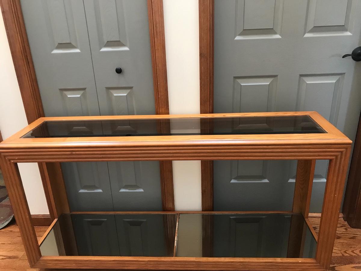 Wooden sofa/entry table with smoked glass top and a mirror shelf. 55x14x27