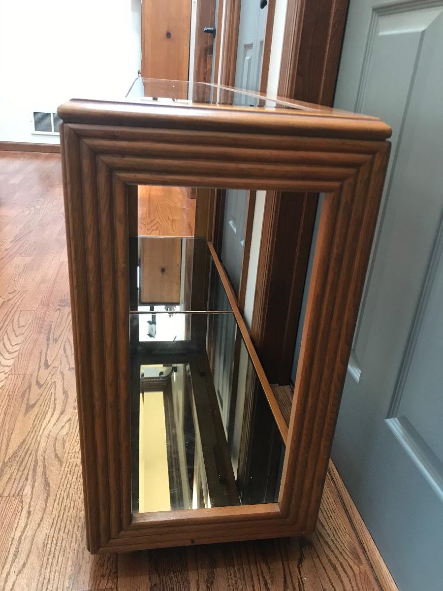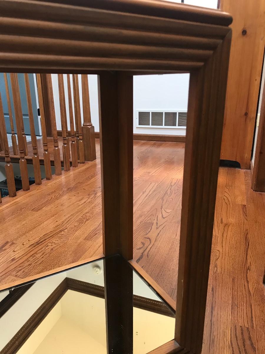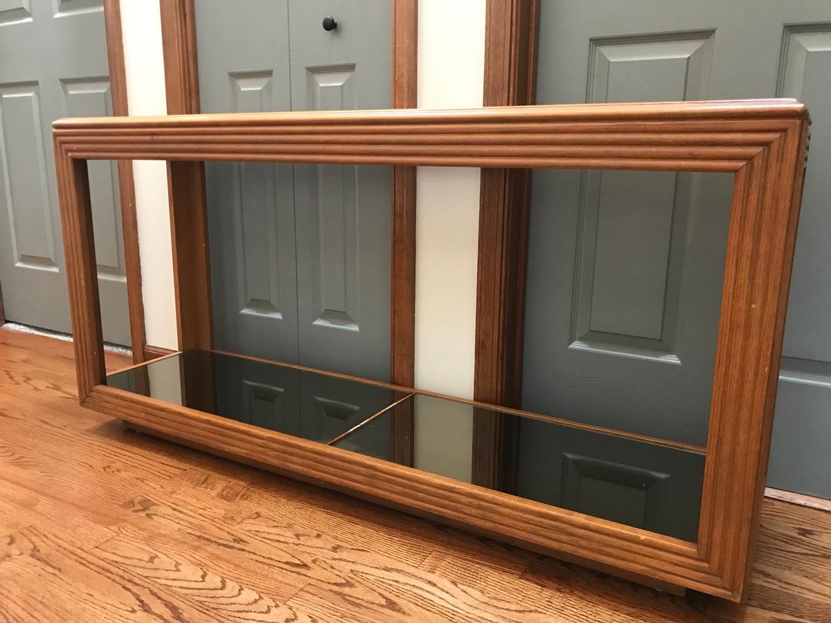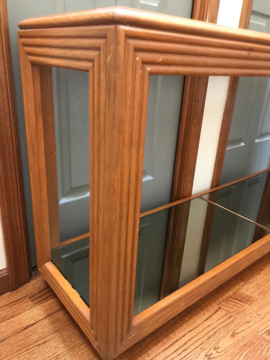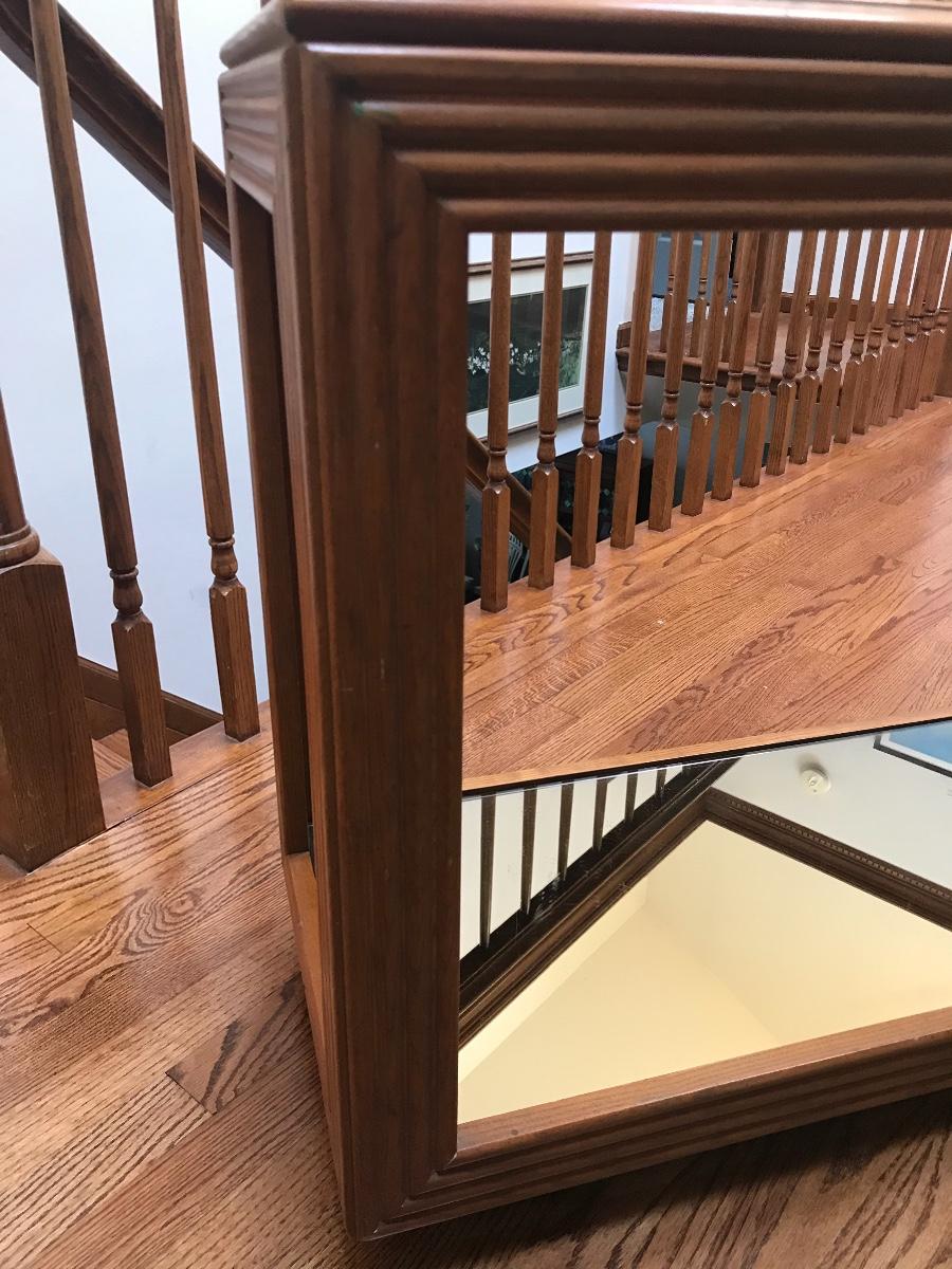 Wooden sofa/entry table with smoked glass top and a mirror shelf. 55x14x27