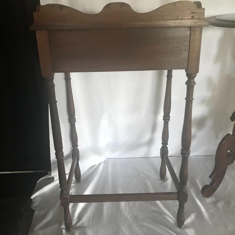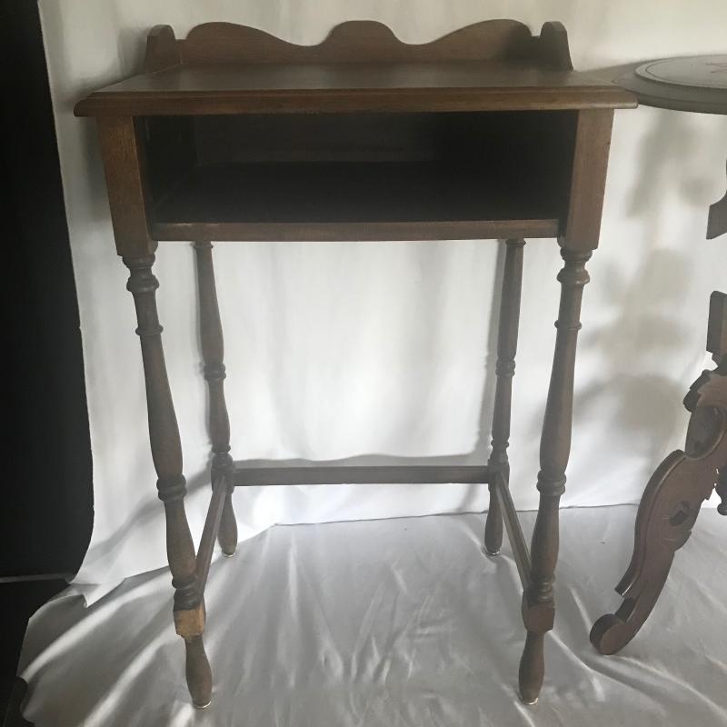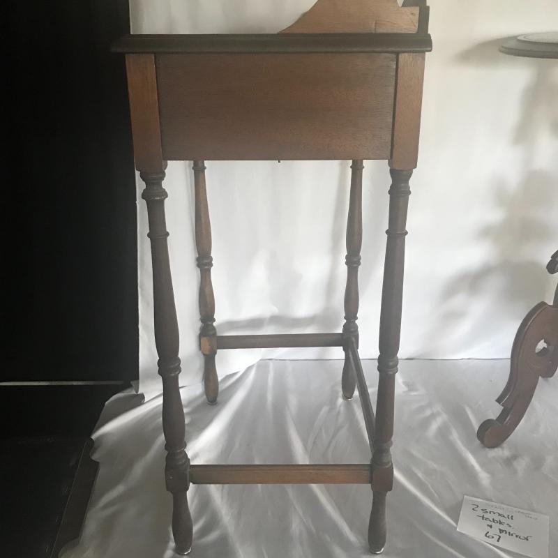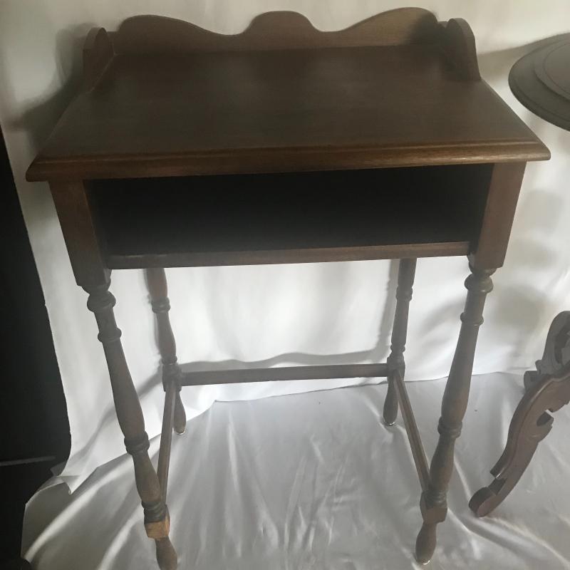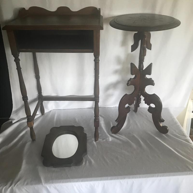 “Old Mahogany” writing desk or wash stand measures 14” x 20” x 32”. Round top table has ornate legs and appears to be mahogany also. Mirror measures 15” x 11”. Local pick up only.