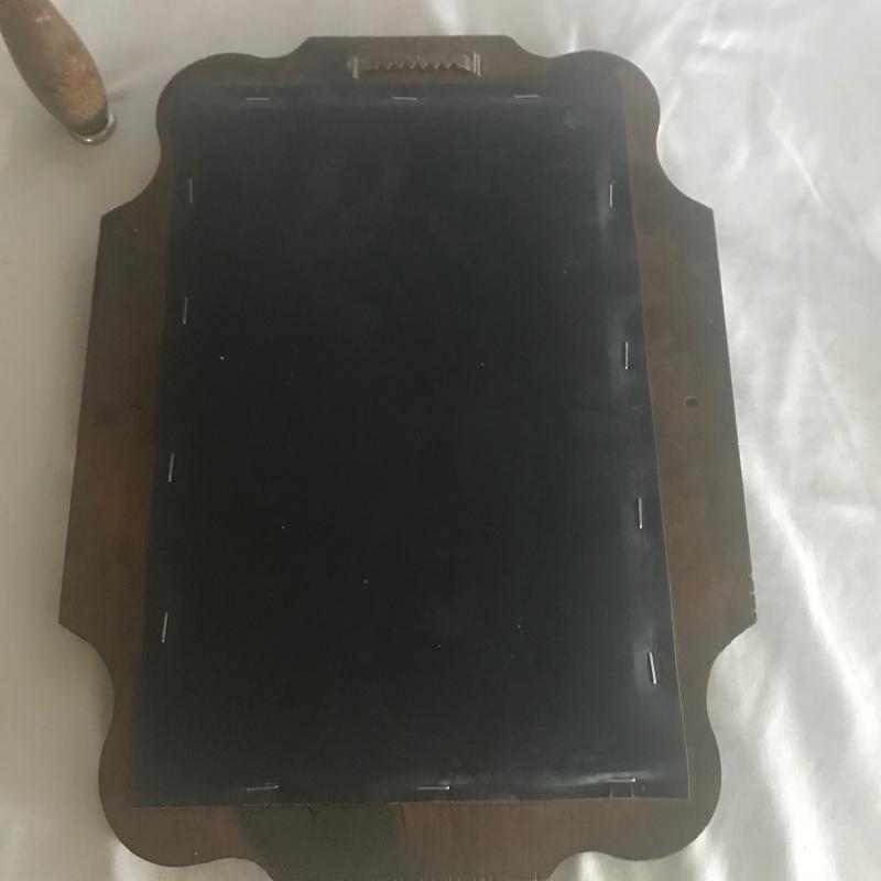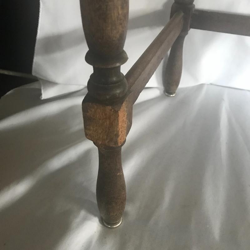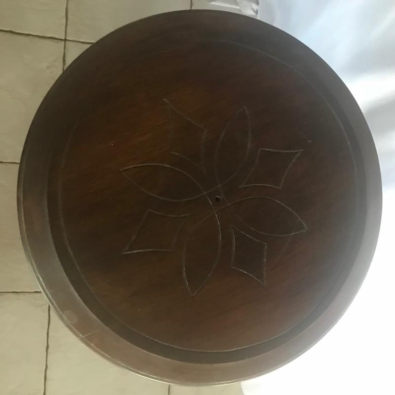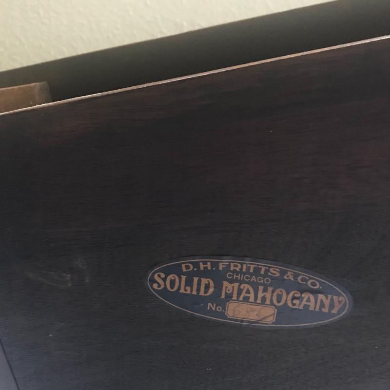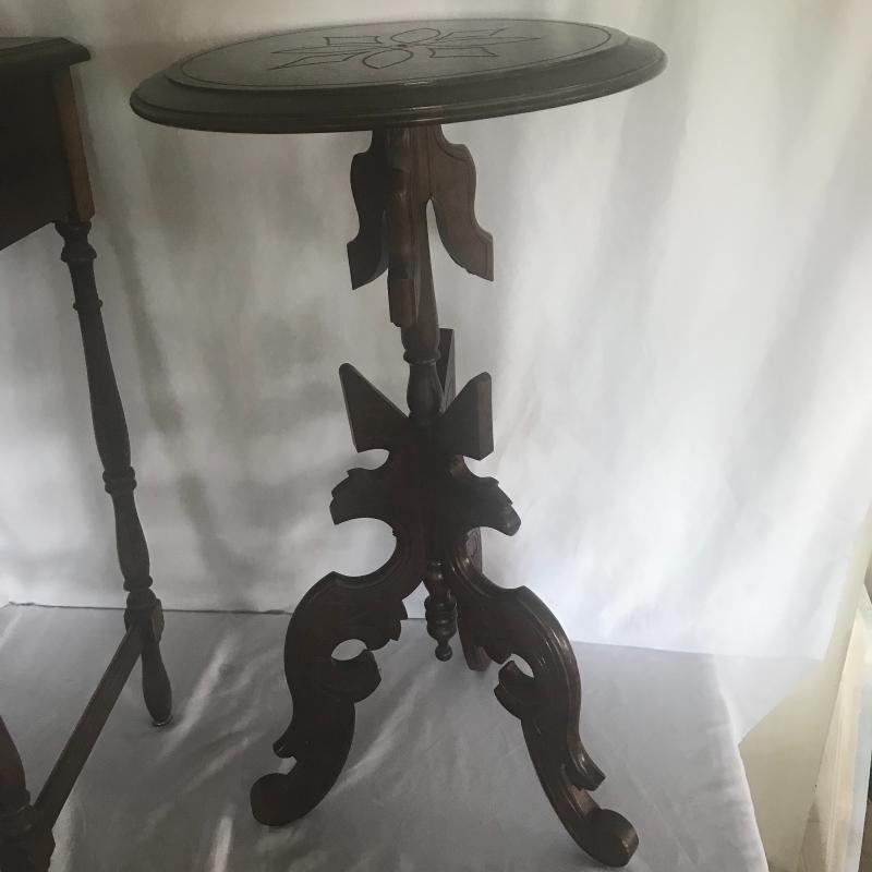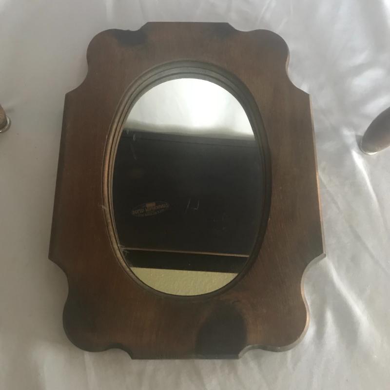 “Old Mahogany” writing desk or wash stand measures 14” x 20” x 32”. Round top table has ornate legs and appears to be mahogany also. Mirror measures 15” x 11”. Local pick up only.