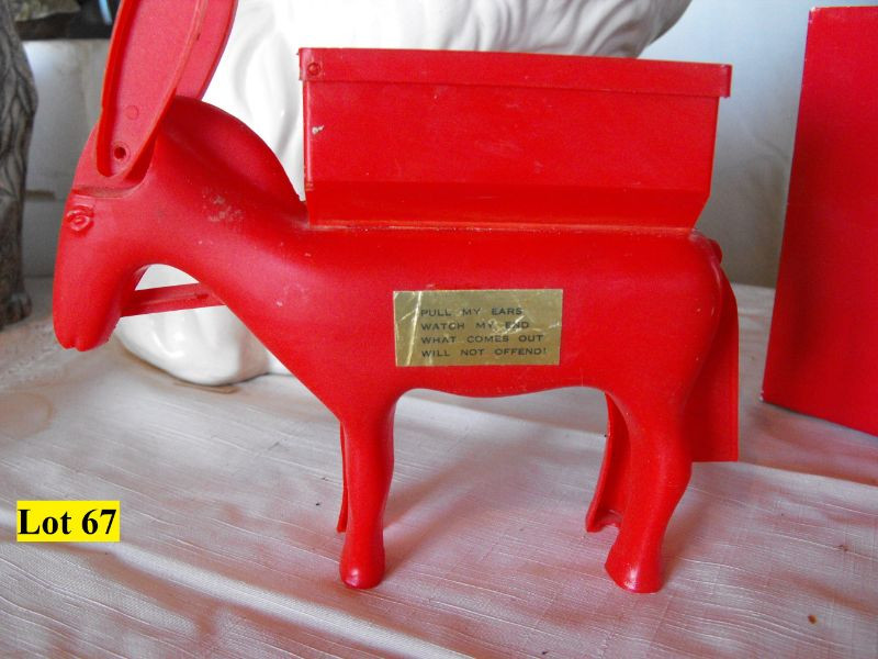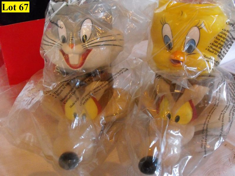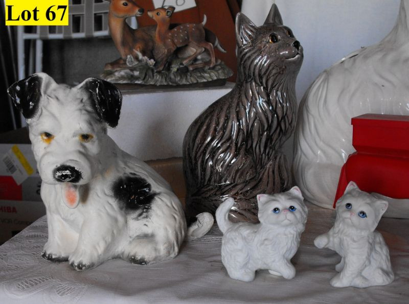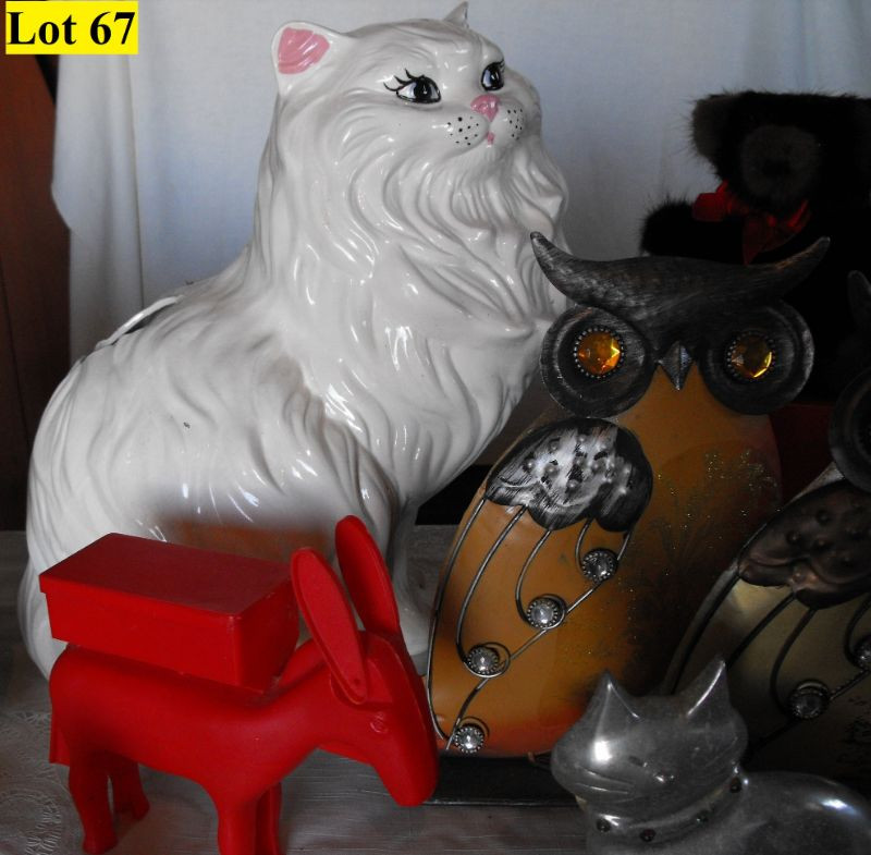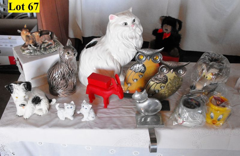 Ceramic Cats, Chalk Ware Dog, Mink Teddy Bear, Tin Owls, 4 Looney Tunes Cups (2 Road Runner, Tweety Bird and Bugs Bunny), Plastic Donkey that Dispenses ??