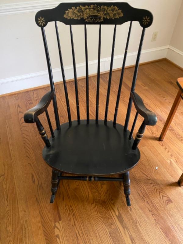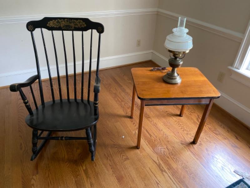 Lot # 67 Vintage Bent & Bros. Hitchcock Style Rocking Chair with table and lamp