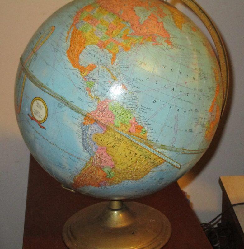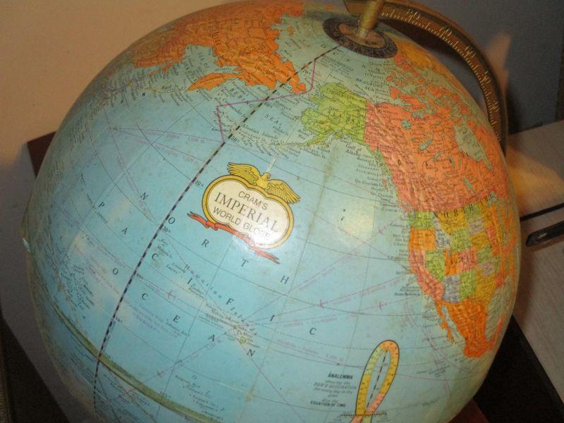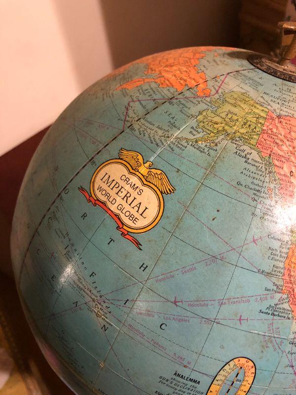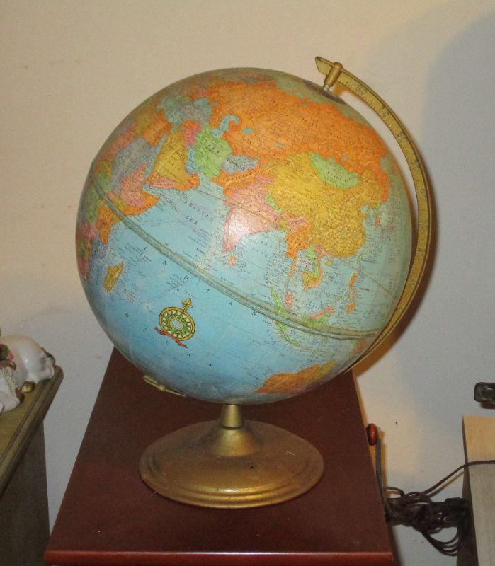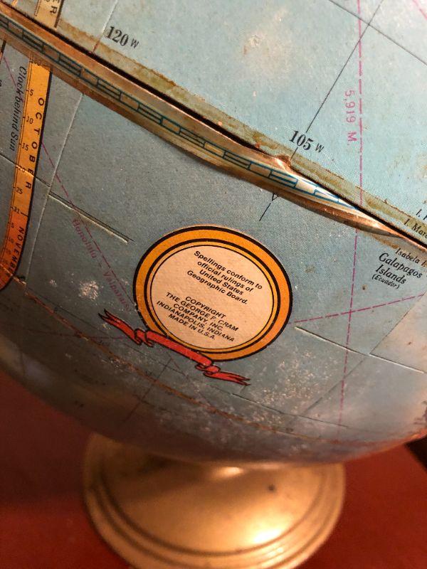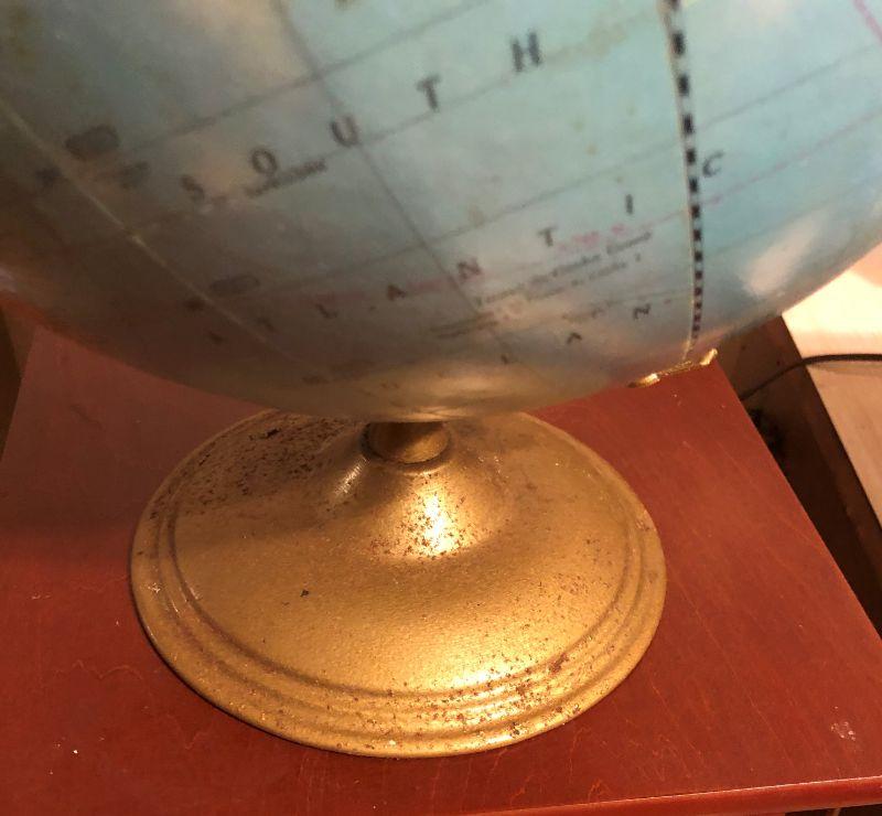 The main issue with the globe is the equator tape is loose and there is a little discoloration on the base. It stands about 18" tall.