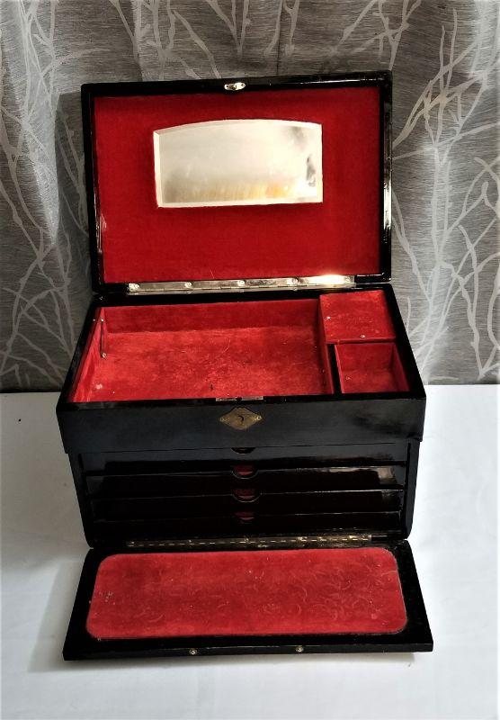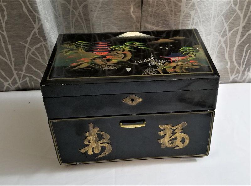 Typical vintage souvenir jewelry box that a serviceman would bring home to his wife or sweetheart after a tour in Japan. Painted lid featuring Mt. Fuji. No key. This is musical and does not appear to be overwound, but the music isn't playing. 4 drawers, lots of storage. Measures 9" tall, 12.5" across, and 8.5" deep. Used condition.