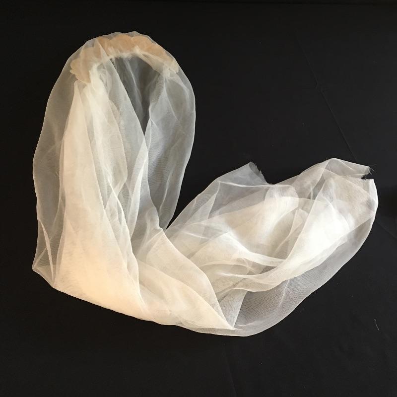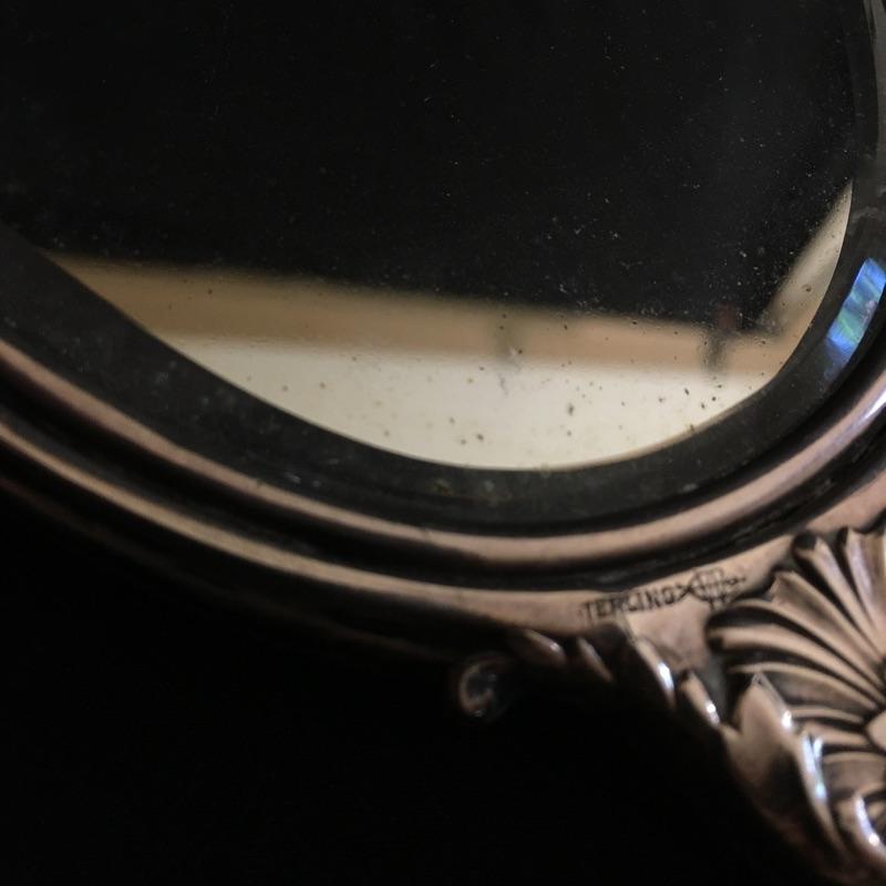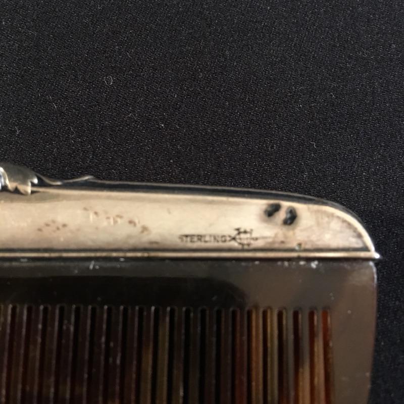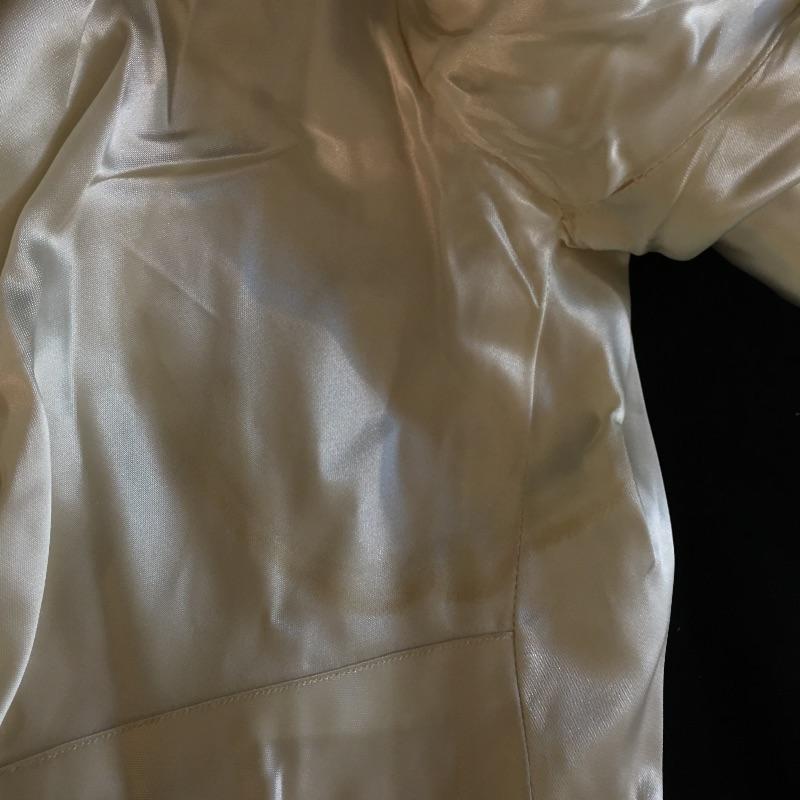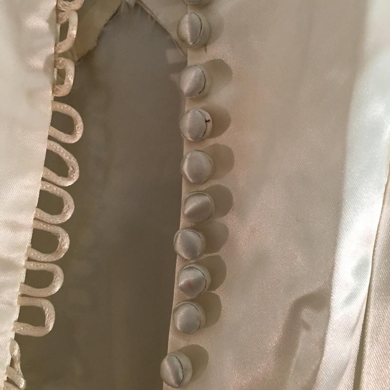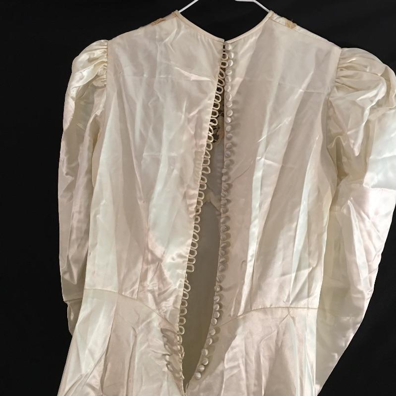 Have that classic vintage look on your wedding day with this vintage wedding dress complete with veil! This stunning piece has a lace front and a plethora of buttons on the back. Lot also includes Sterling vanity set with the initial RGS on each piece, each piece is marked sterling. Dress measures shoulder 14.5” across, chest 17” across, waist 18” across, front length 60” and back length 82”. Dress has small stain on front, see pictures.