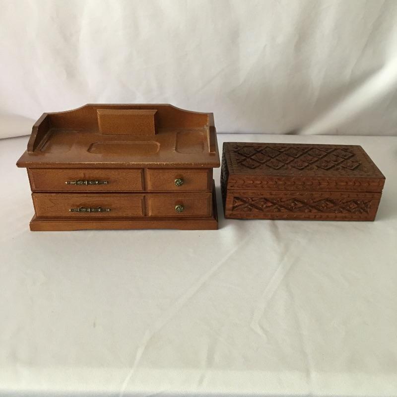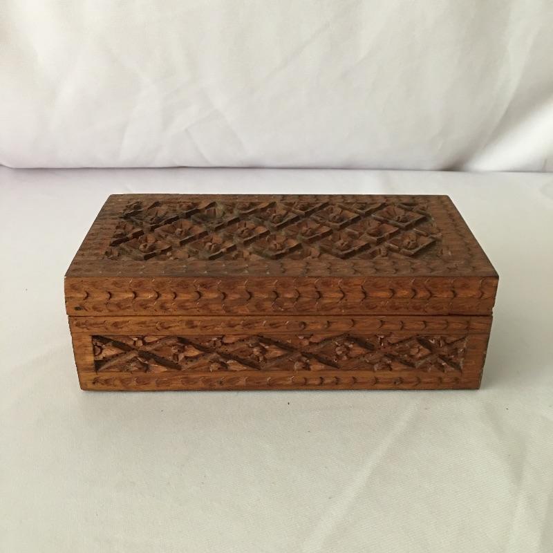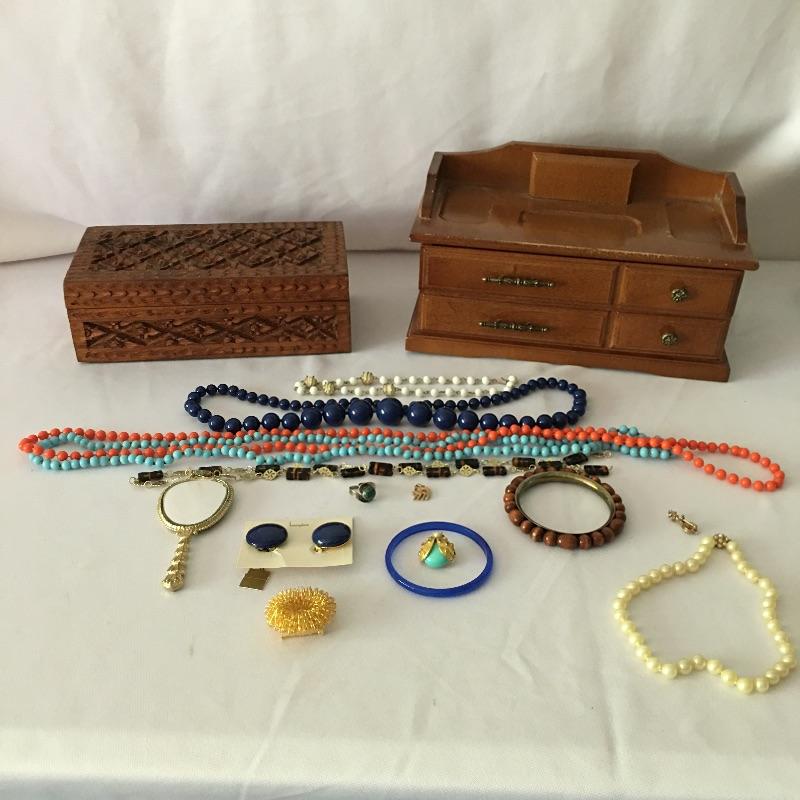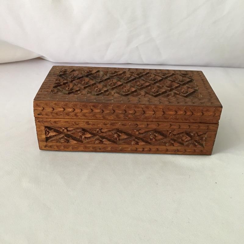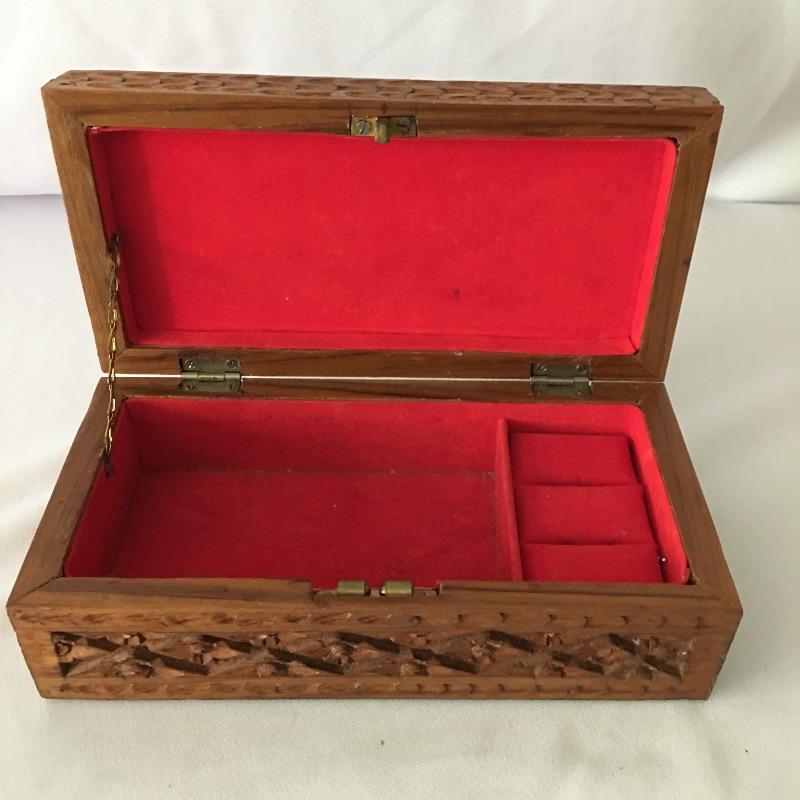 Wooden box and jewelry. Lot includes carved wooden jewelry box, wooden jewelry box, an adjustable Turquoise colored ring that has illegible marks, ladybug pin, beaded necklace, plastic bracelets and what appears to be a pearl necklace. Largest box measures 5.75” x 11.75” x 6.25”.
