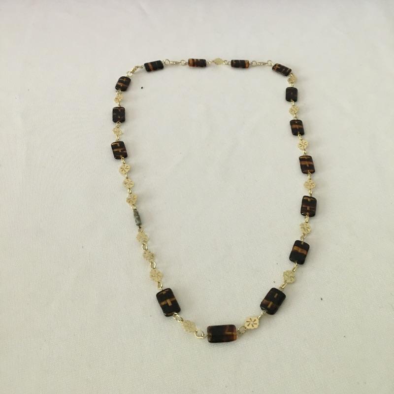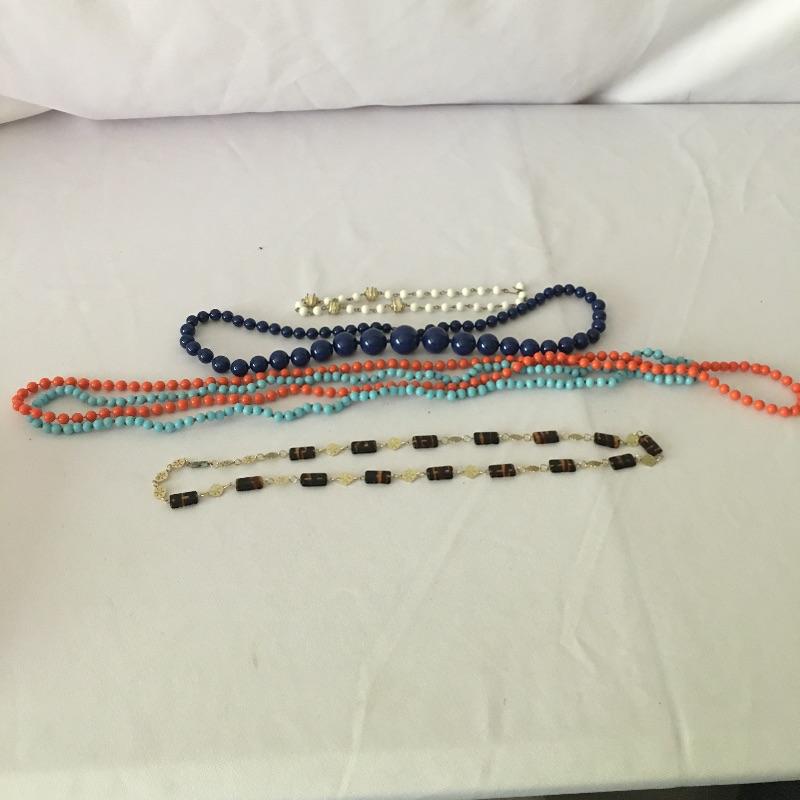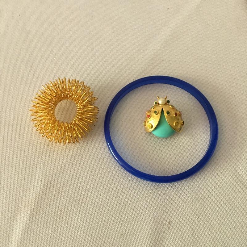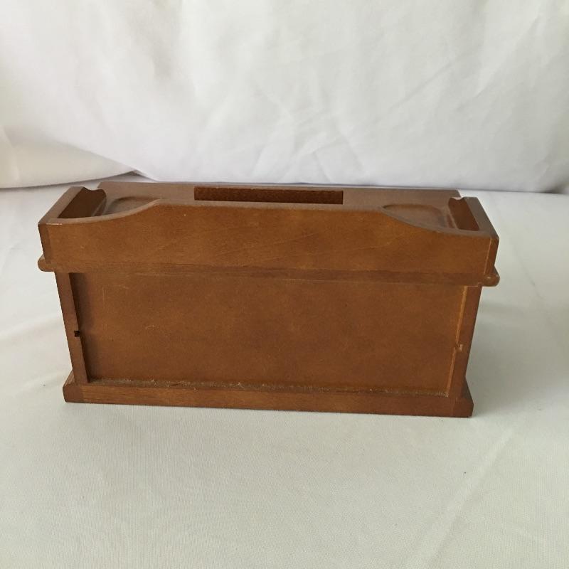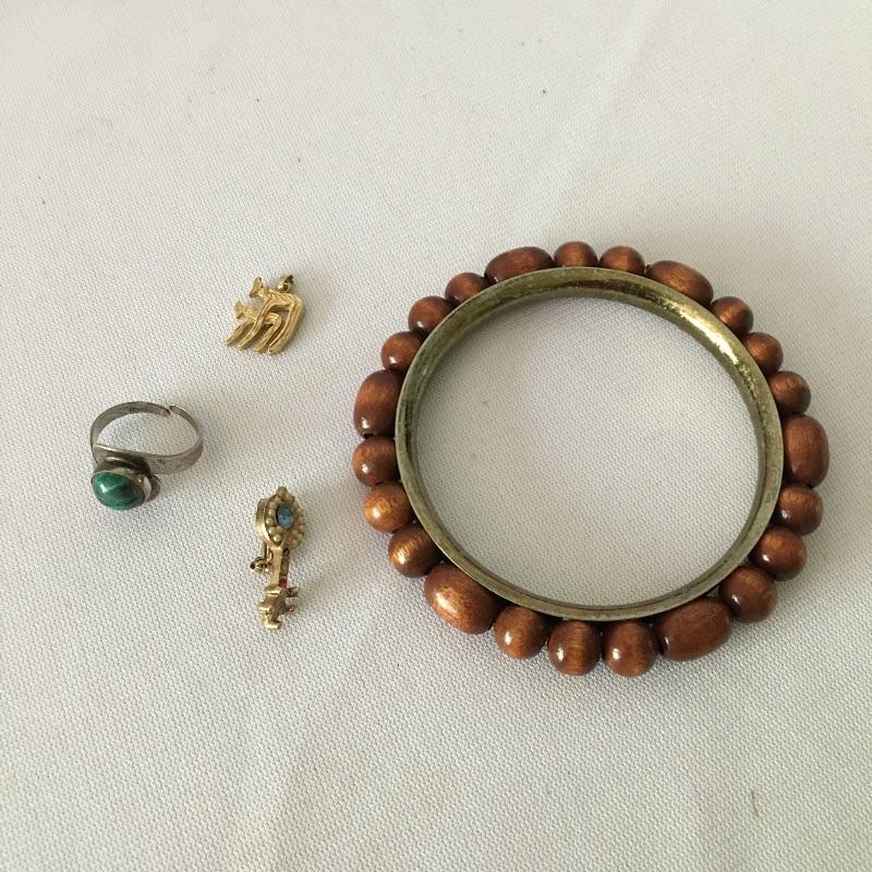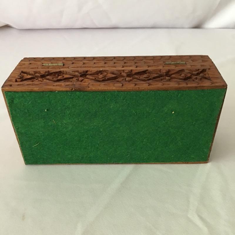 Wooden box and jewelry. Lot includes carved wooden jewelry box, wooden jewelry box, an adjustable Turquoise colored ring that has illegible marks, ladybug pin, beaded necklace, plastic bracelets and what appears to be a pearl necklace. Largest box measures 5.75” x 11.75” x 6.25”.