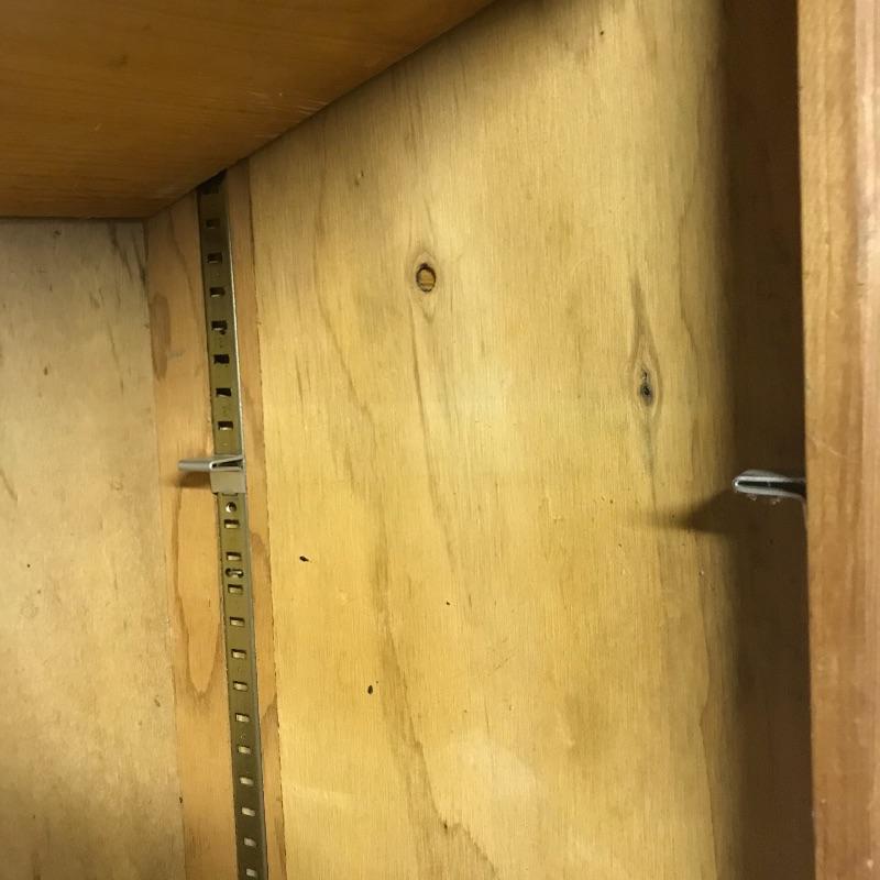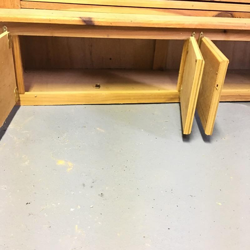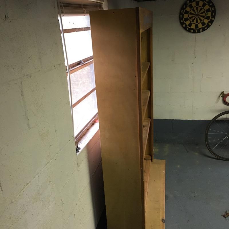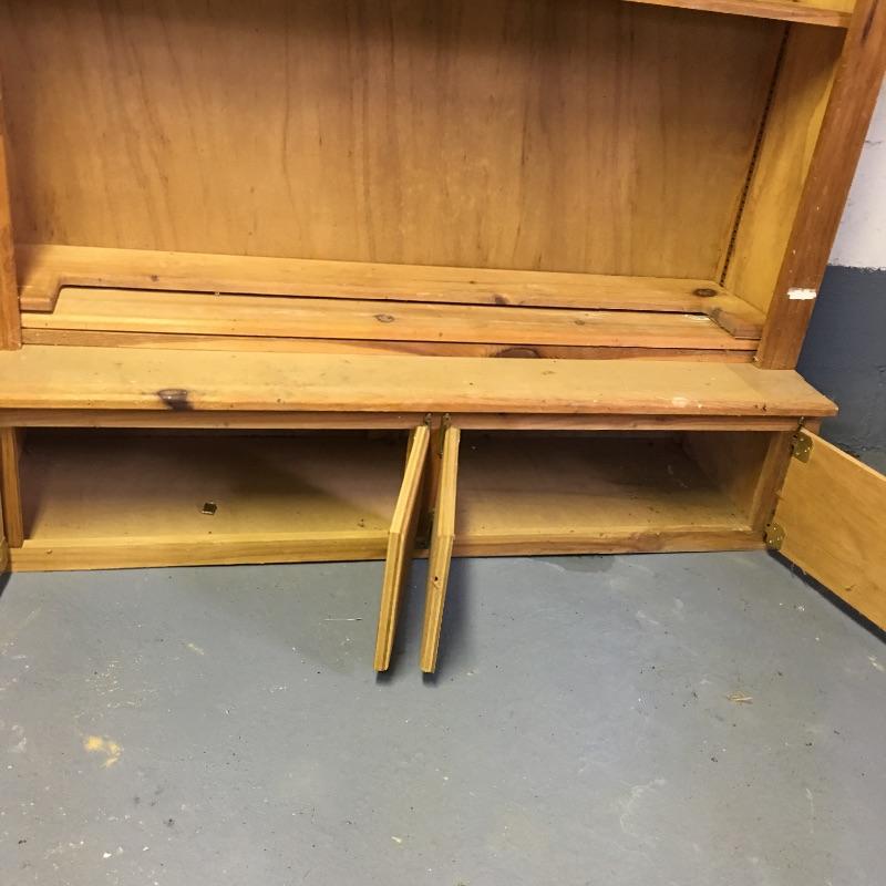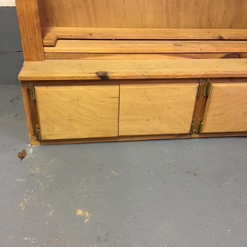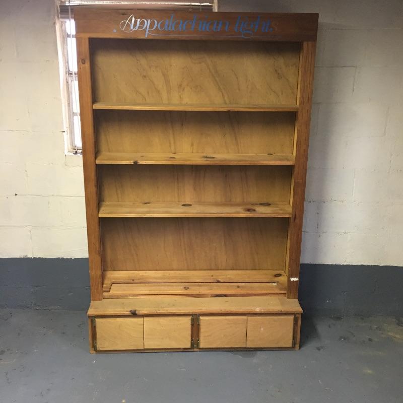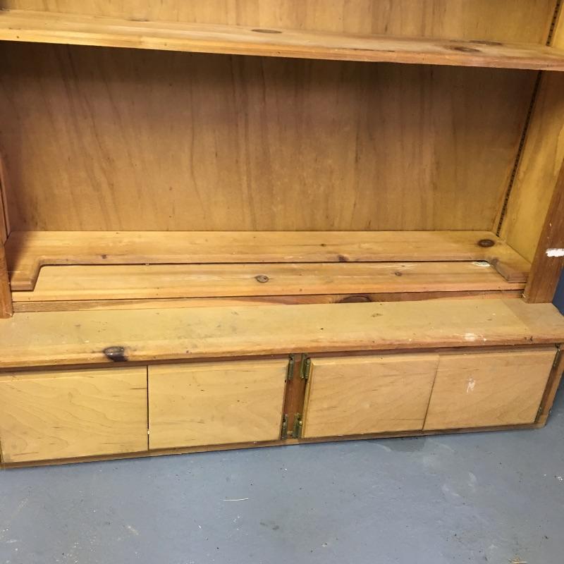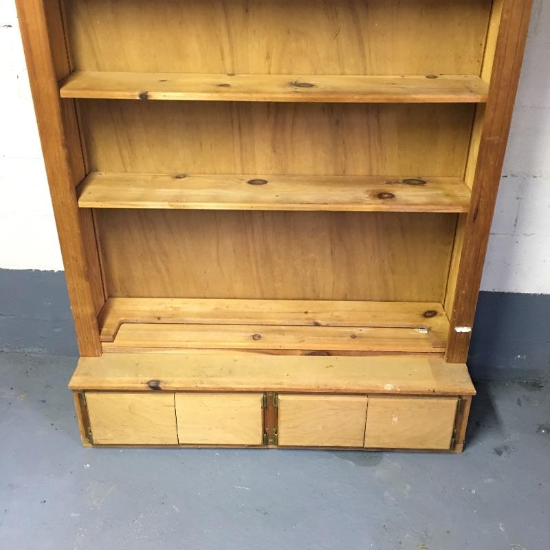 This practical wooden shelving unit with cabinet underneath will be a great addition to your home. Unit has three adjustable shelves with two full and one half extra shelves that will just need clips to add them to shelving unit, see clip style in photos. Shelving unit is mostly solid wood with its sides and backing plywood. Piece measures 16” x 48” x 73”.