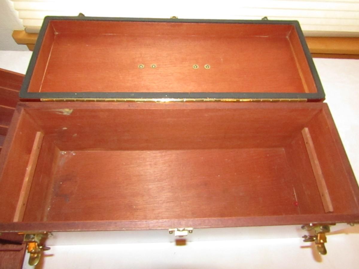CANVAS ZIPPERED CASE PROTECTS THIS BEAUTIFUL WOODEN TACKLE BOX THAT HAS 2 SECTIONED TRAYS AND IS IN EXCELLENT SHAPE 20" X 8" X 8.5"