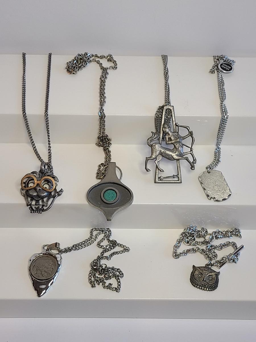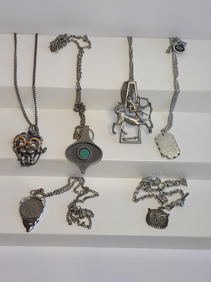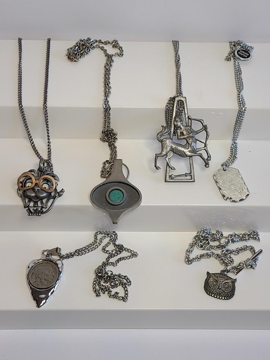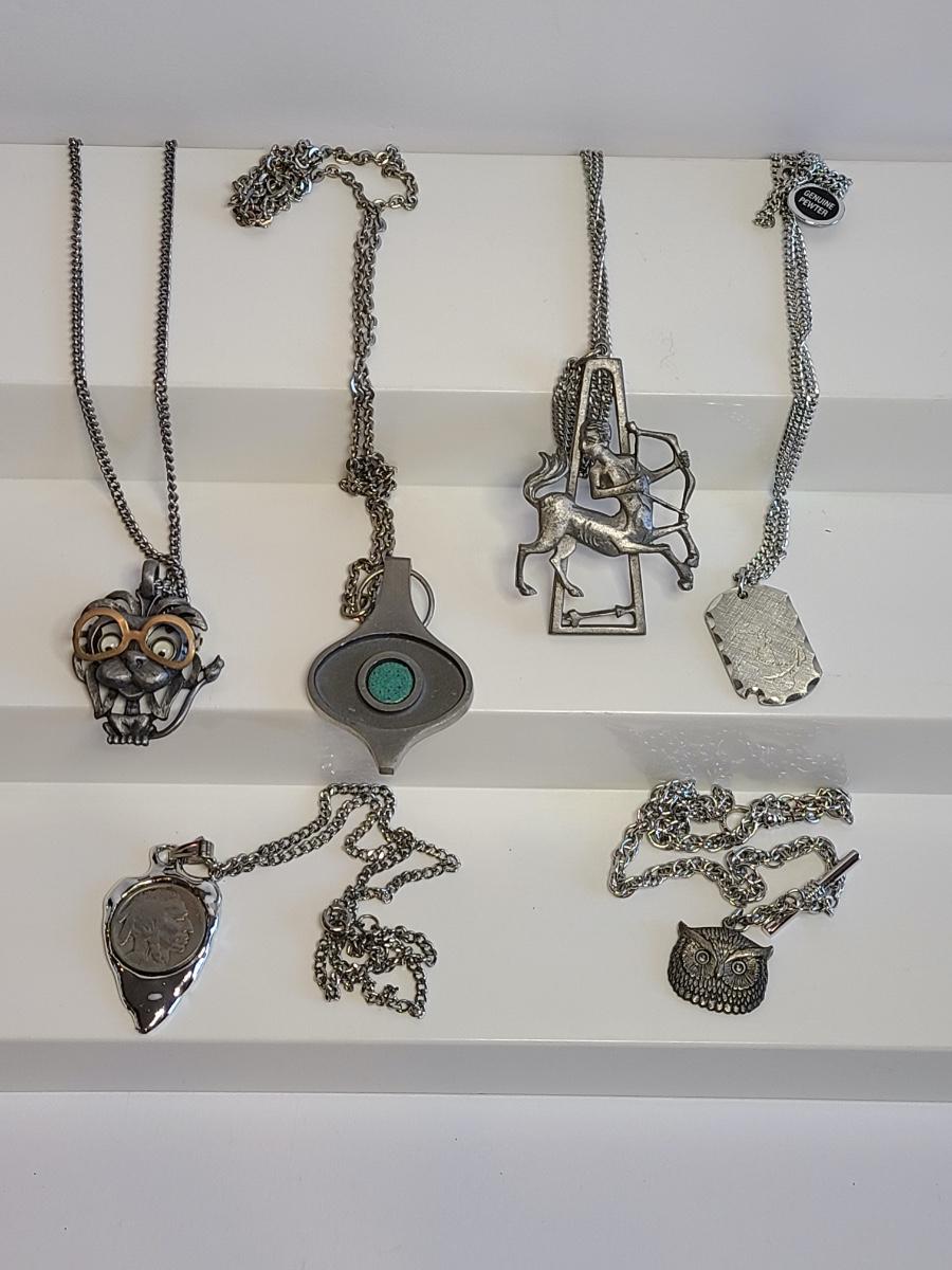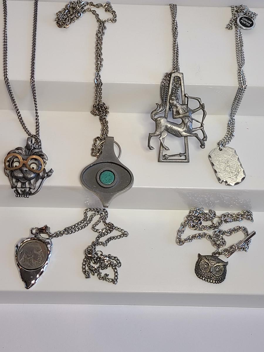 Nice lot of vintage pewter and silver tone jewelry: Buffalo Head Nickel in arrow head pendant, owl watch chain, FAB dog with glasses in pewter, Troels Denmark 70'/80's MCM pendant, Sagittarius Cathedral pendant and more. No sterling in this lot. The chains are silver tone metal. Please see all pictures as they are the best representation of the items. The pictures show condition, measurements if taken, and what is included in the lot. Due to the large amount that we photograph and the time frame, we are not always able to take measurements. All items unless noted, are pre-owned and have been used. If you purchased furniture, you must bring help. We do not allow one person to carry large furniture out on their own. Any damage to the walls, floors, or property is the buyers responsibility to fix, and the damage will be noted and you will charged for repairs, your bidding constitutes your understanding of these terms. Bring help, tools and a truck for the safety of our client’s homes, and your personal safety. Company policy. Thank you.