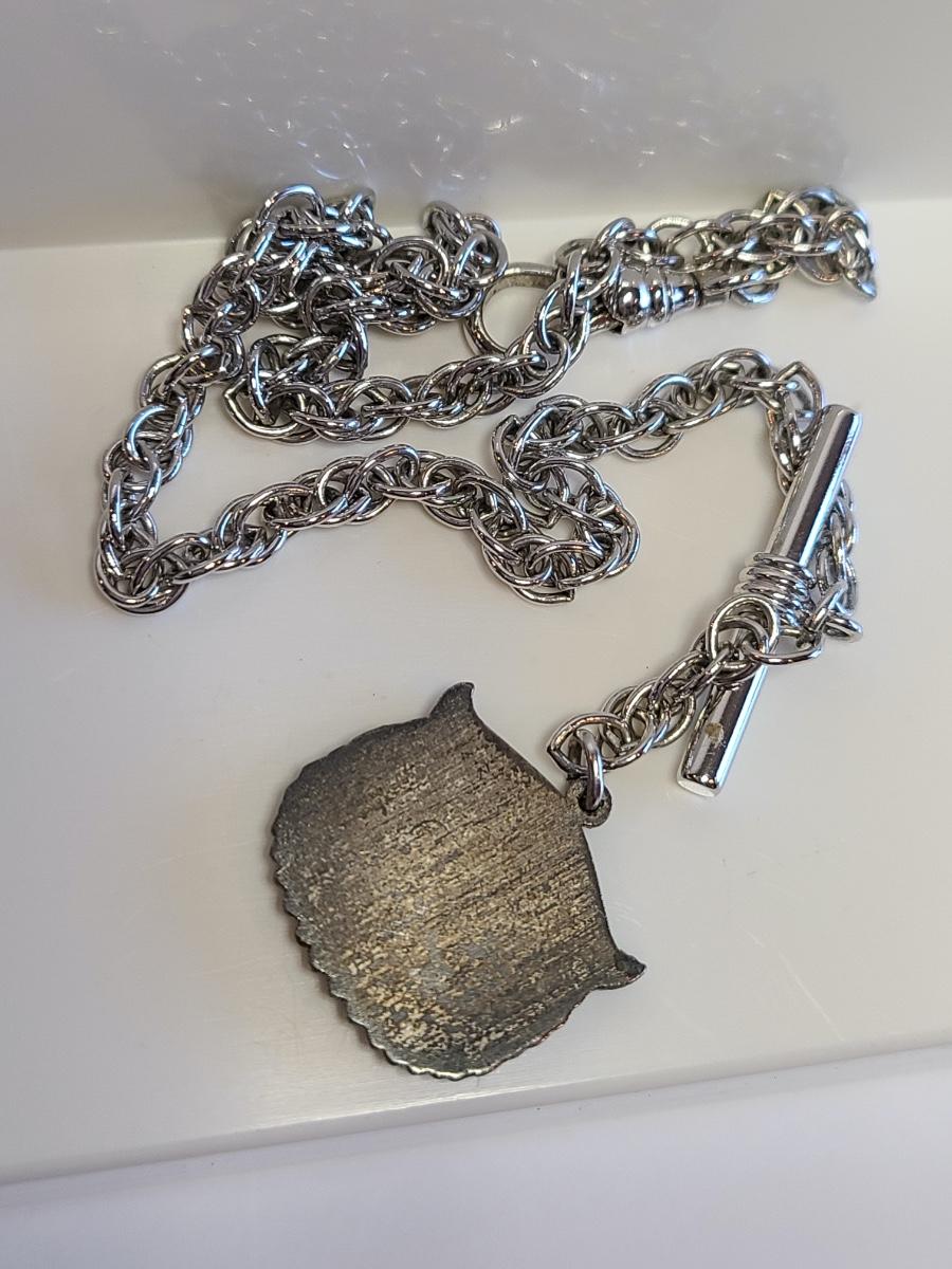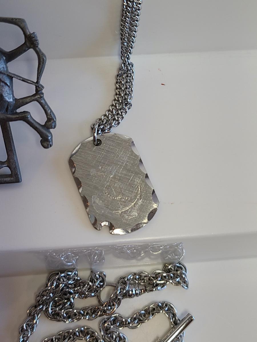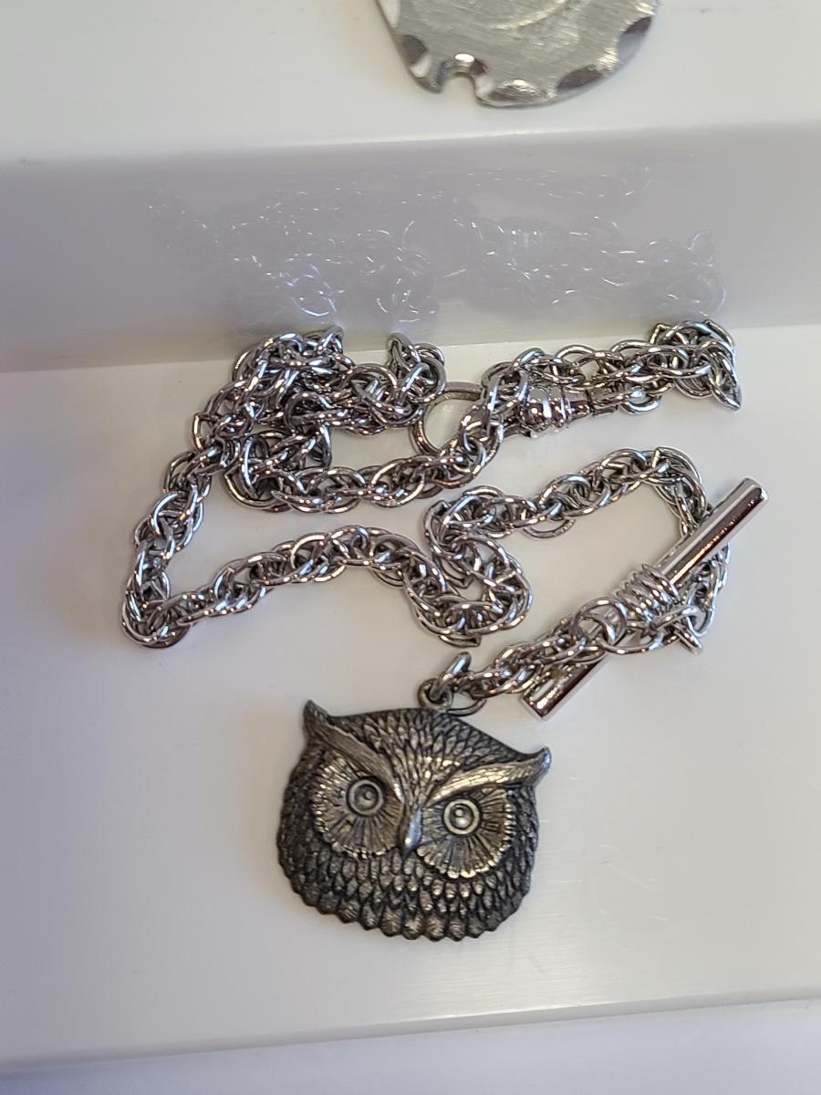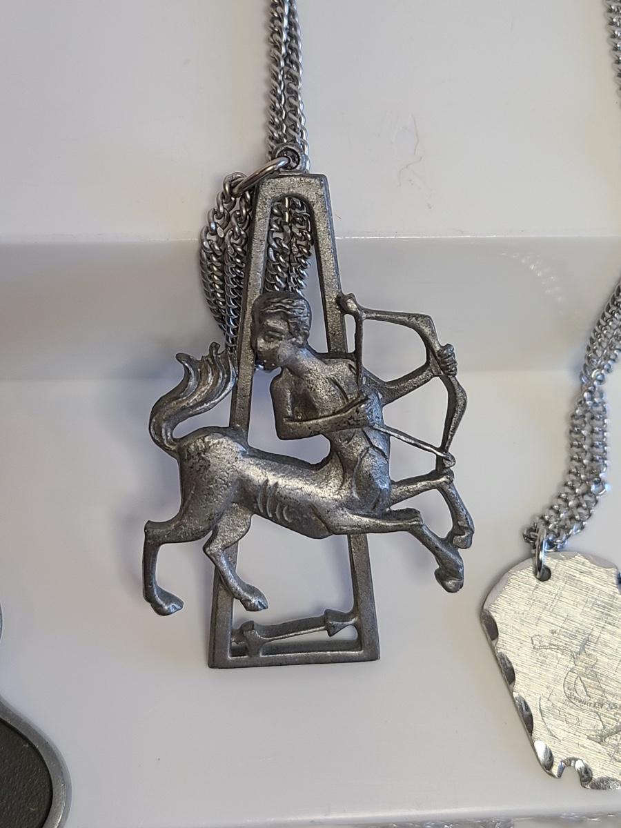 Nice lot of vintage pewter and silver tone jewelry: Buffalo Head Nickel in arrow head pendant, owl watch chain, FAB dog with glasses in pewter, Troels Denmark 70'/80's MCM pendant, Sagittarius Cathedral pendant and more. No sterling in this lot. The chains are silver tone metal. Please see all pictures as they are the best representation of the items. The pictures show condition, measurements if taken, and what is included in the lot. Due to the large amount that we photograph and the time frame, we are not always able to take measurements. All items unless noted, are pre-owned and have been used. If you purchased furniture, you must bring help. We do not allow one person to carry large furniture out on their own. Any damage to the walls, floors, or property is the buyers responsibility to fix, and the damage will be noted and you will charged for repairs, your bidding constitutes your understanding of these terms. Bring help, tools and a truck for the safety of our client’s homes, and your personal safety. Company policy. Thank you.