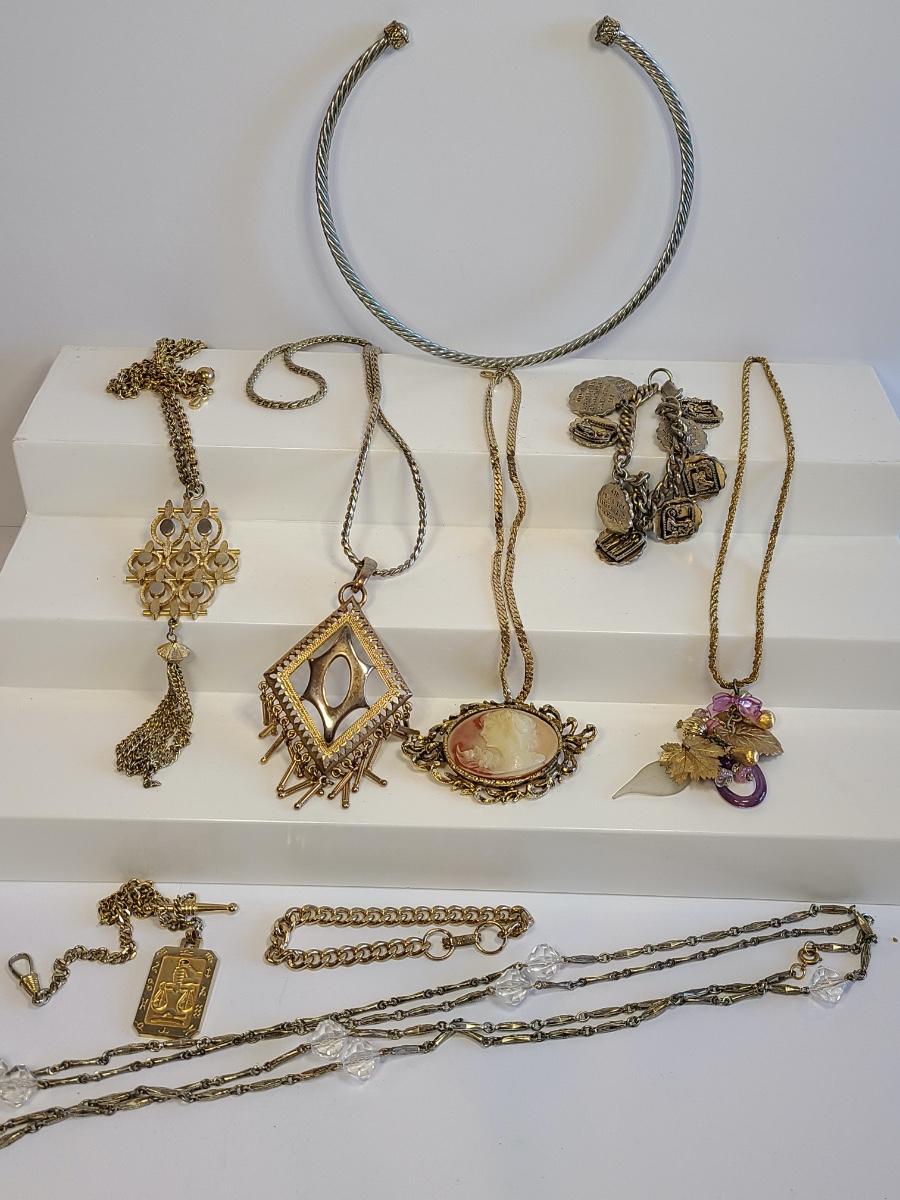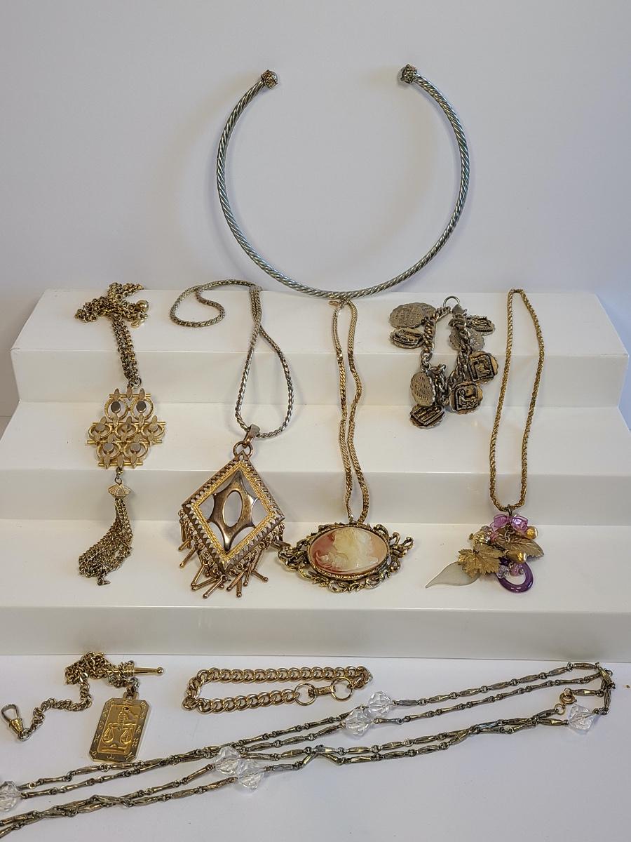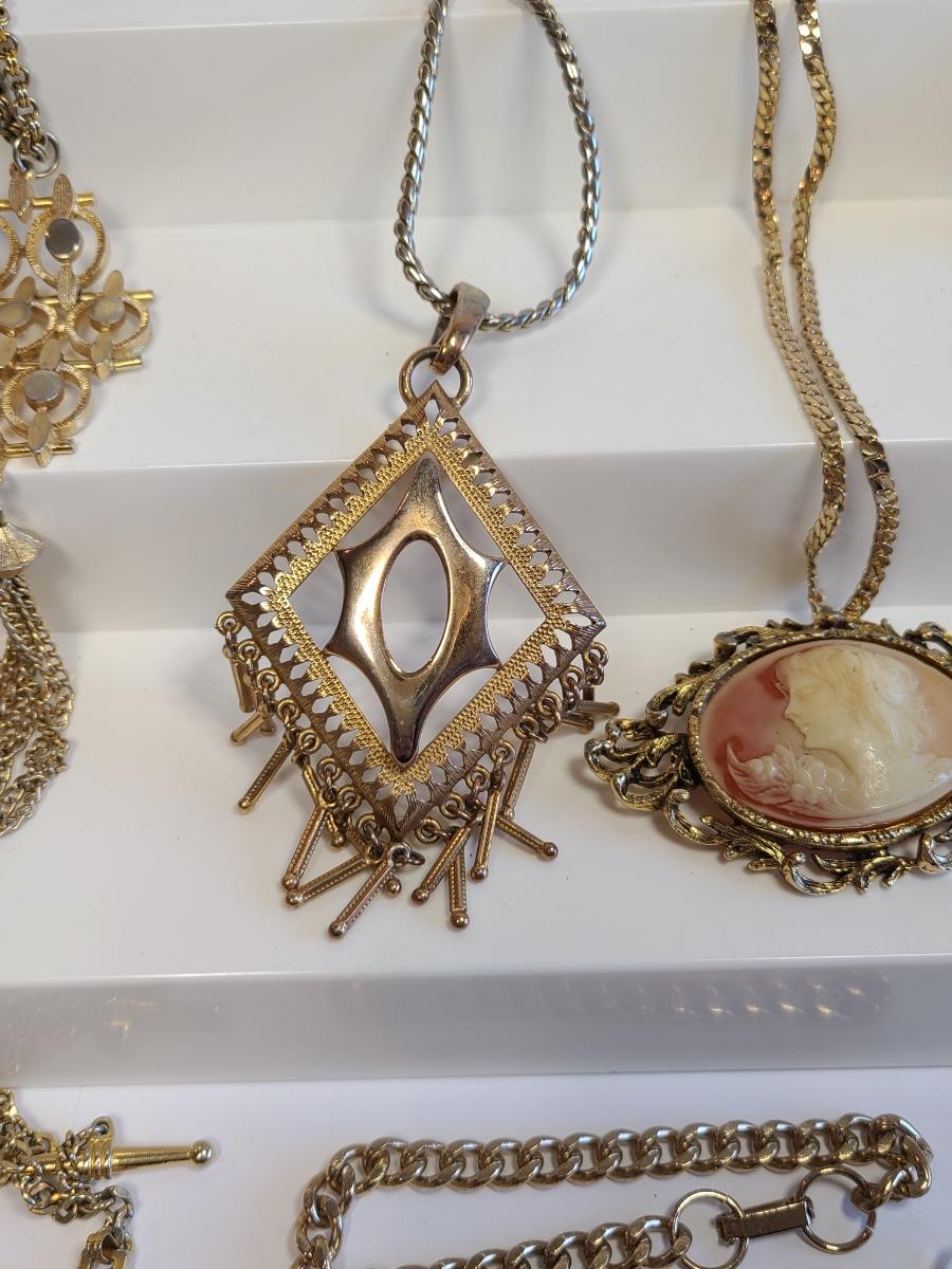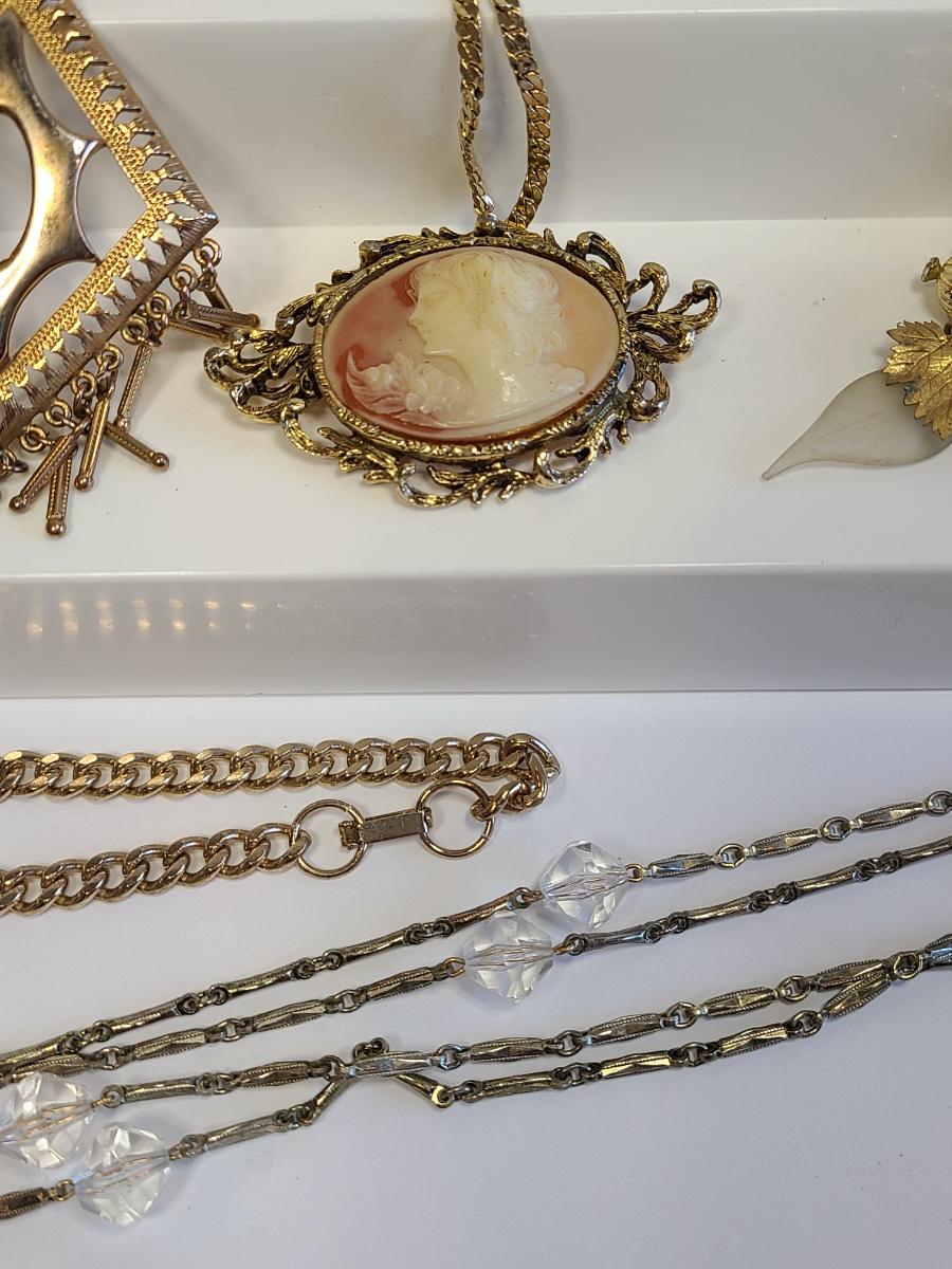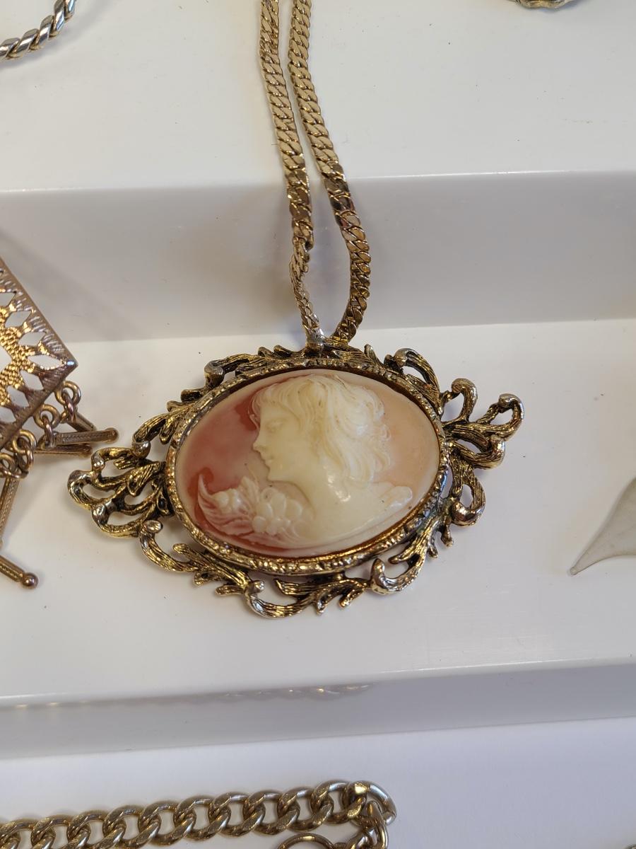 Lot J8: Vintage Gold Tone Jewelry: Cameo, Large Chunky Pendants and More