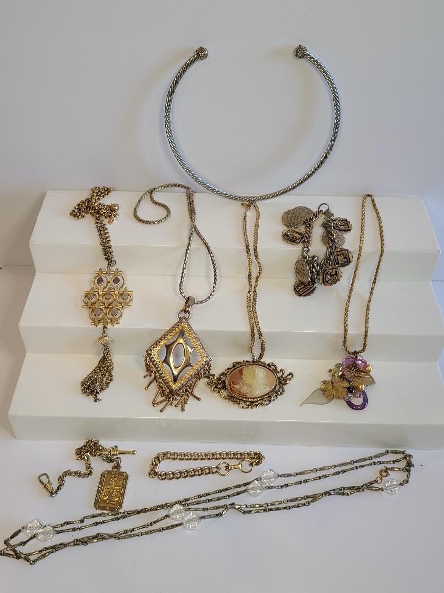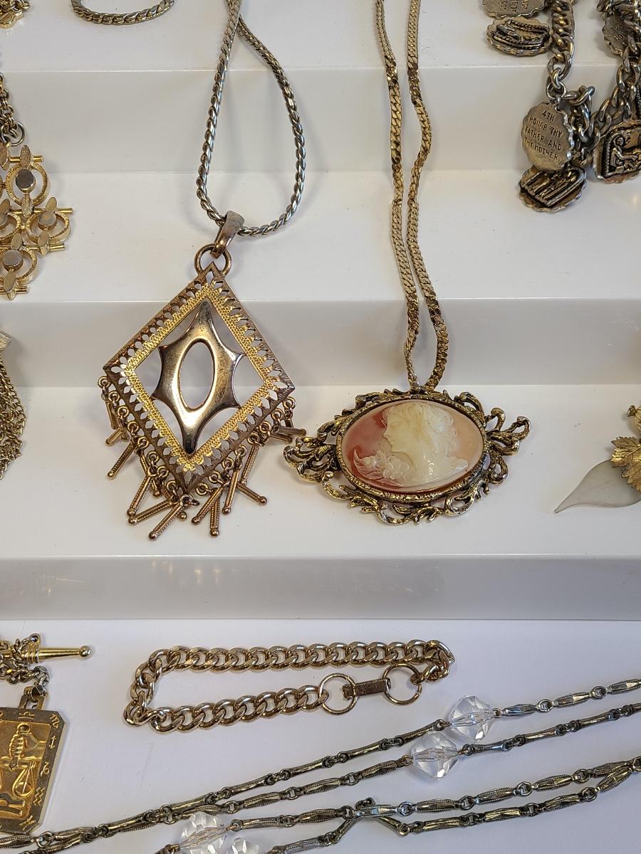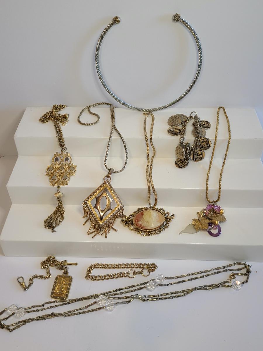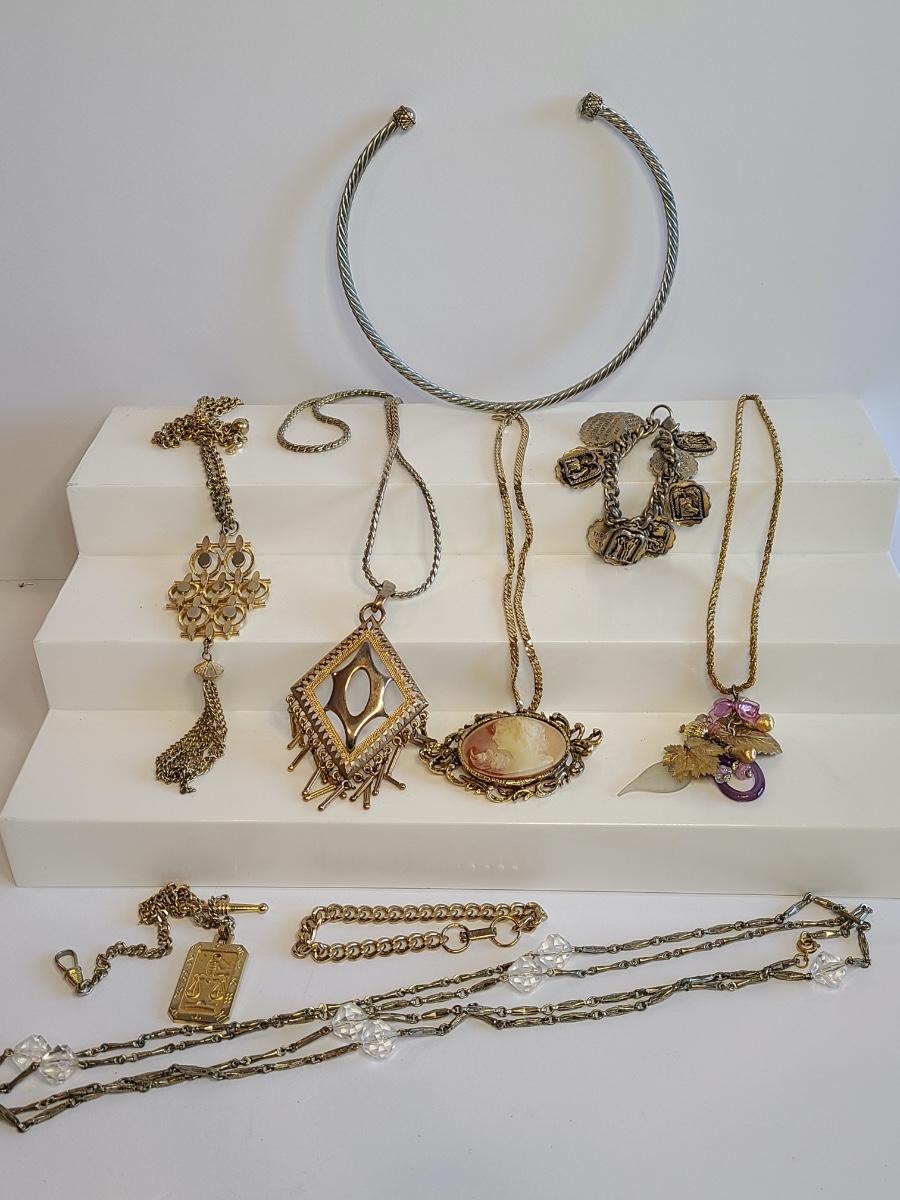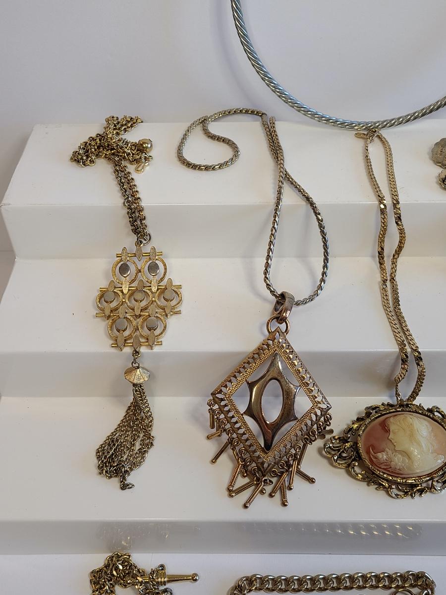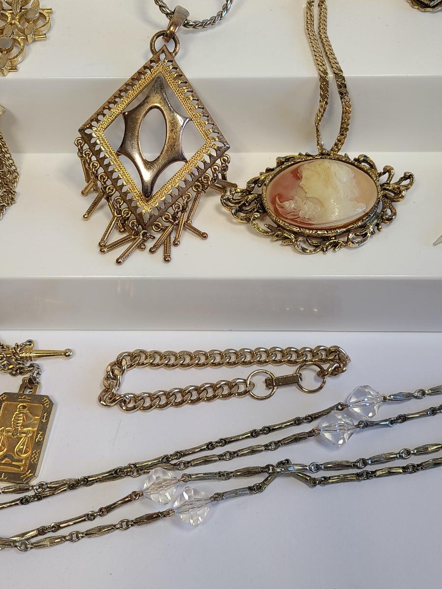 Lot J8: Vintage Gold Tone Jewelry: Cameo, Large Chunky Pendants and More