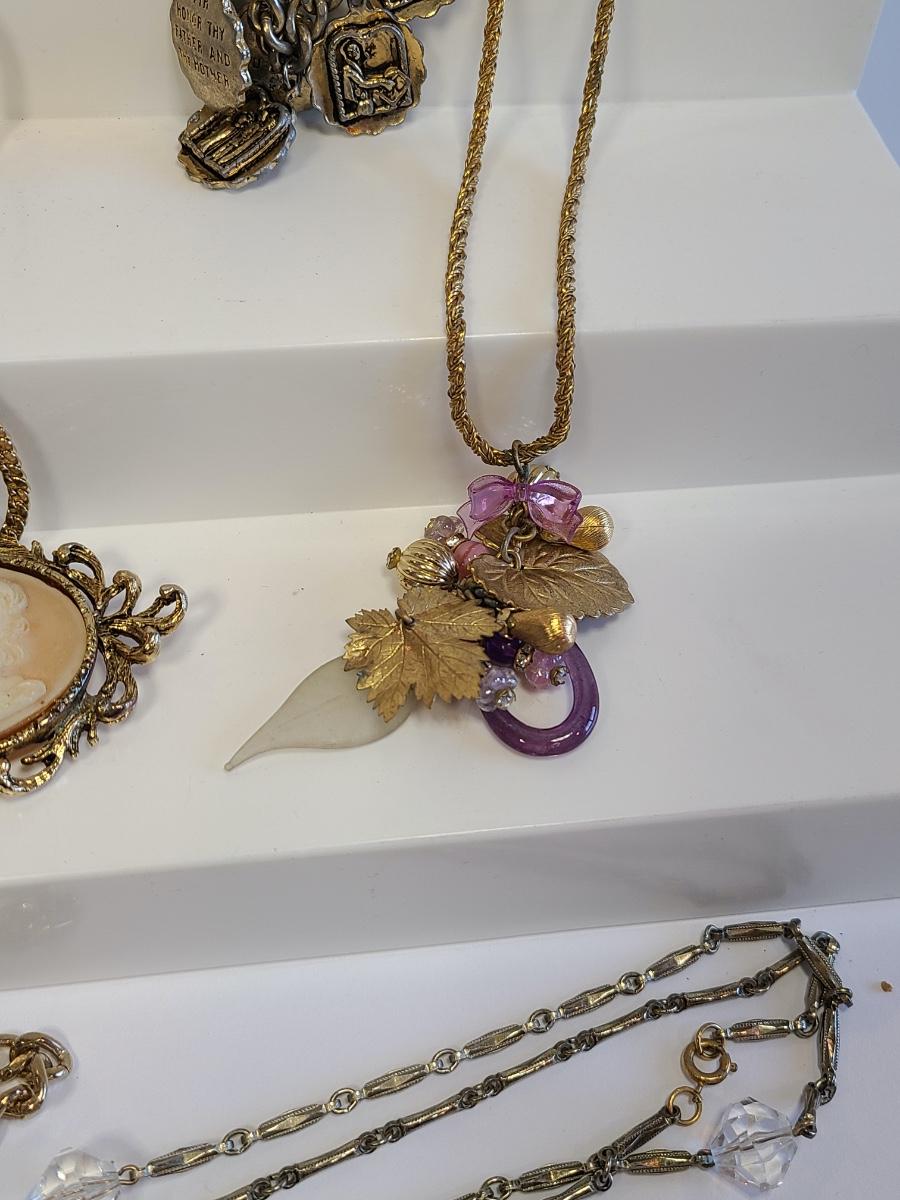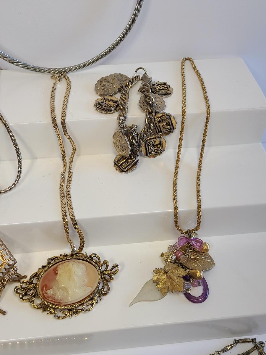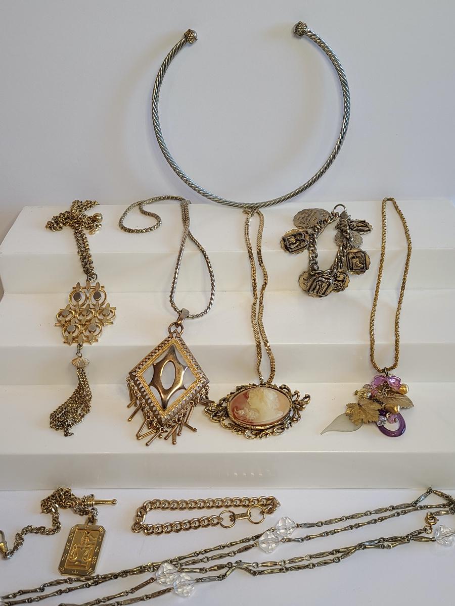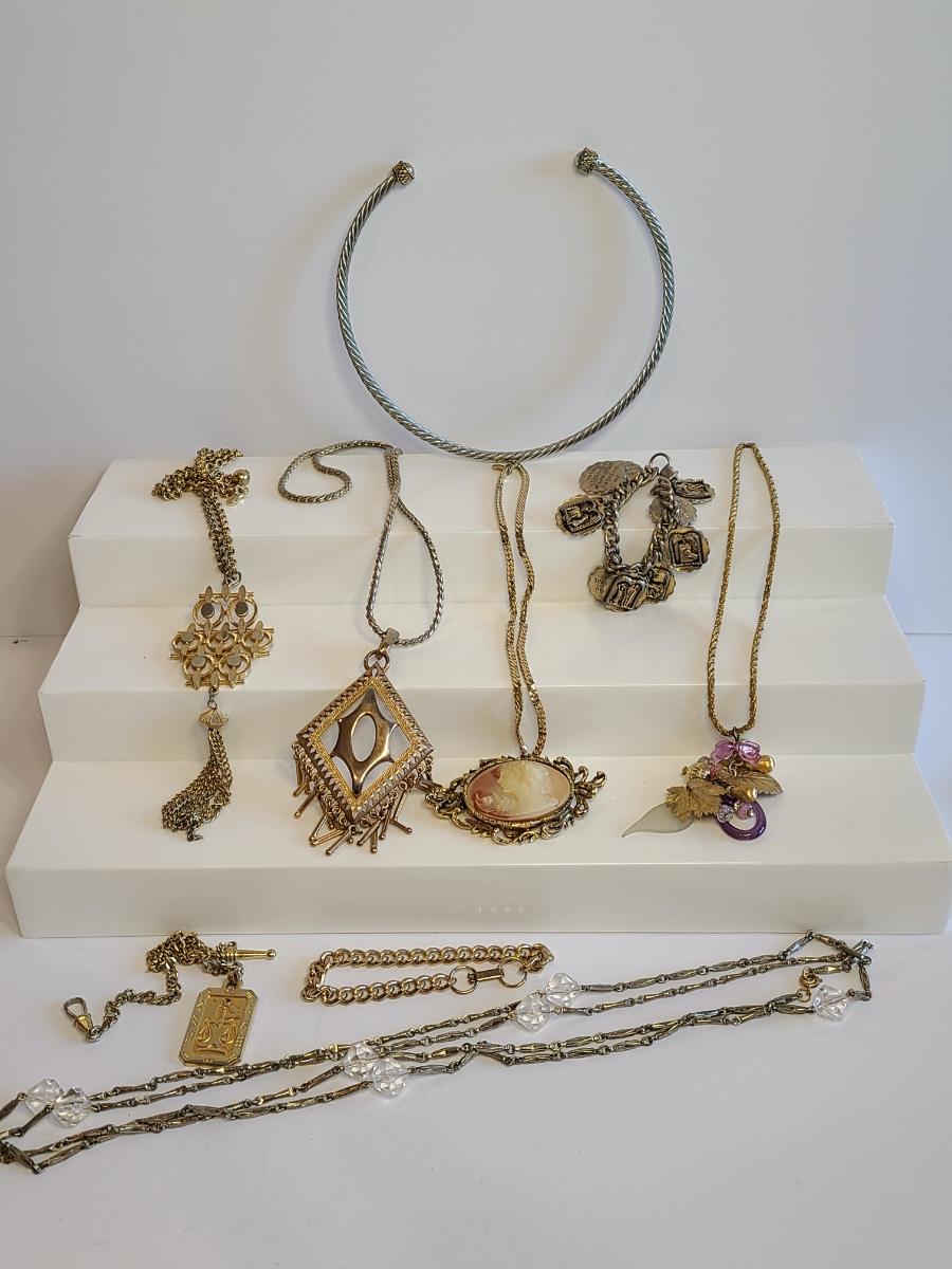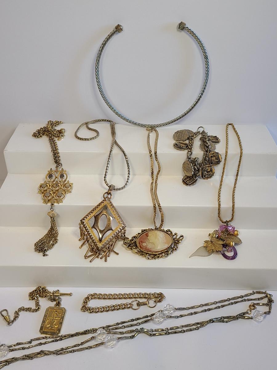 Lot J8: Vintage Gold Tone Jewelry: Cameo, Large Chunky Pendants and More