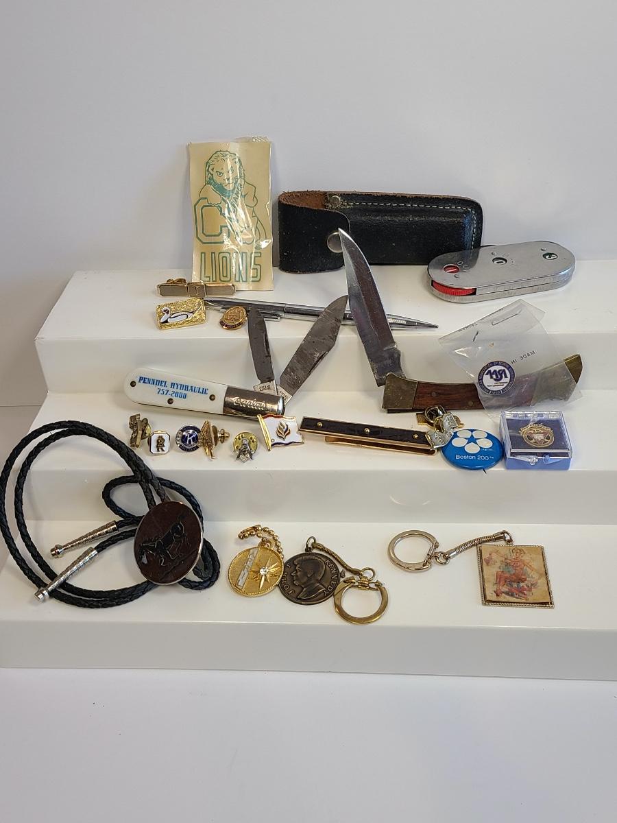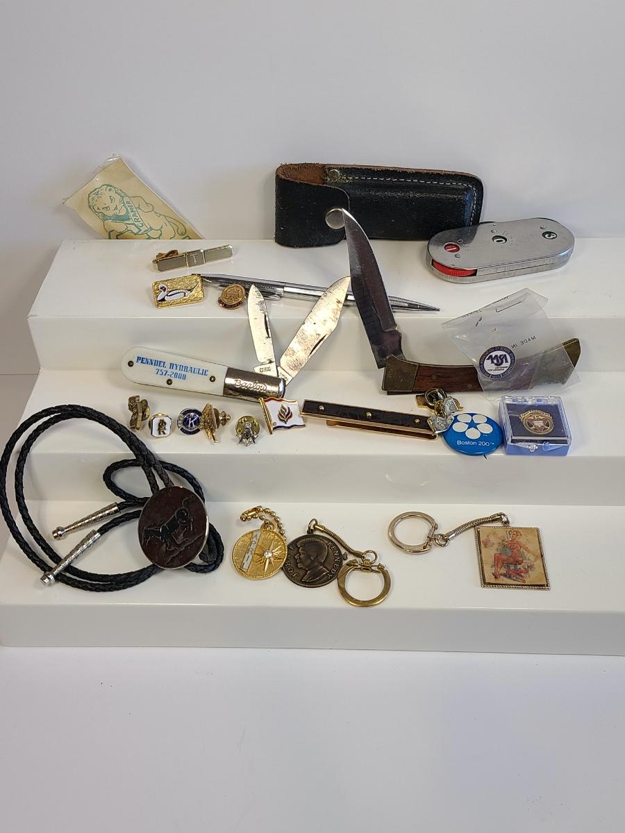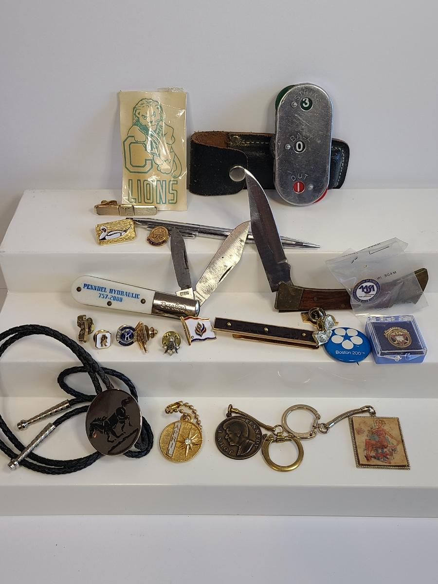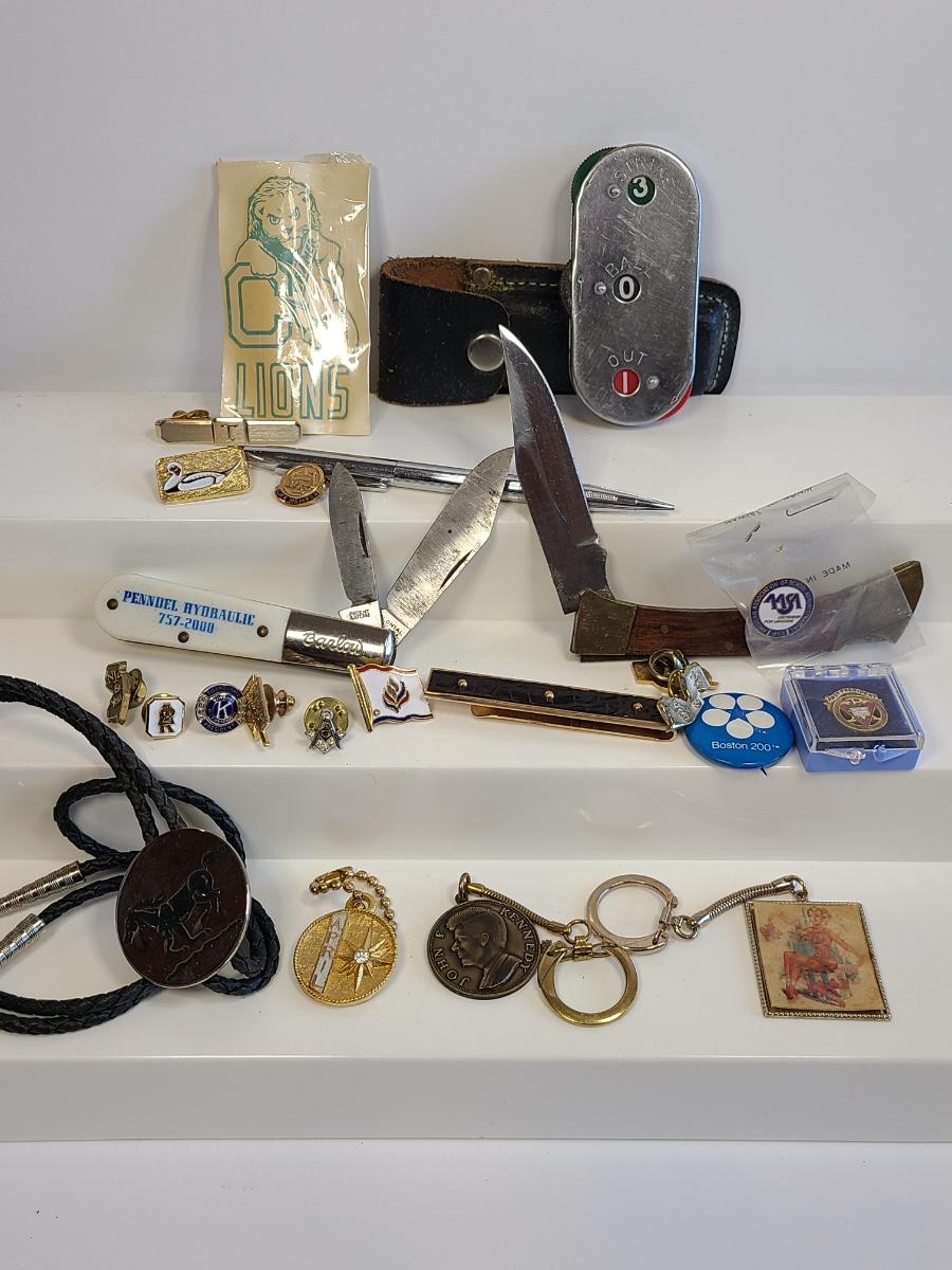 Lot J3: Mens Drawer Vintage Finds: Pocket Knives, Bolo Tie, Baseball Counter and More