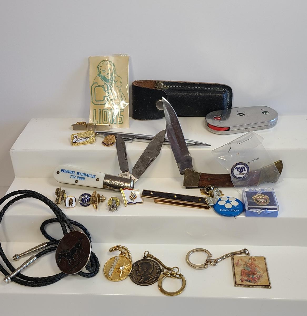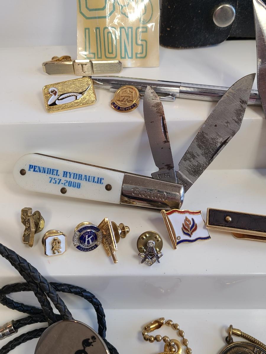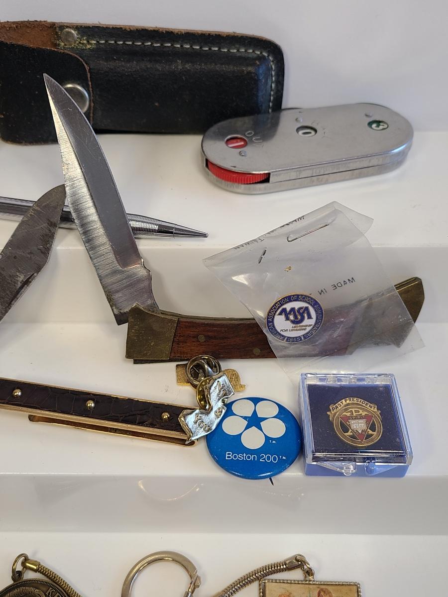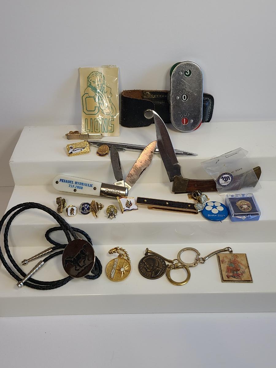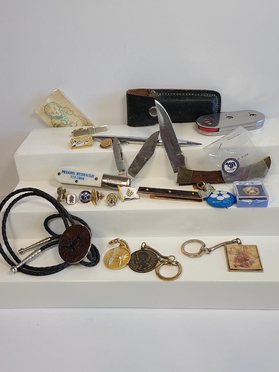 Lot J3: Mens Drawer Vintage Finds: Pocket Knives, Bolo Tie, Baseball Counter and More