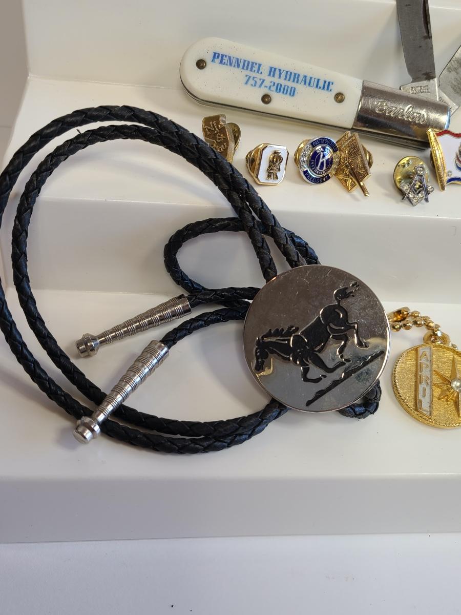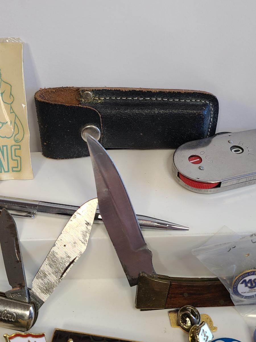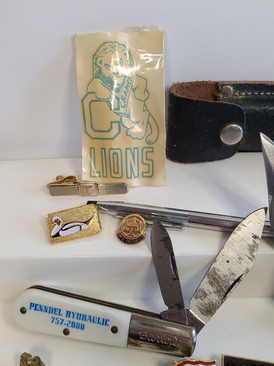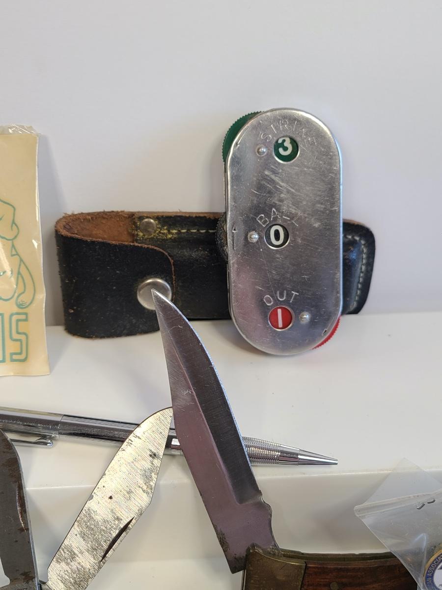 Lot J3: Mens Drawer Vintage Finds: Pocket Knives, Bolo Tie, Baseball Counter and More