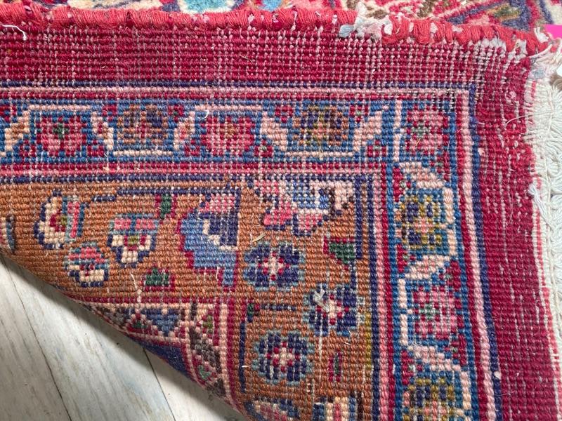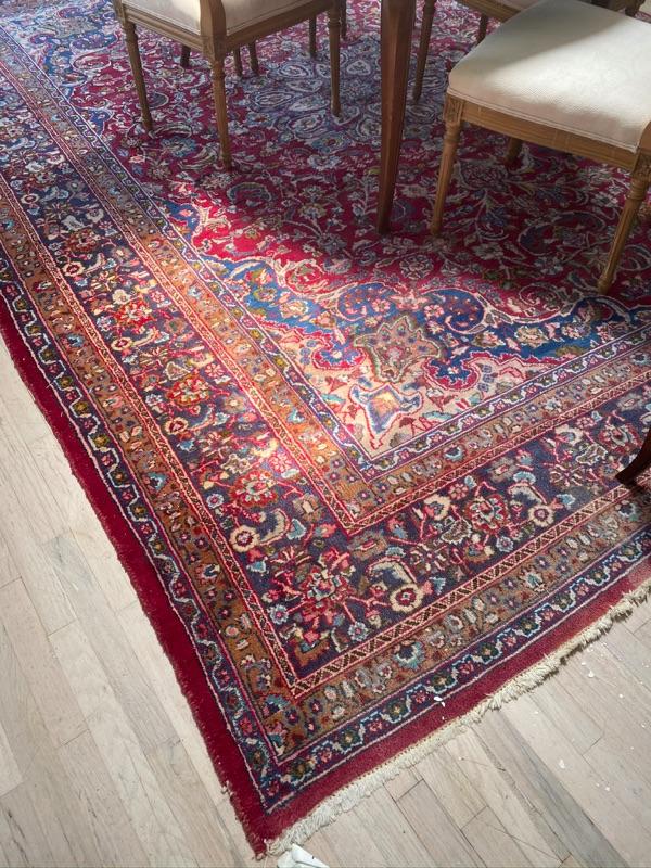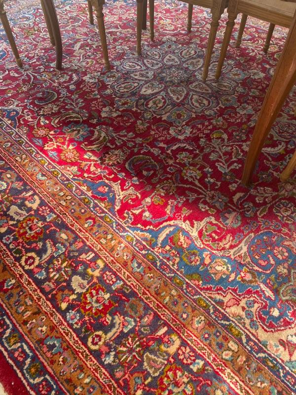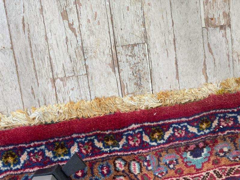 Large Oriental Hand knotted rug with stain on fringe