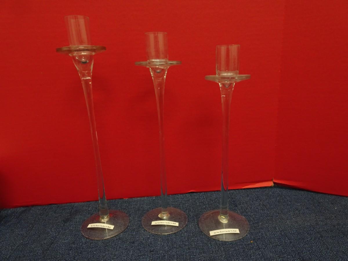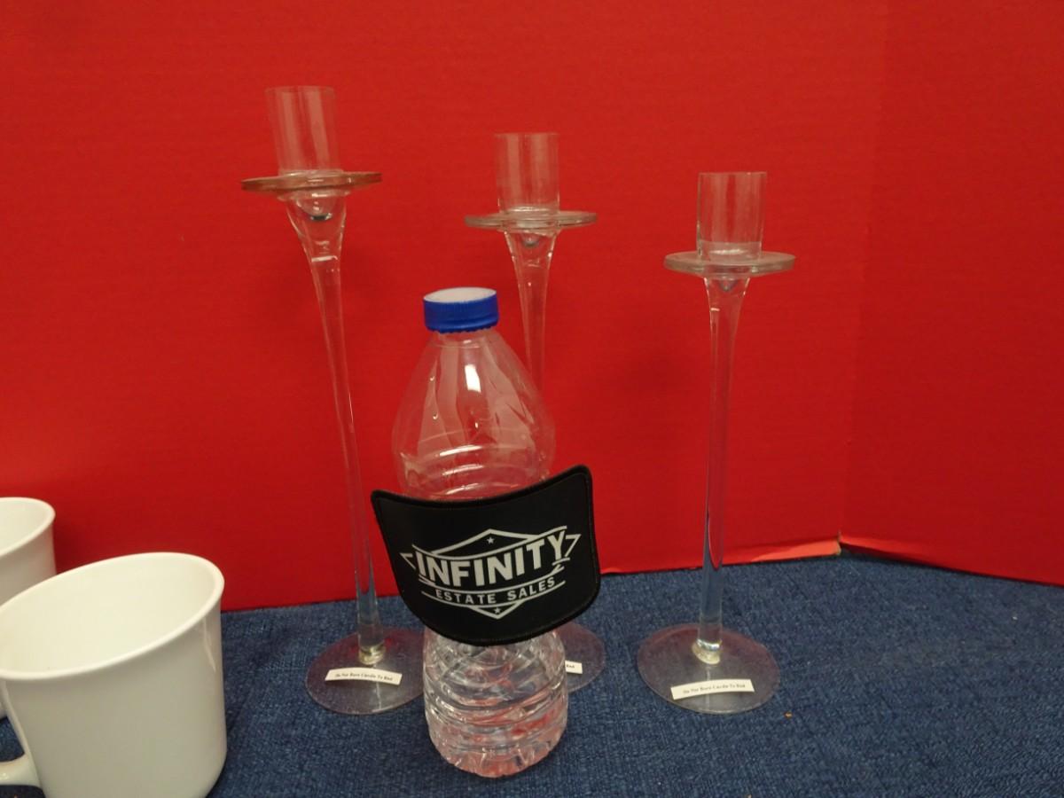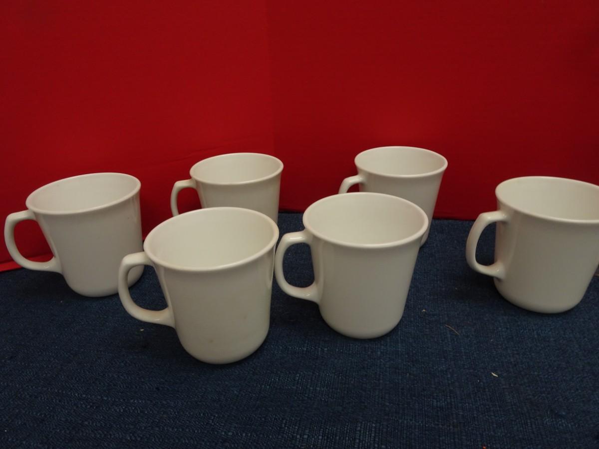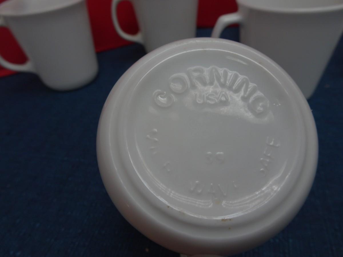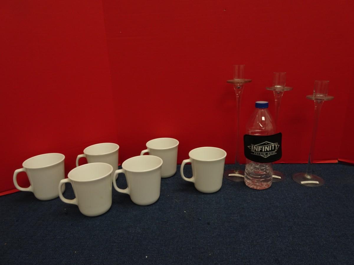 LOT #552 CORNING MUGS AND GLASS CANDLESTICKS