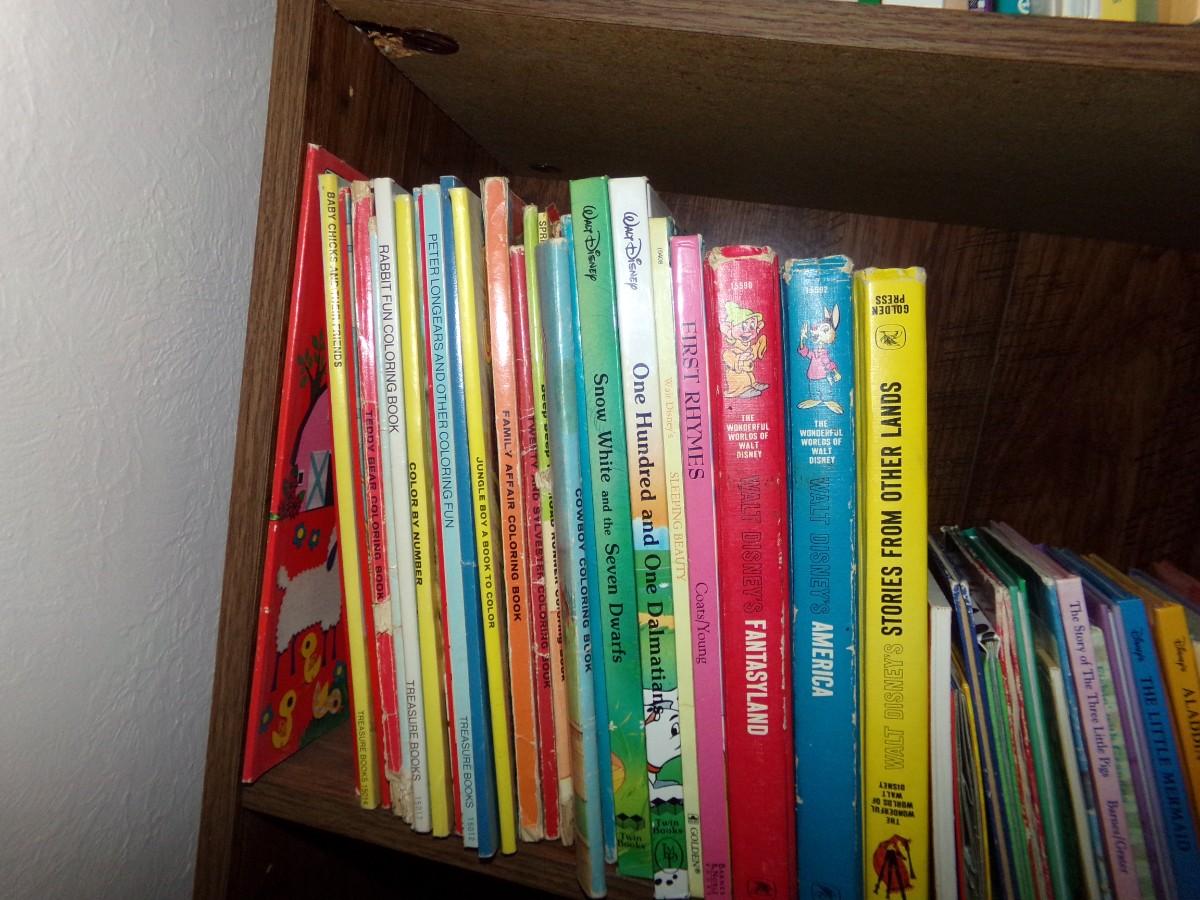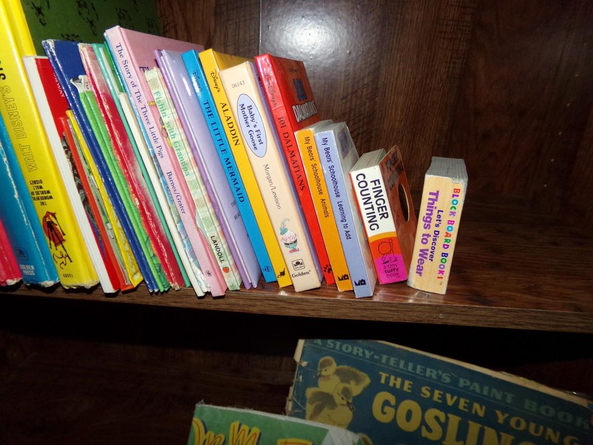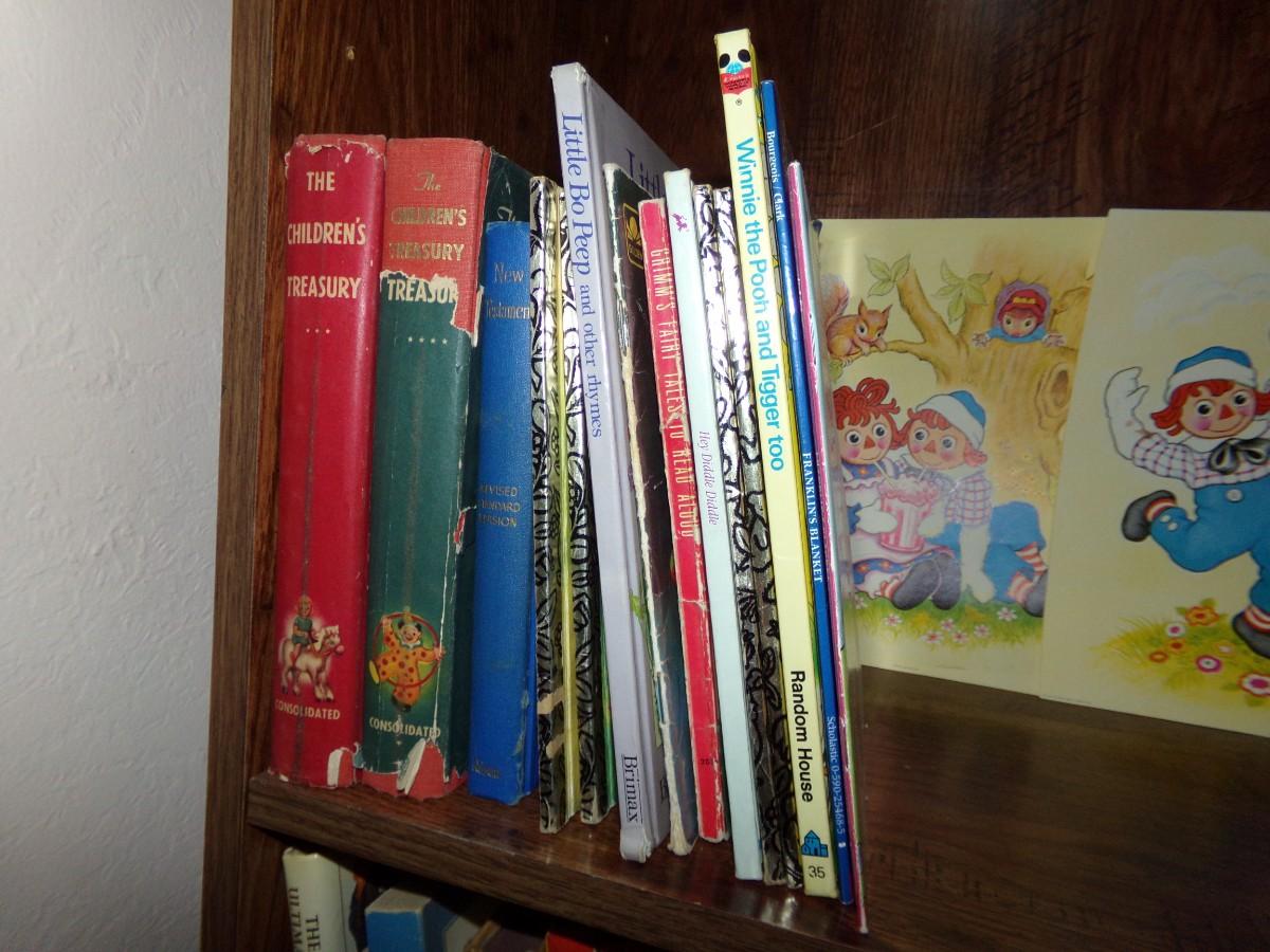 LARGE ASSORTMENT OF CHILDREN'S BOOKS. MANY ARE STORIES FROM OLDER DAYS. ALSO A WOODEN BOX THAT SAYS COLORING BOOKS.