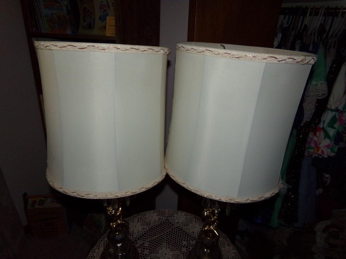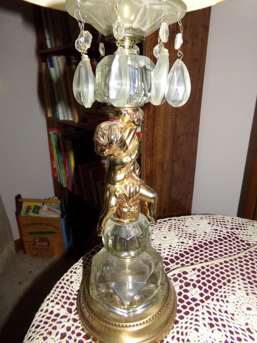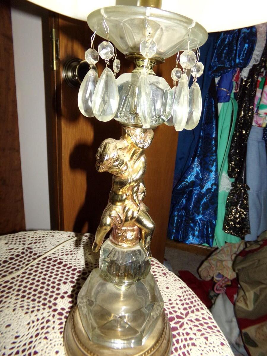 2 MATCHING CHERUB LAMPS. WITH GLASS TEARDROP PENDANTS. JUST NEED CLEANED AND THEY WILL STAND OUT IN ANY ROOM. LAMPS ARE 32”H