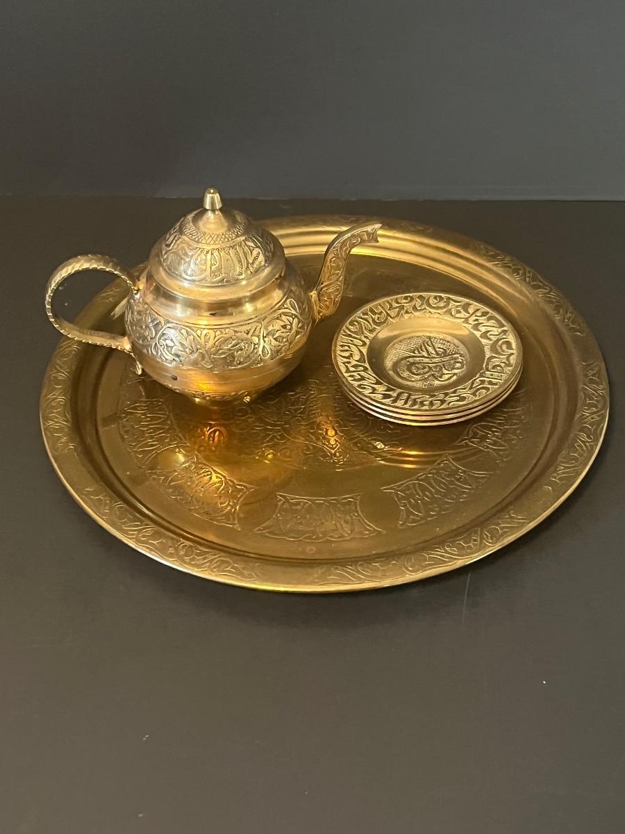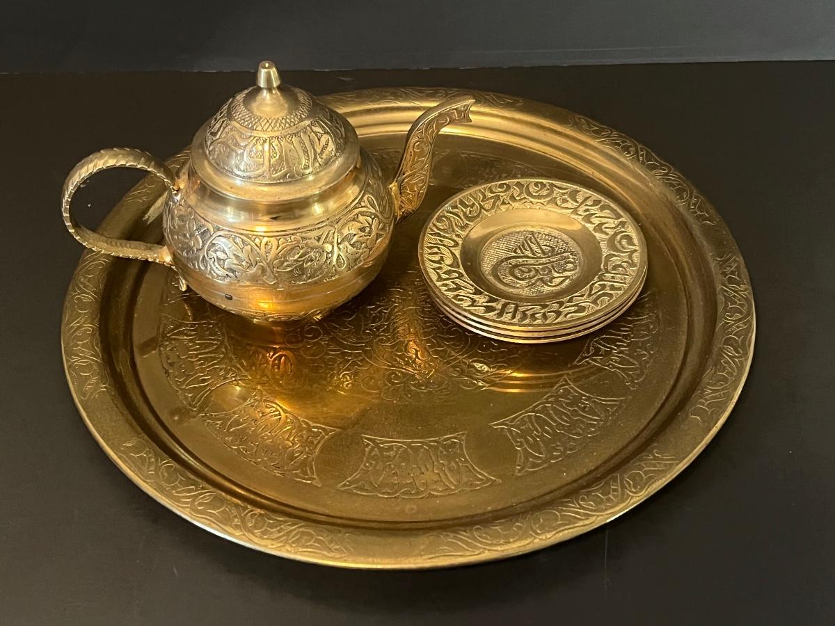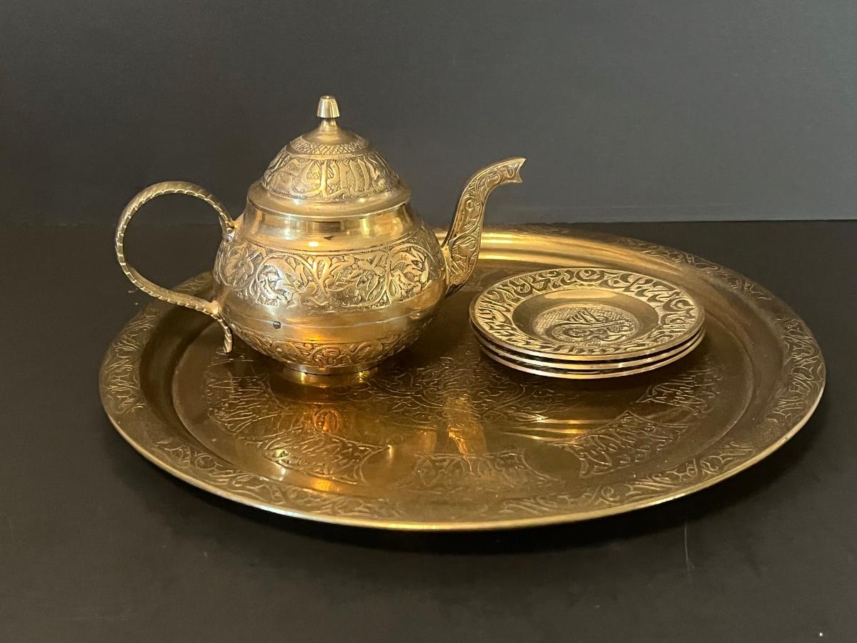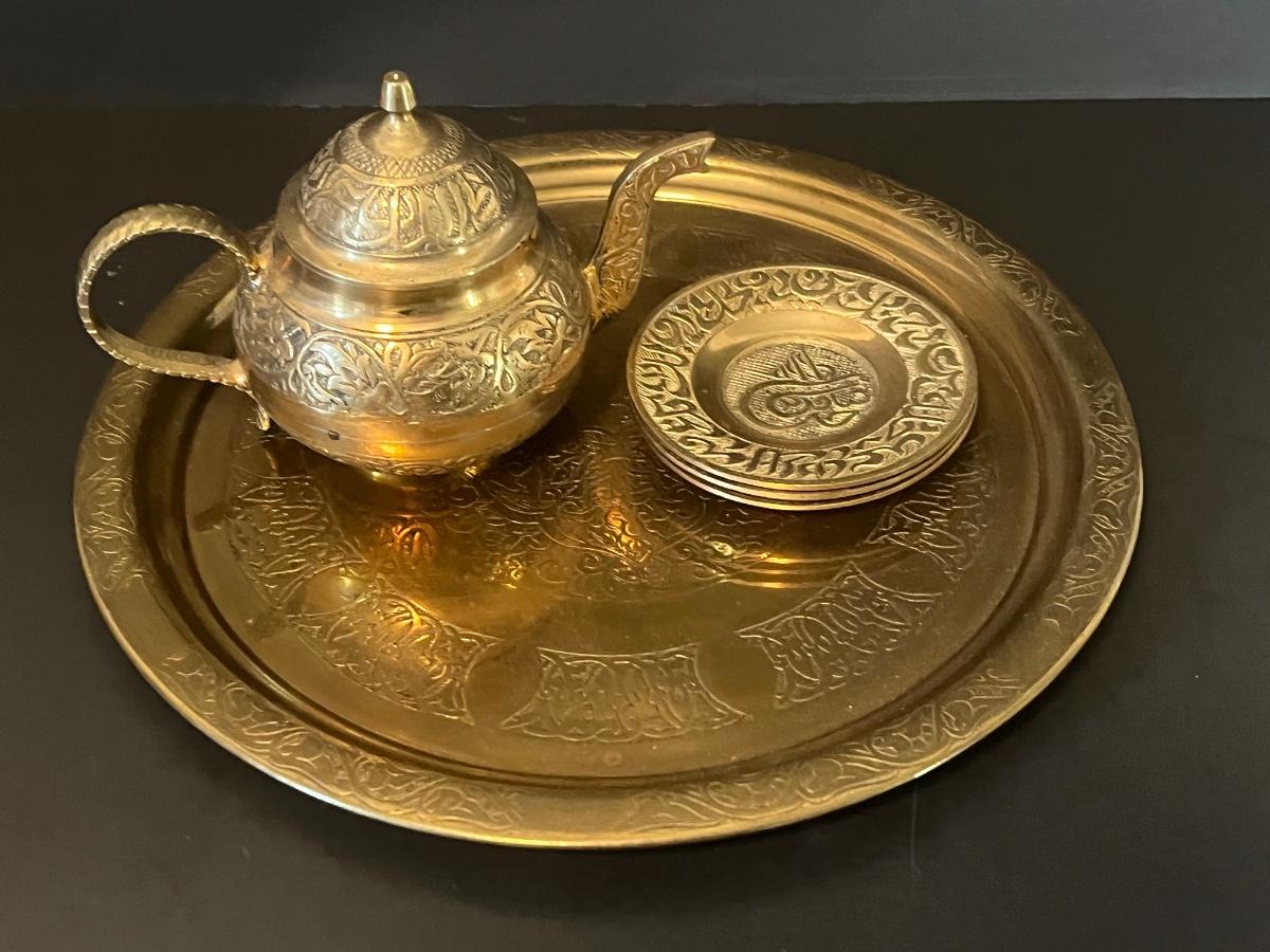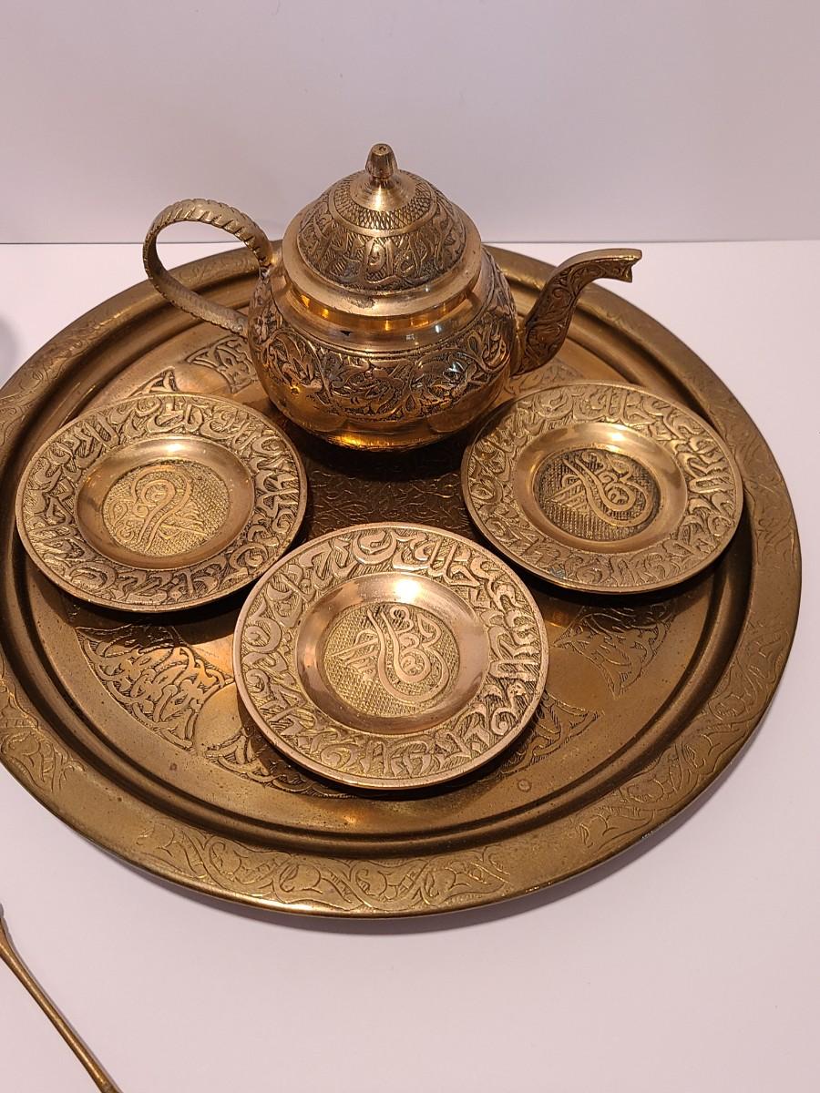 LOT 116: Vintage Brass Tray, Teapot, Coaster, Made in Istanbul