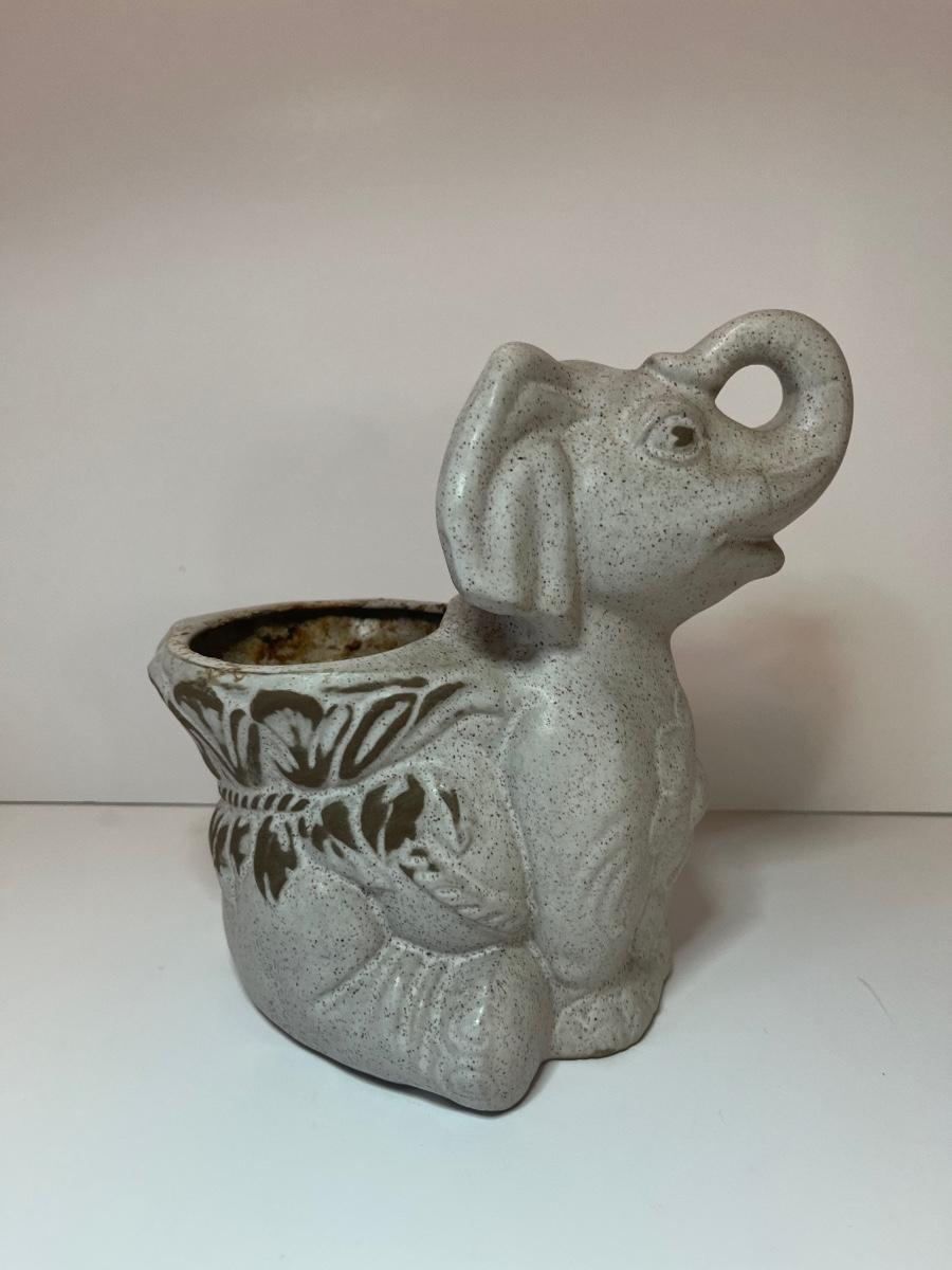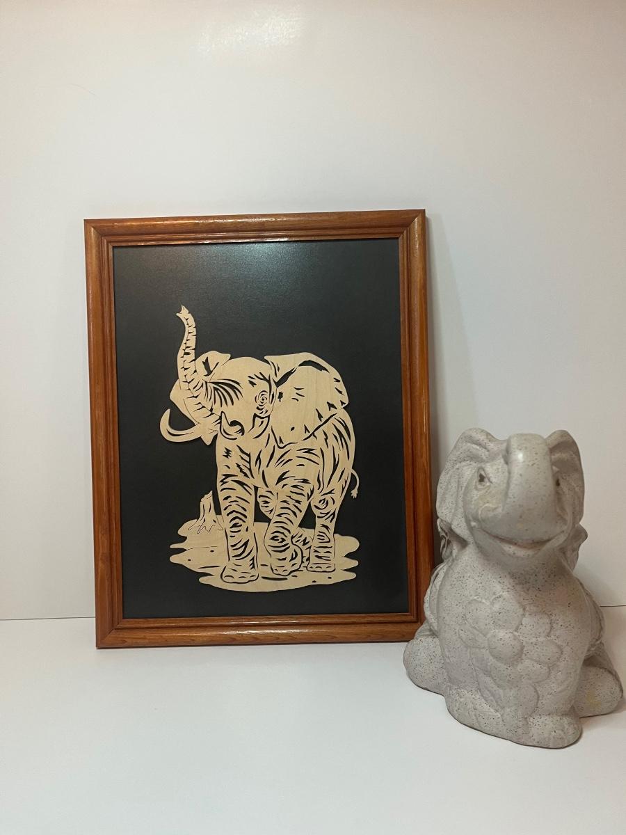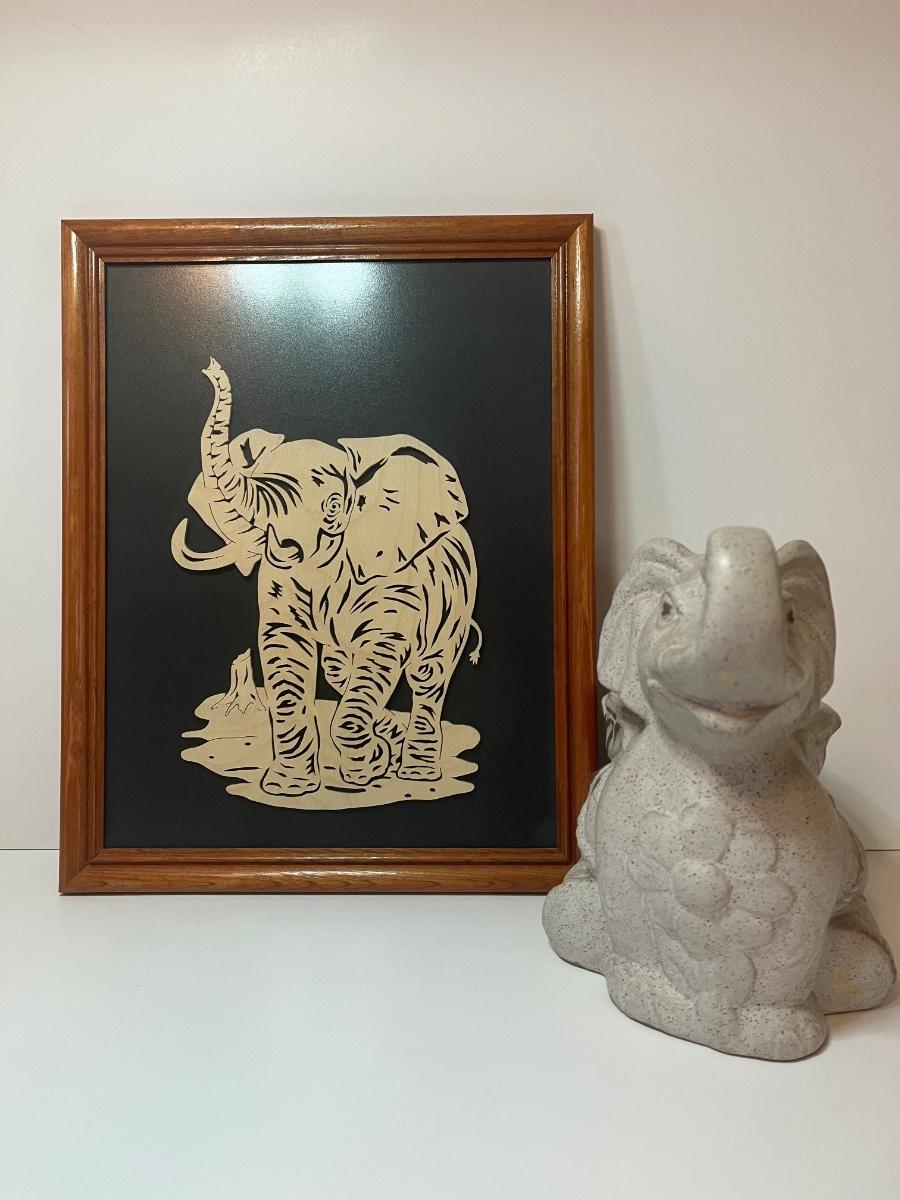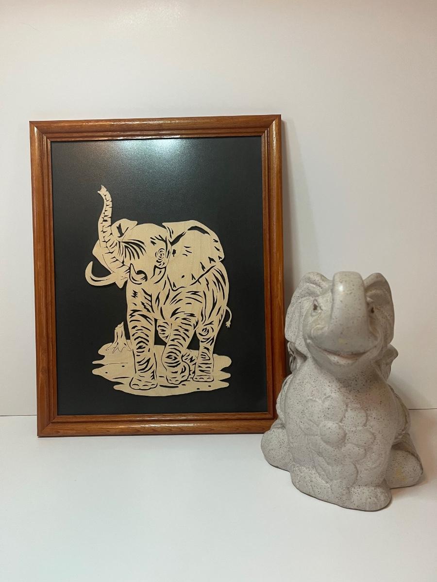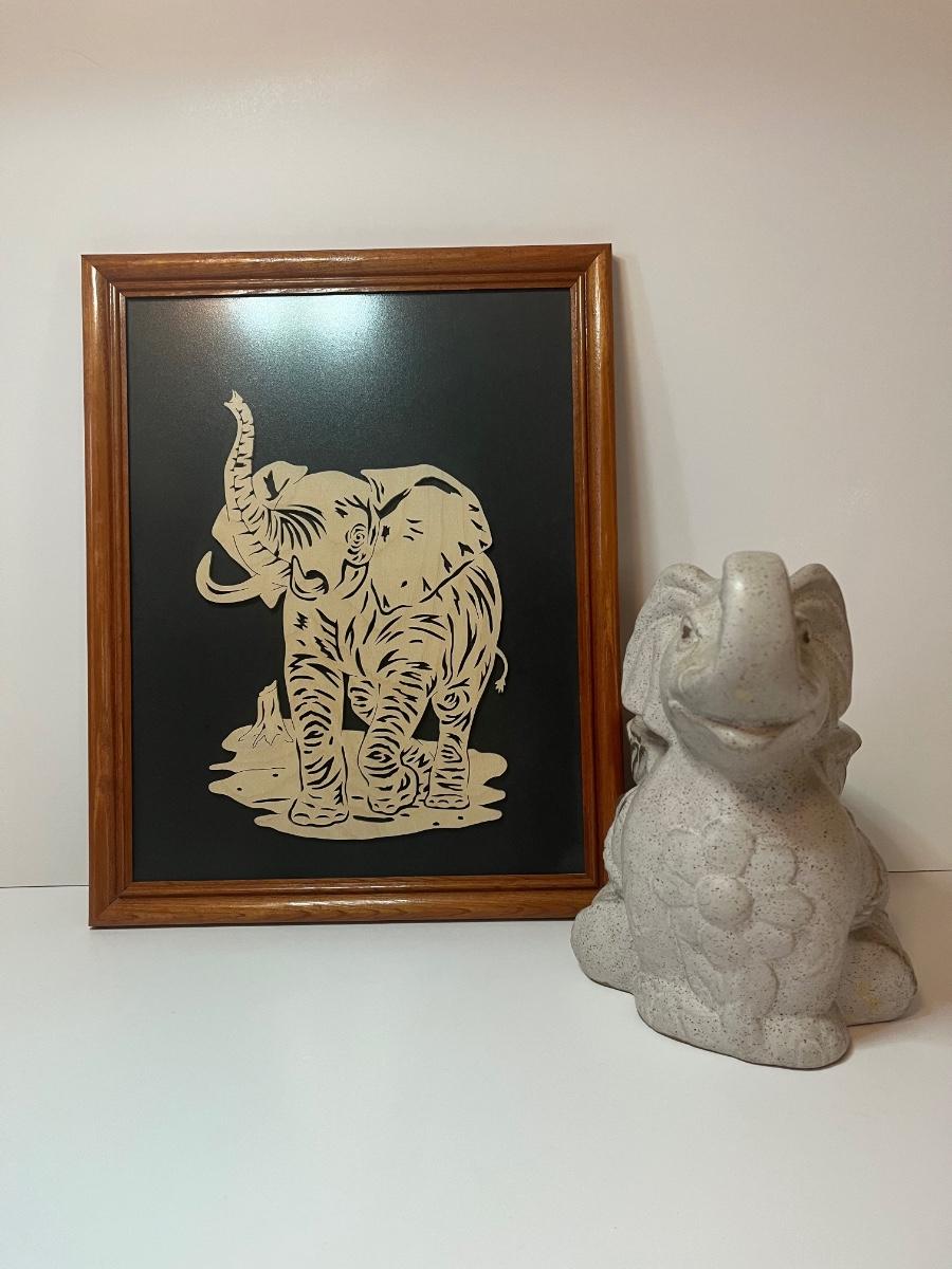 Collections includes a framed laser cut wooden elephant by Rod Follmer and a pottery elephant planter.