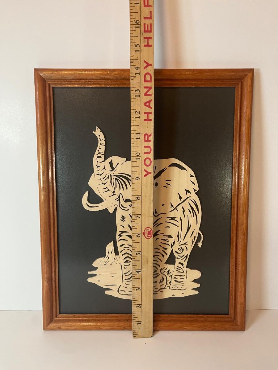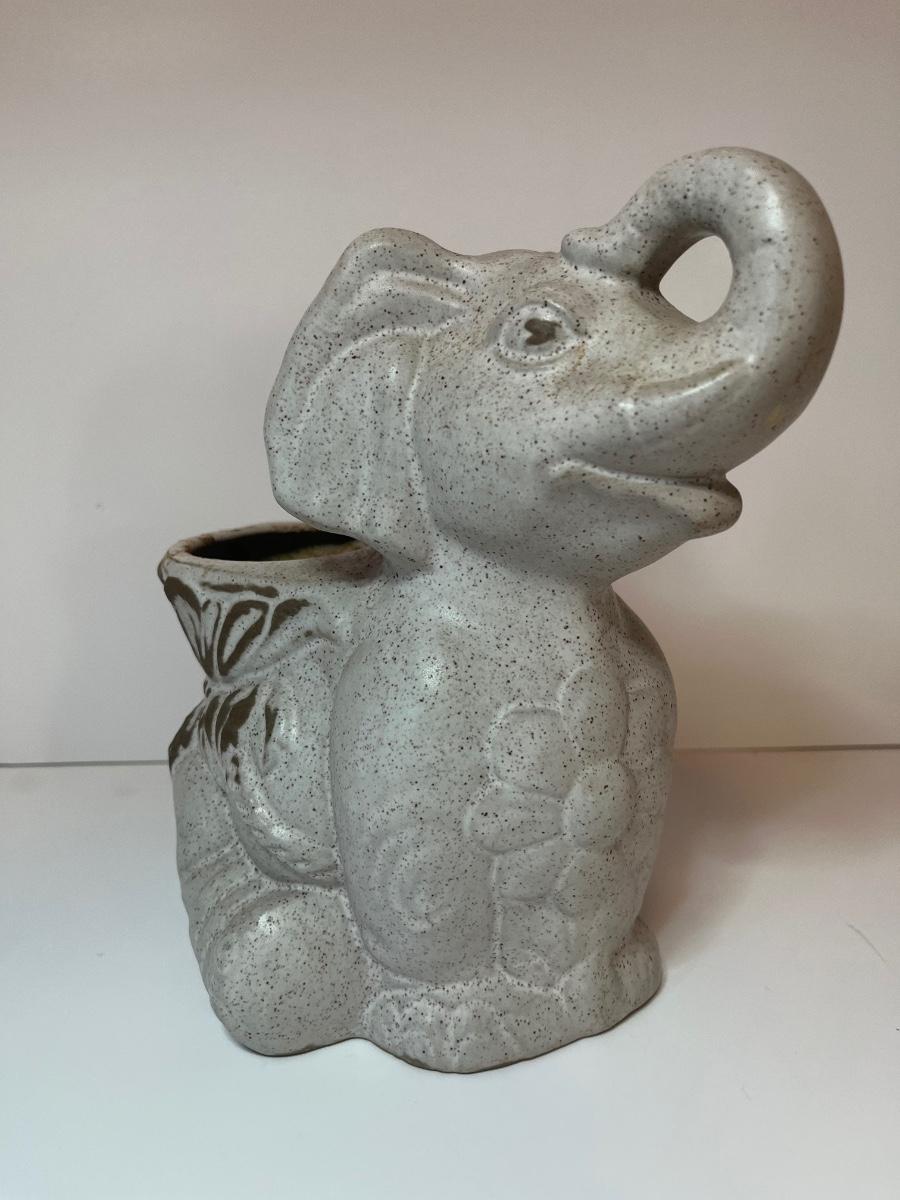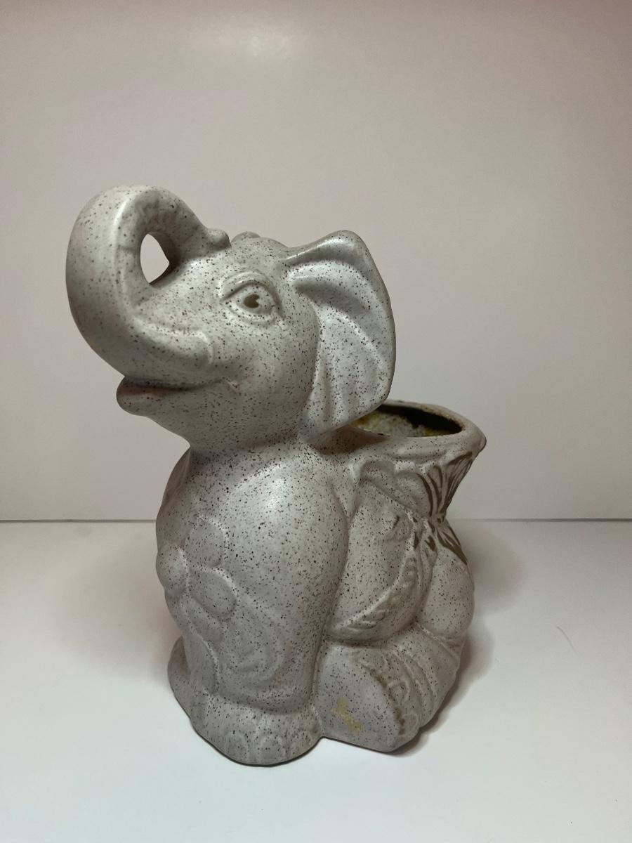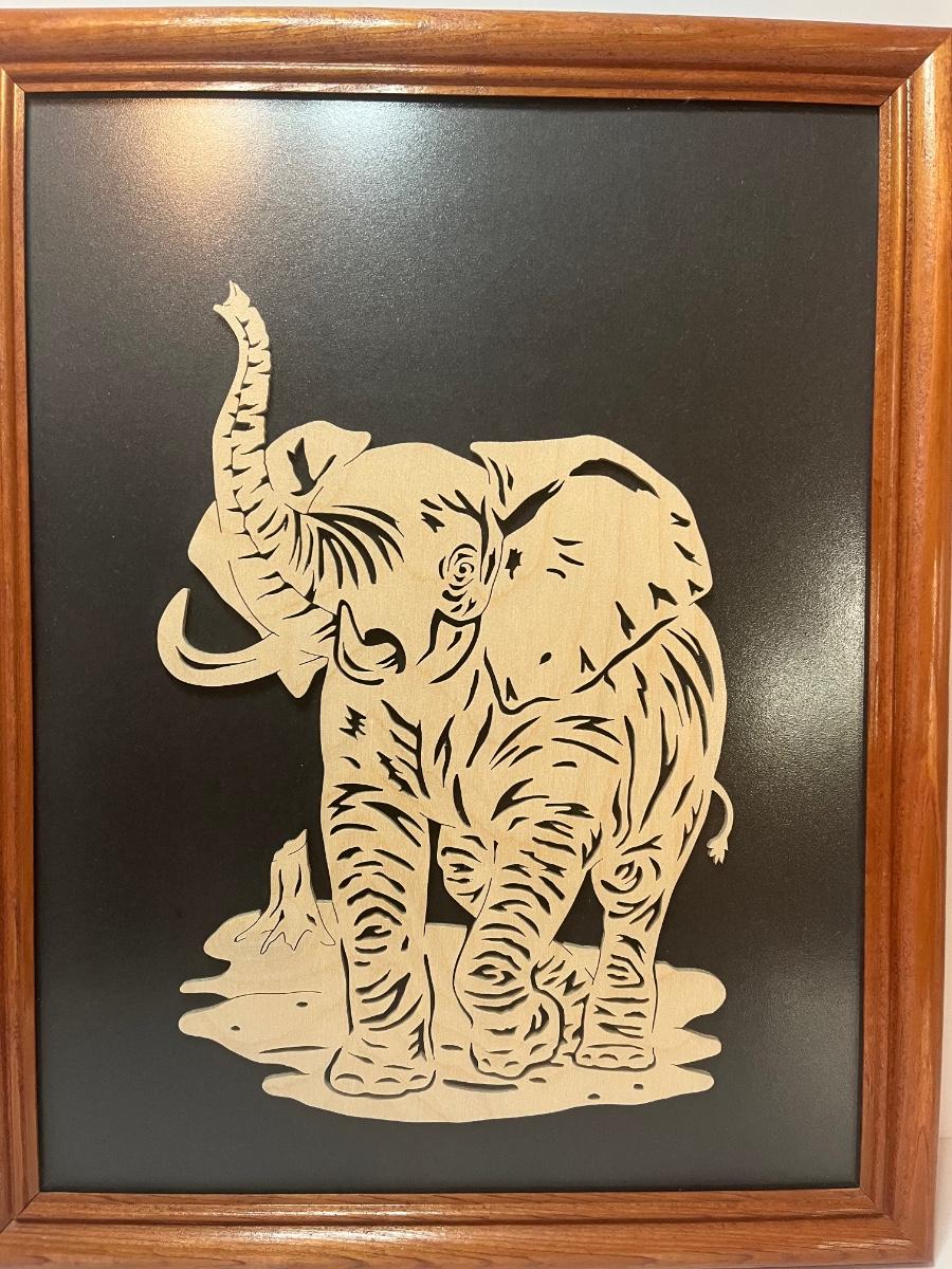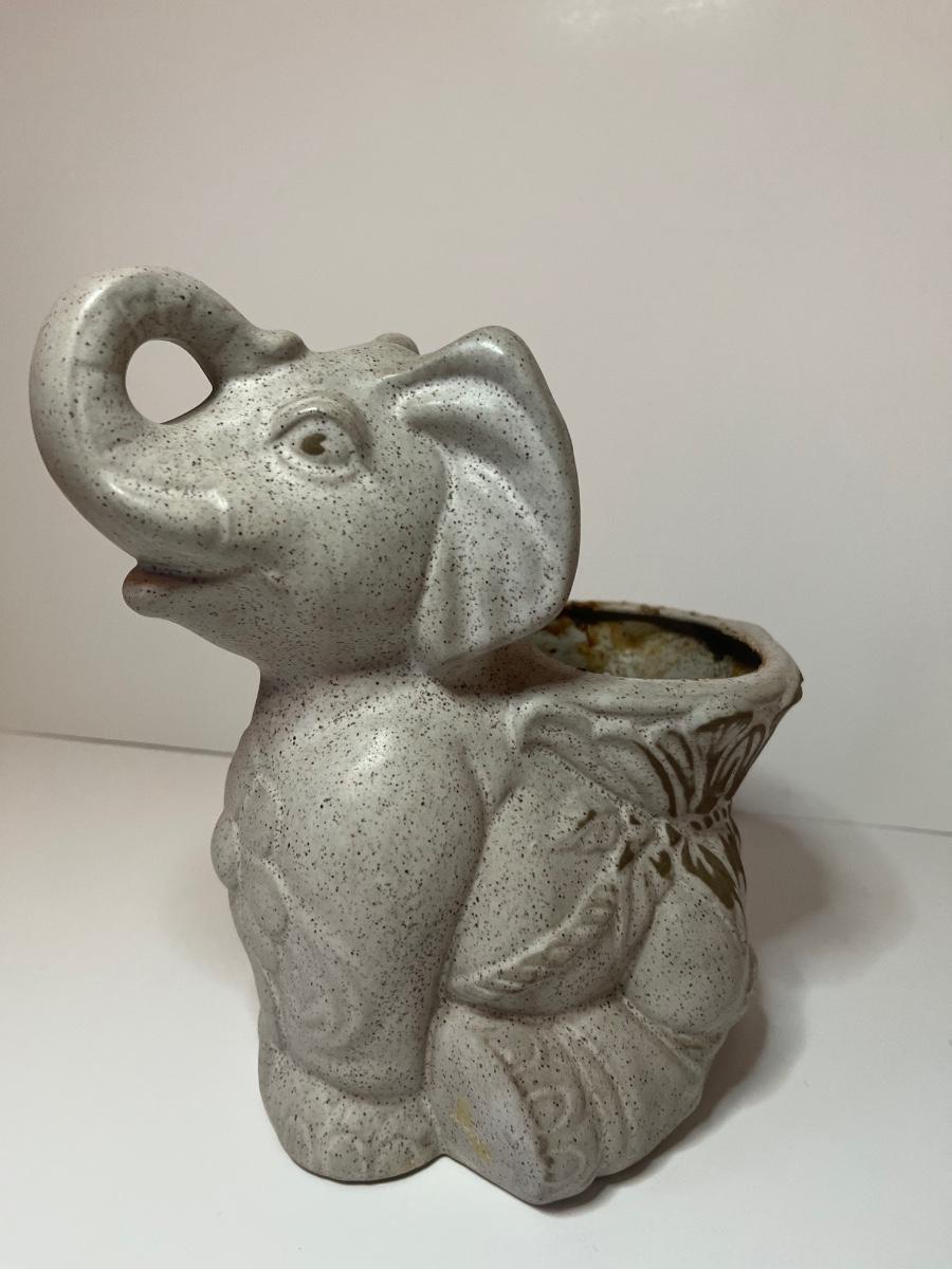 Collections includes a framed laser cut wooden elephant by Rod Follmer and a pottery elephant planter.