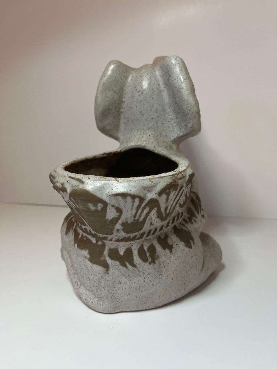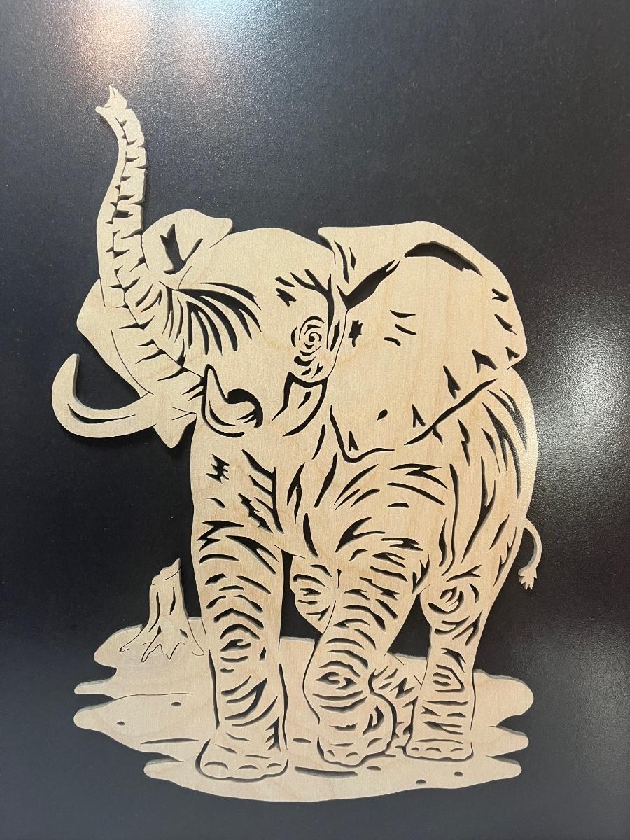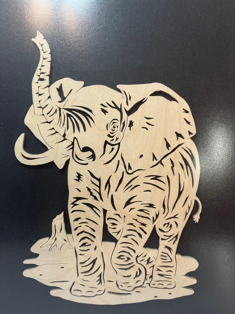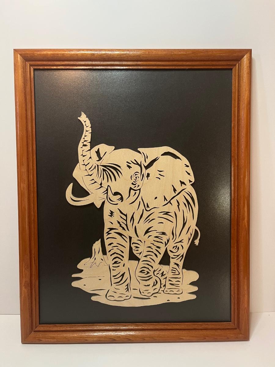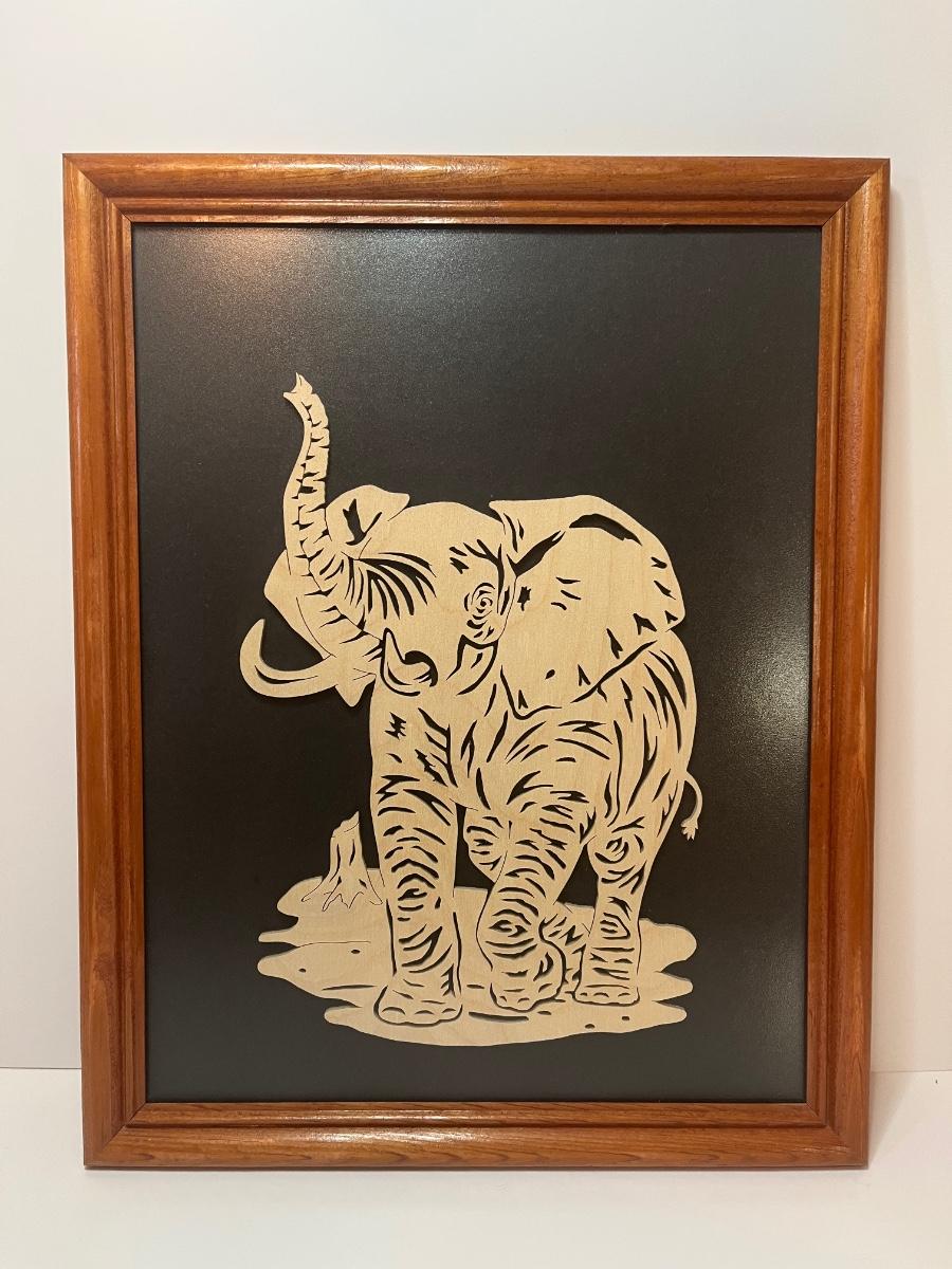 Collections includes a framed laser cut wooden elephant by Rod Follmer and a pottery elephant planter.