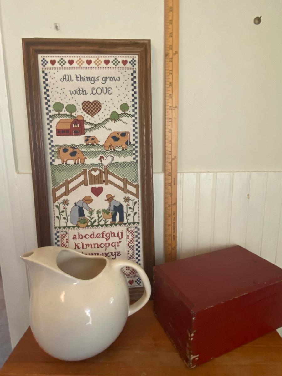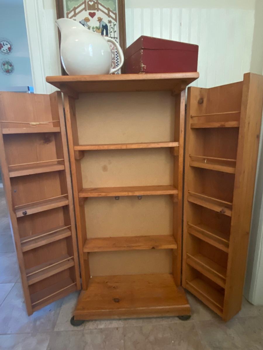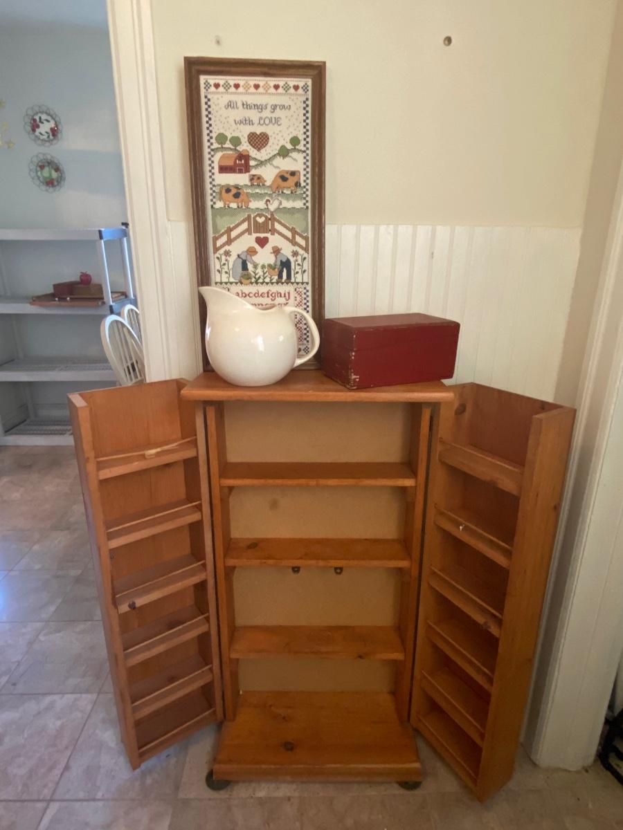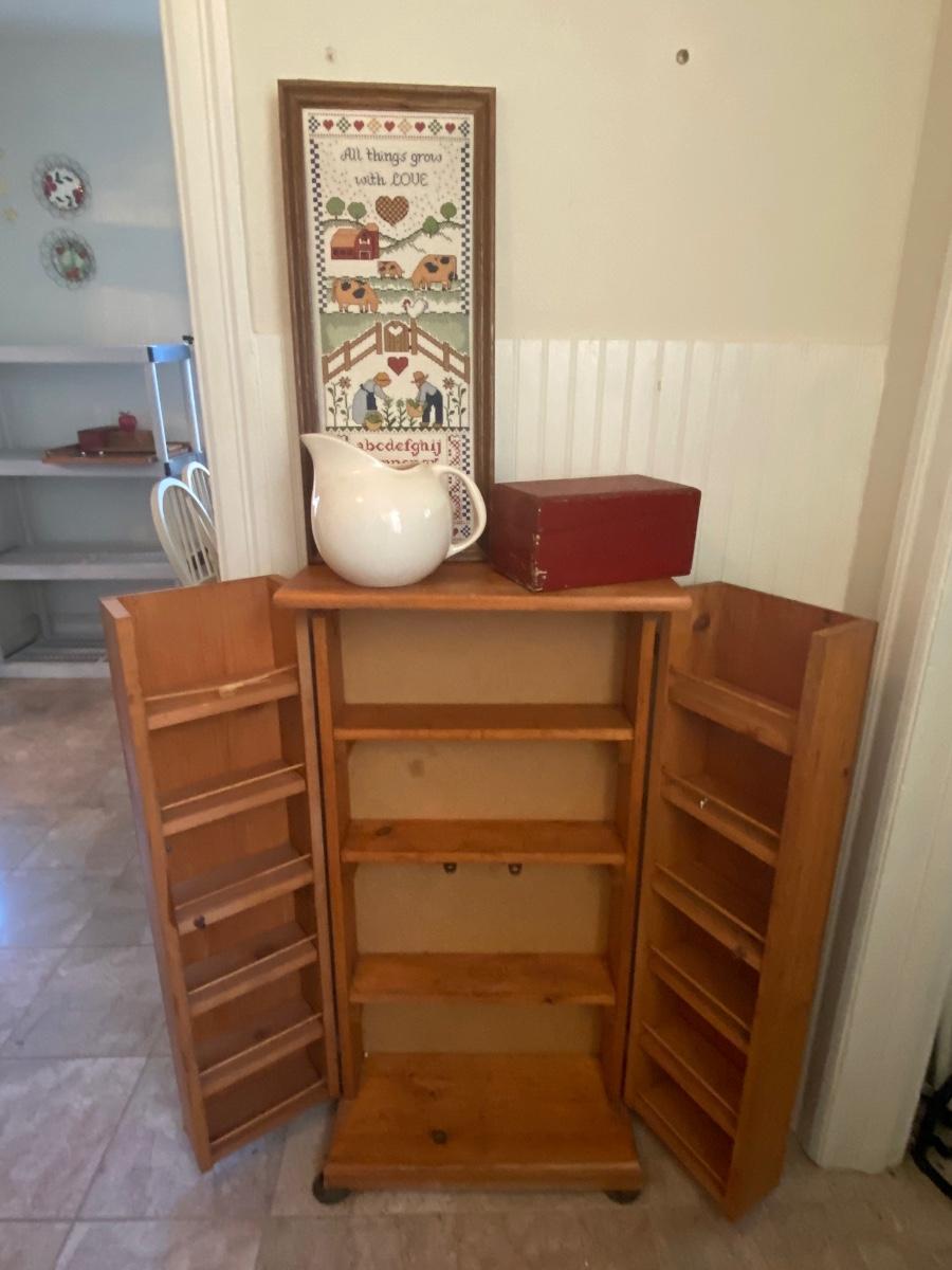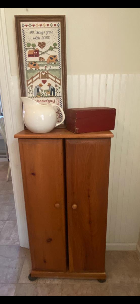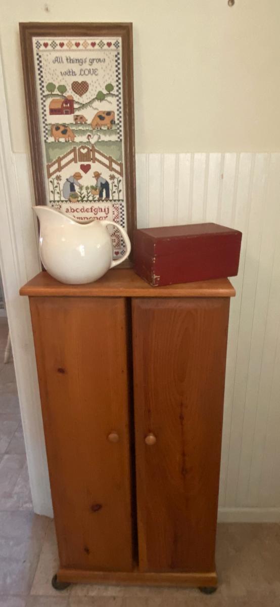 Cabinet is 40x20. Perfect for extra kitchen storage. Cross stitch in frame, pitcher and recipe box. Please see all pictures as they are the best representation of the items. The pictures show condition, measurements if taken, and what is included in the lot. Due to the large amount that we photograph and the time frame, we are not always able to take measurements. All items unless noted, are pre-owned and have been used. If you purchased furniture, you must bring help. We do not allow one person to carry large furniture out on their own. Bring help, tools and a truck for the safety of our client’s homes, and your personal safety. Any damages that result to the property including walls, and floors due to moving of the furniture will be charged to the buyer. Company policy. Thank you.