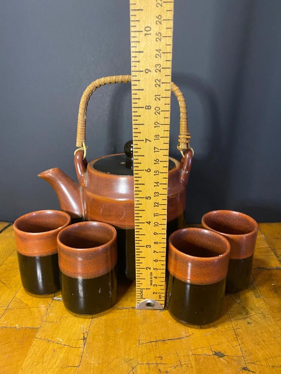 Set of 4 teacups & teapot made inJapan. Please see all pictures as they are the best representation of the items. The pictures show condition, measurements if taken, and what is included in the lot. Due to the large amount that we photograph and the time frame, we are not always able to take measurements. All items unless noted, are pre-owned and have been used. If you purchased furniture, you must bring help. We do not allow one person to carry large furniture out on their own. Bring help, tools and a truck for the safety of our client’s homes, and your personal safety. Any damages that result to the property including walls, and floors due to moving of the furniture will be charged to the buyer. Company policy. Thank you.