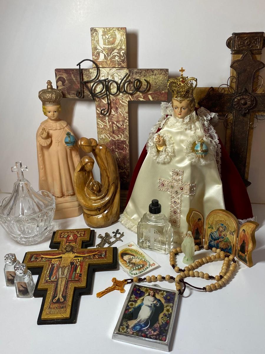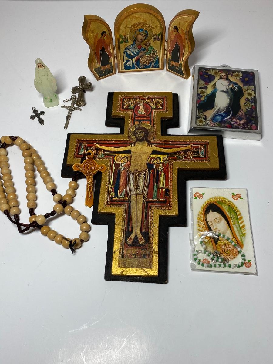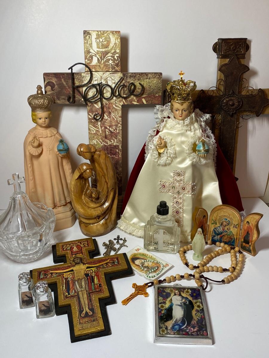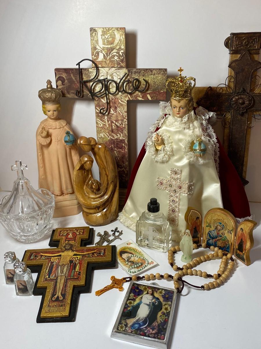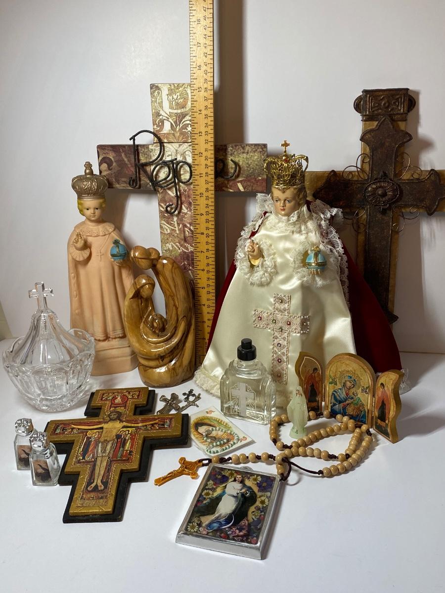 Mixed collection of religious items. Some vintage and some newer. Please see all pictures as they are the best representation of the items. The pictures show condition, measurements if taken, and what is included in the lot. Due to the large amount that we photograph and the time frame, we are not always able to take measurements. All items unless noted, are pre-owned and have been used. If you purchased furniture, you must bring help. We do not allow one person to carry large furniture out on their own. Bring help, tools and a truck for the safety of our client’s homes, and your personal safety. Any damages that result to the property including walls, and floors due to moving of the furniture will be charged to the buyer. Company policy. Thank you.