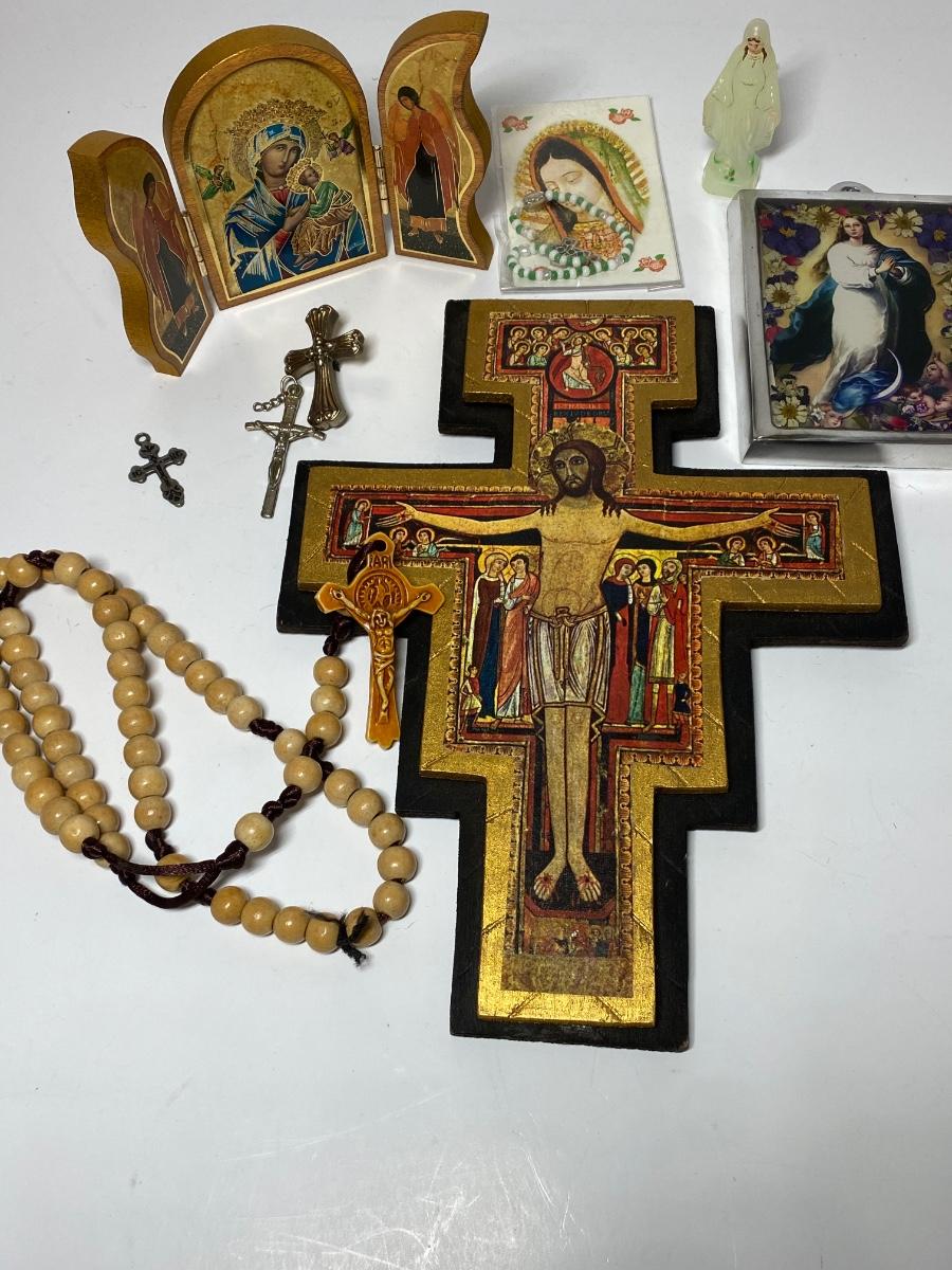 LOT 180G: Religious Collection: Crosses, Figures, Carved Nativity Statue, Crucifix & More