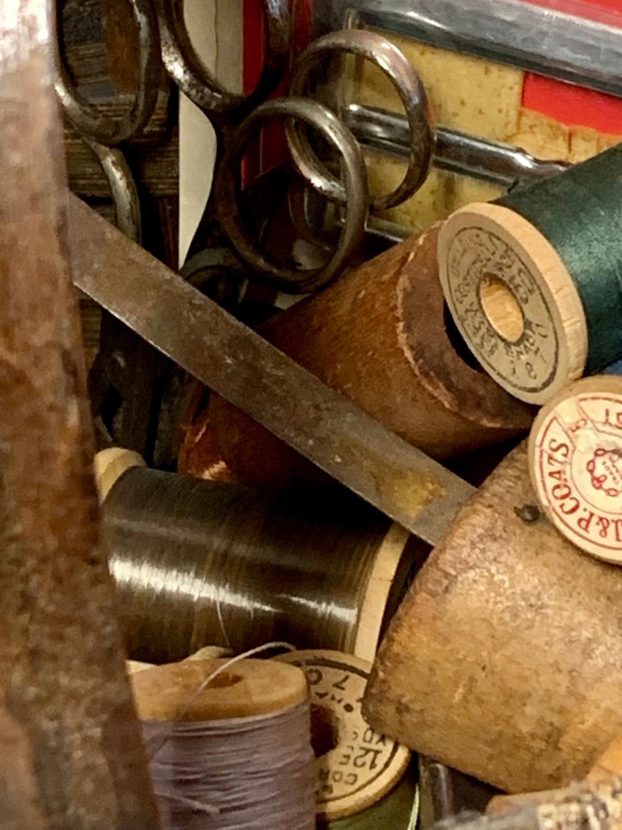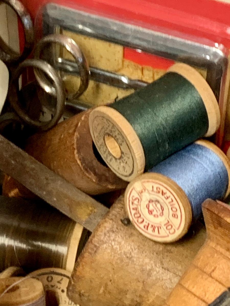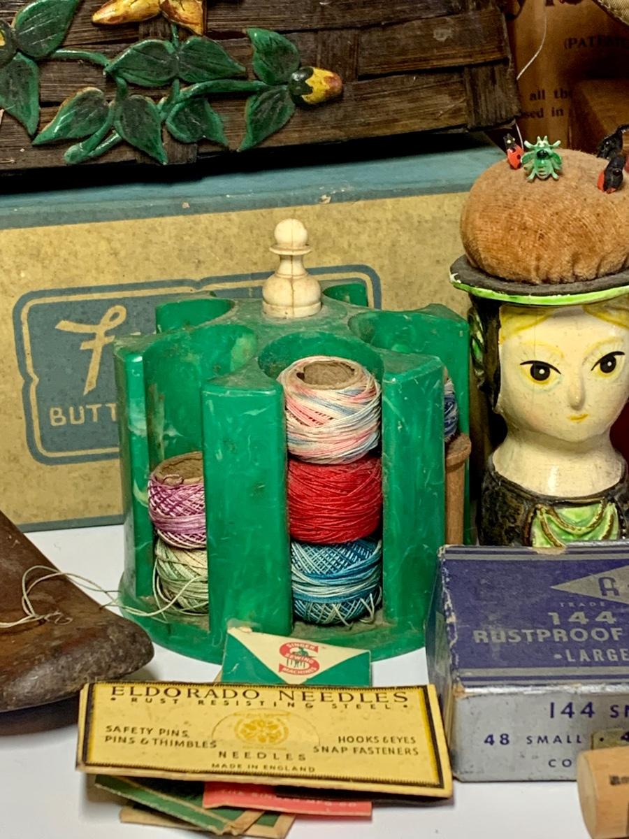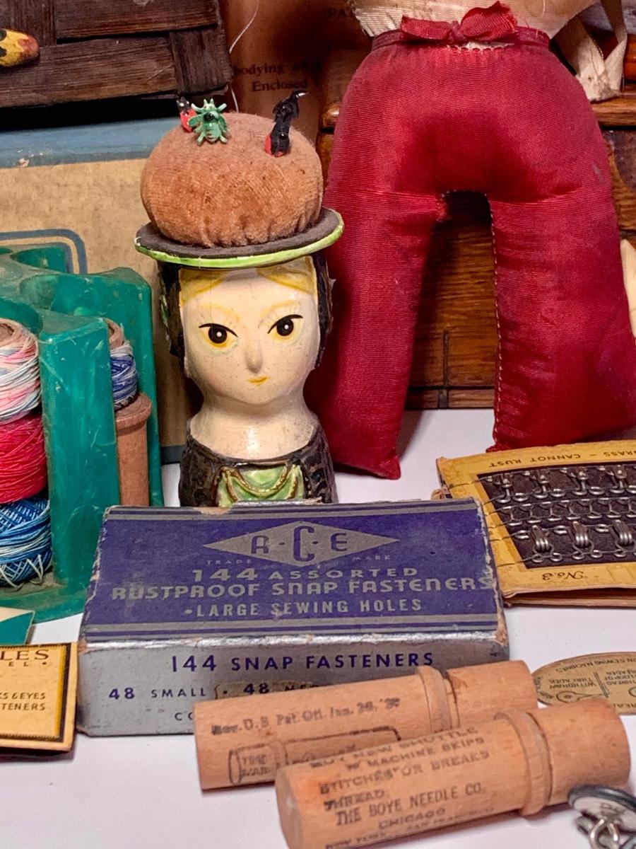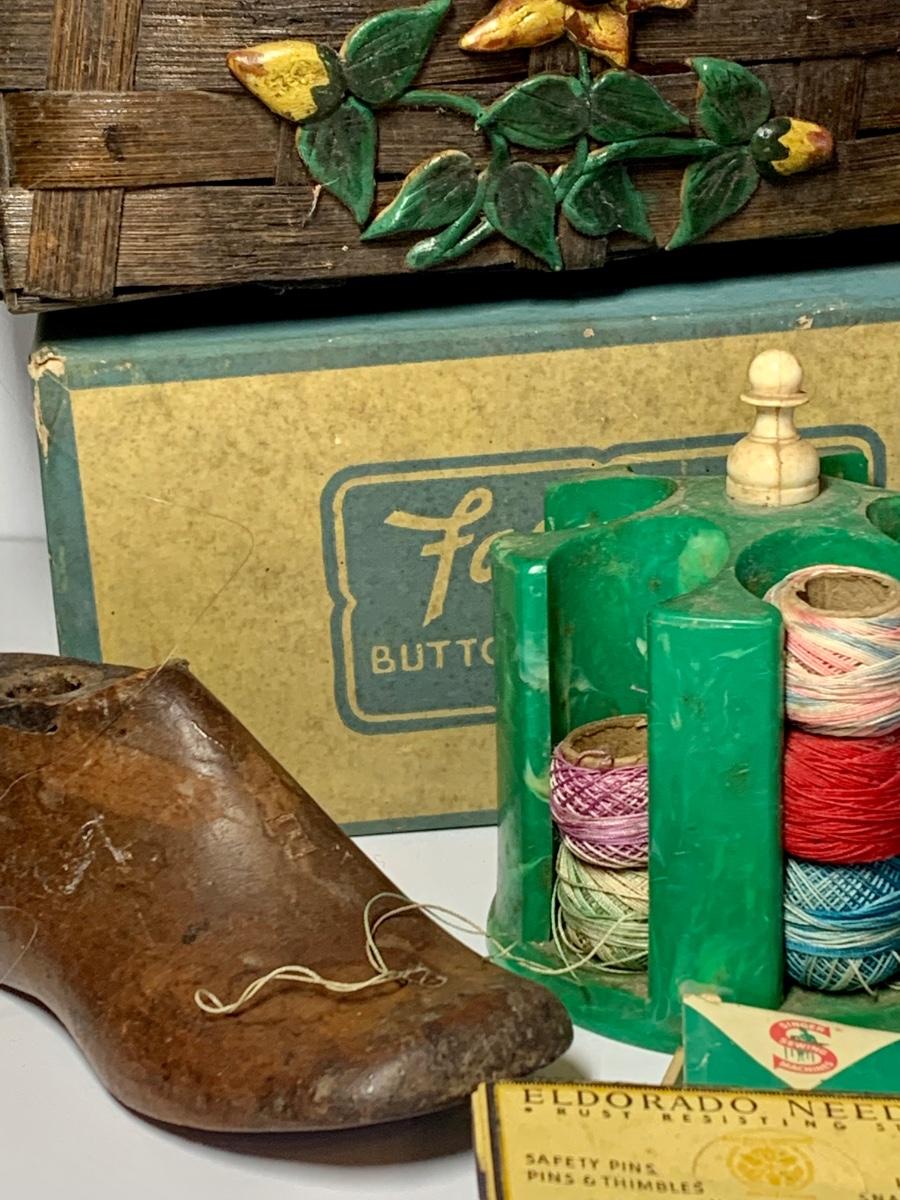 LOT 2R: Unique Antique & Vintage Sewing Notions, Folding Oak Parts Box  & More