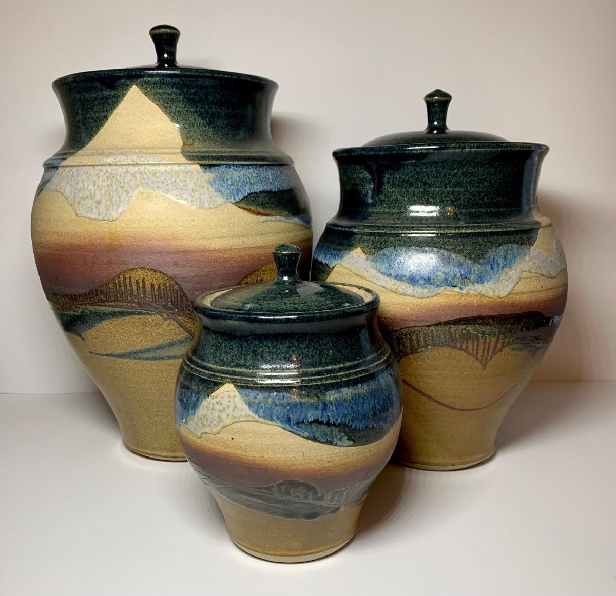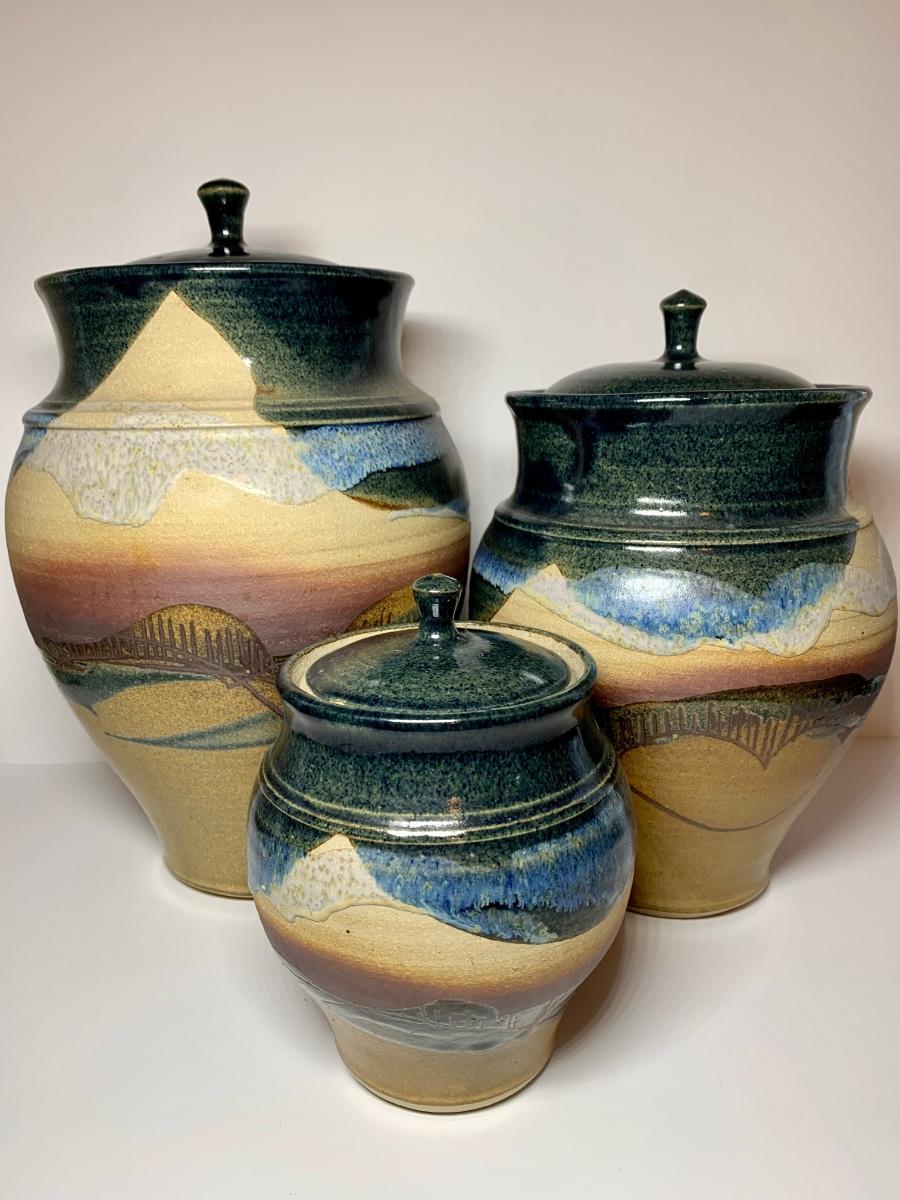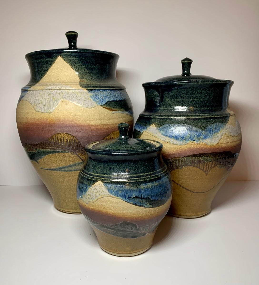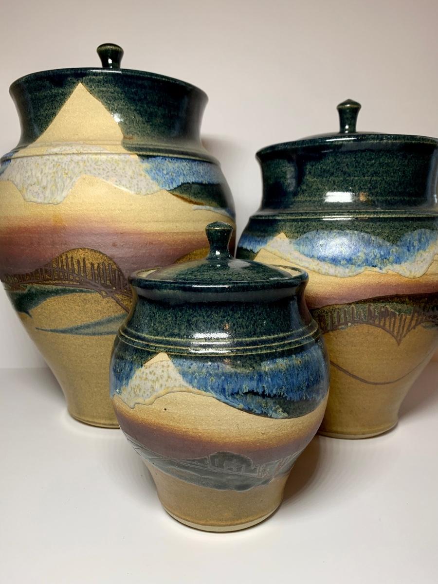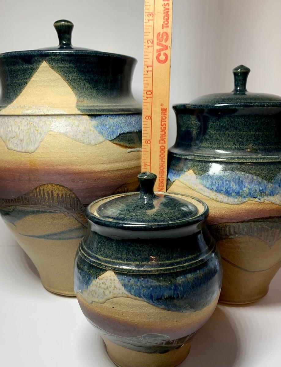 Set of 3 matching pottery ginger jars: gorgeous set.
