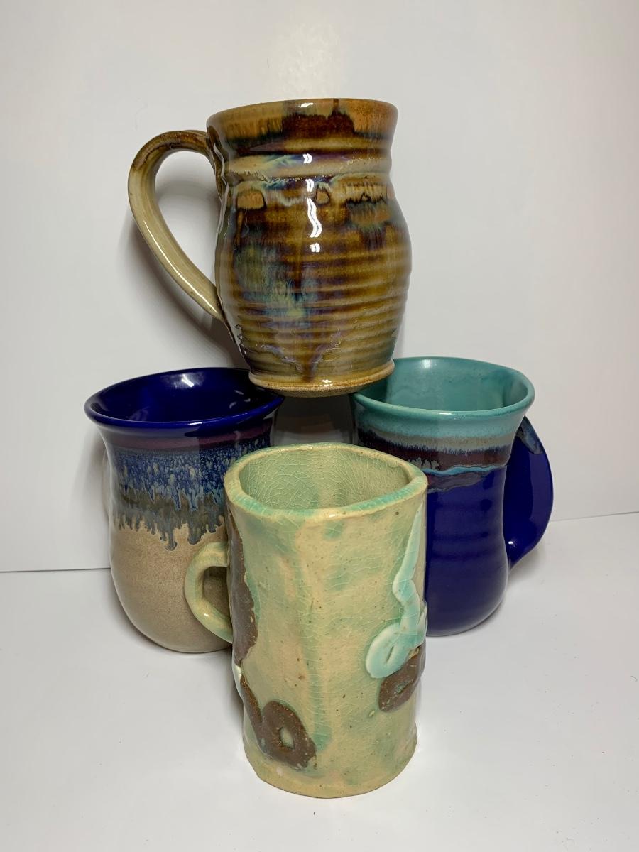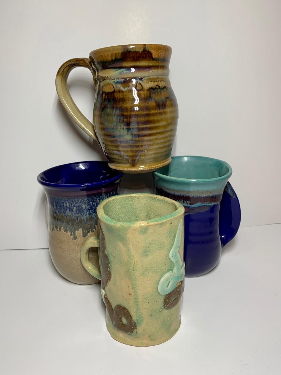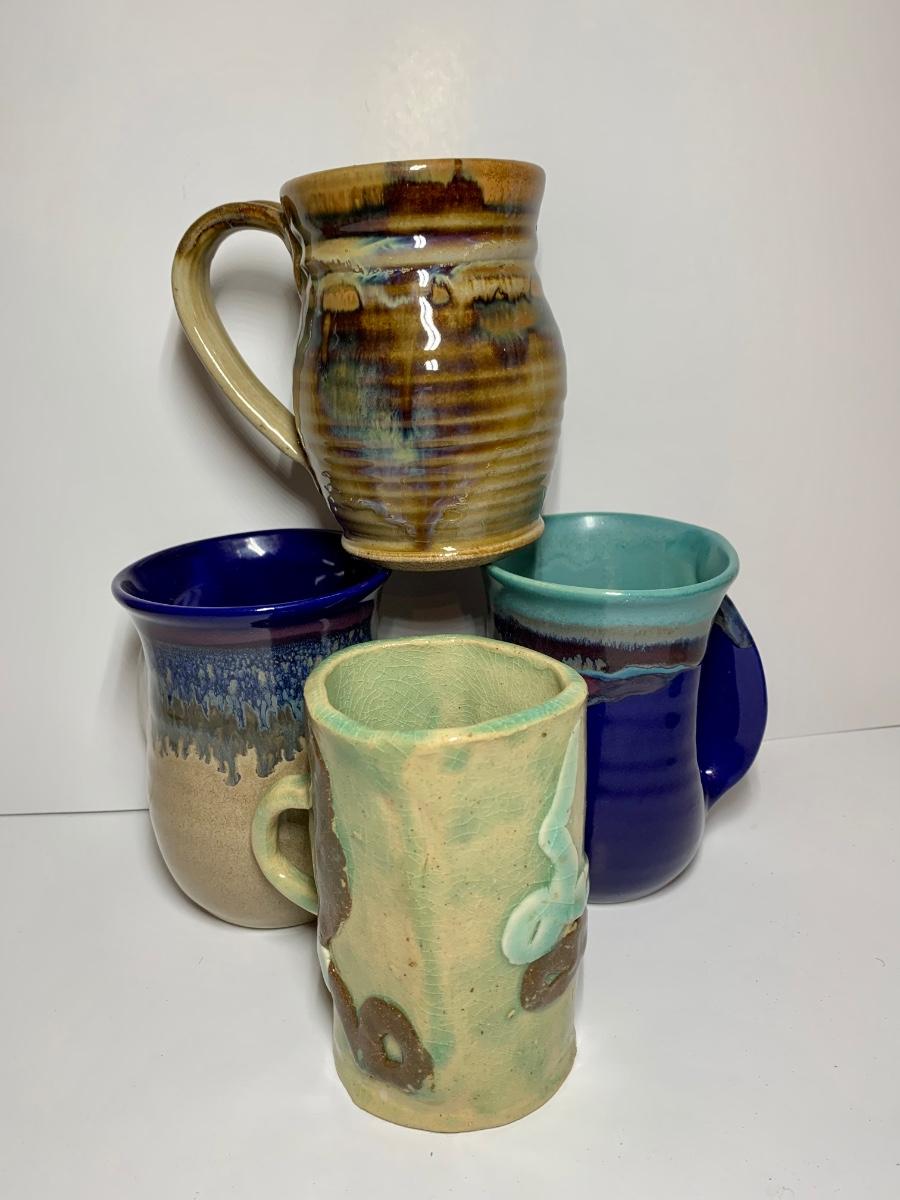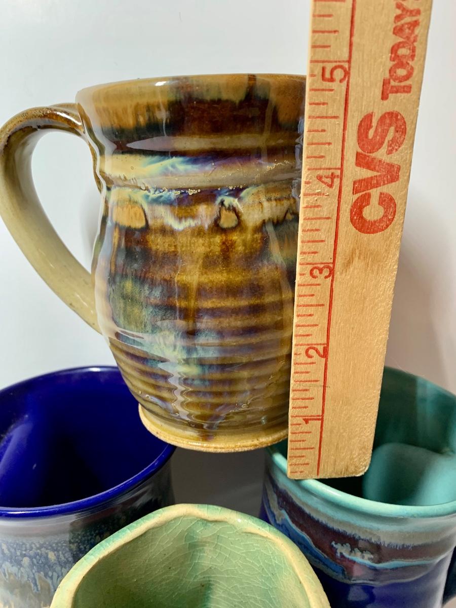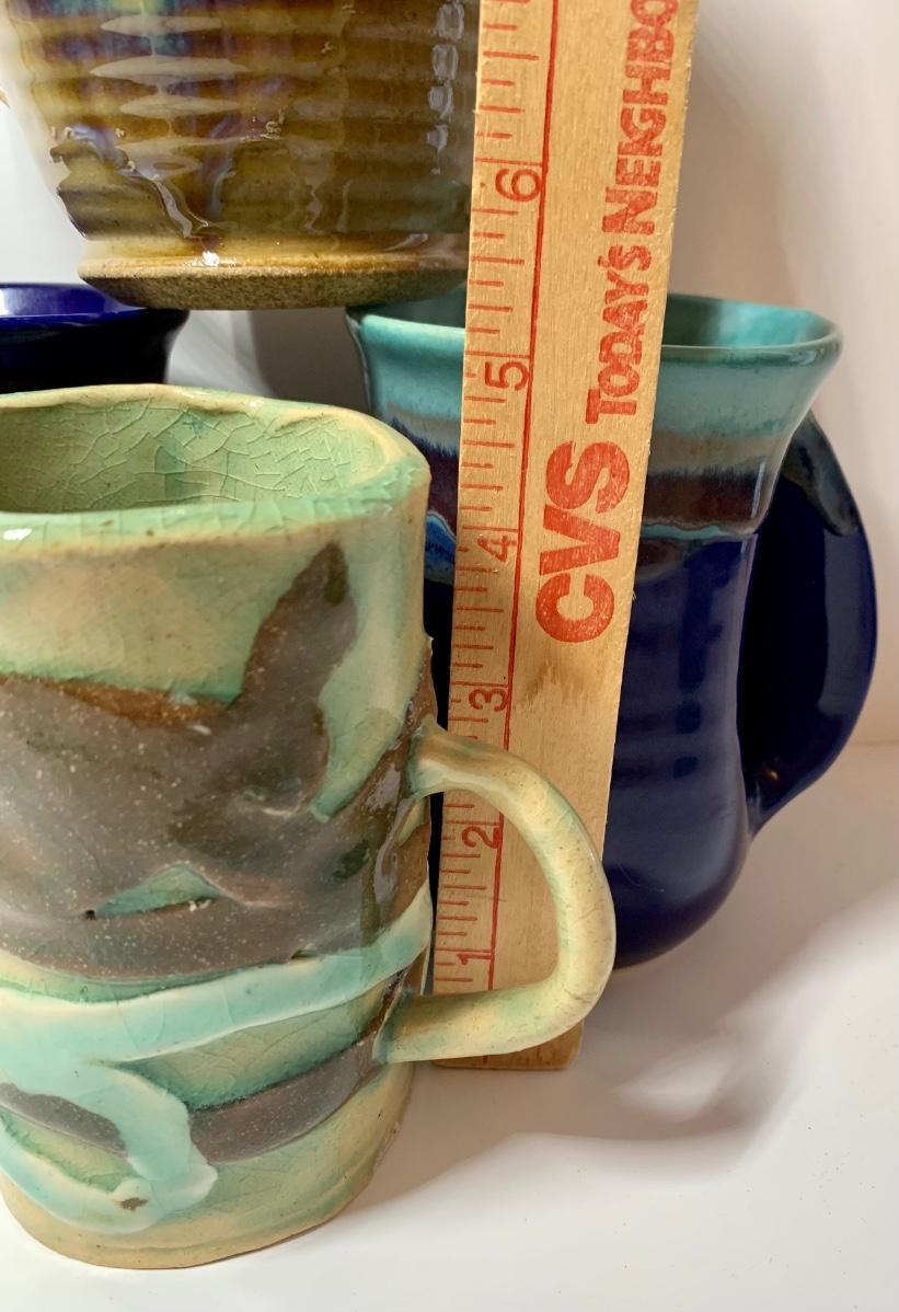 Set of 4 signed pottery mugs with 2 hand warmer/pocket mugs
