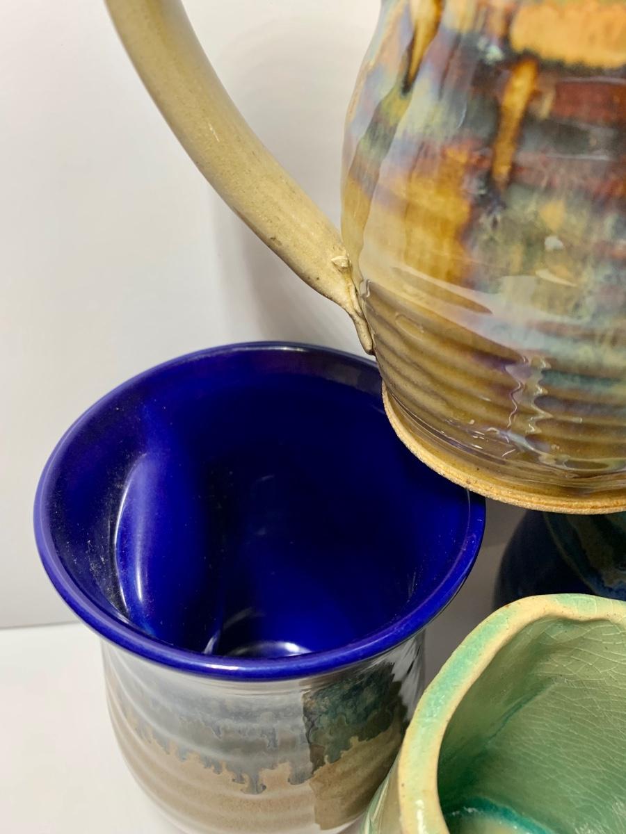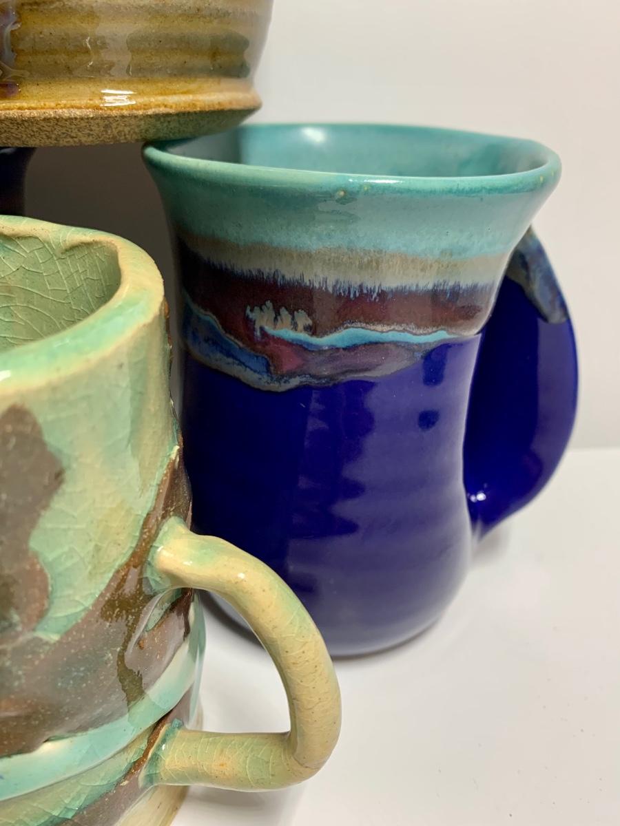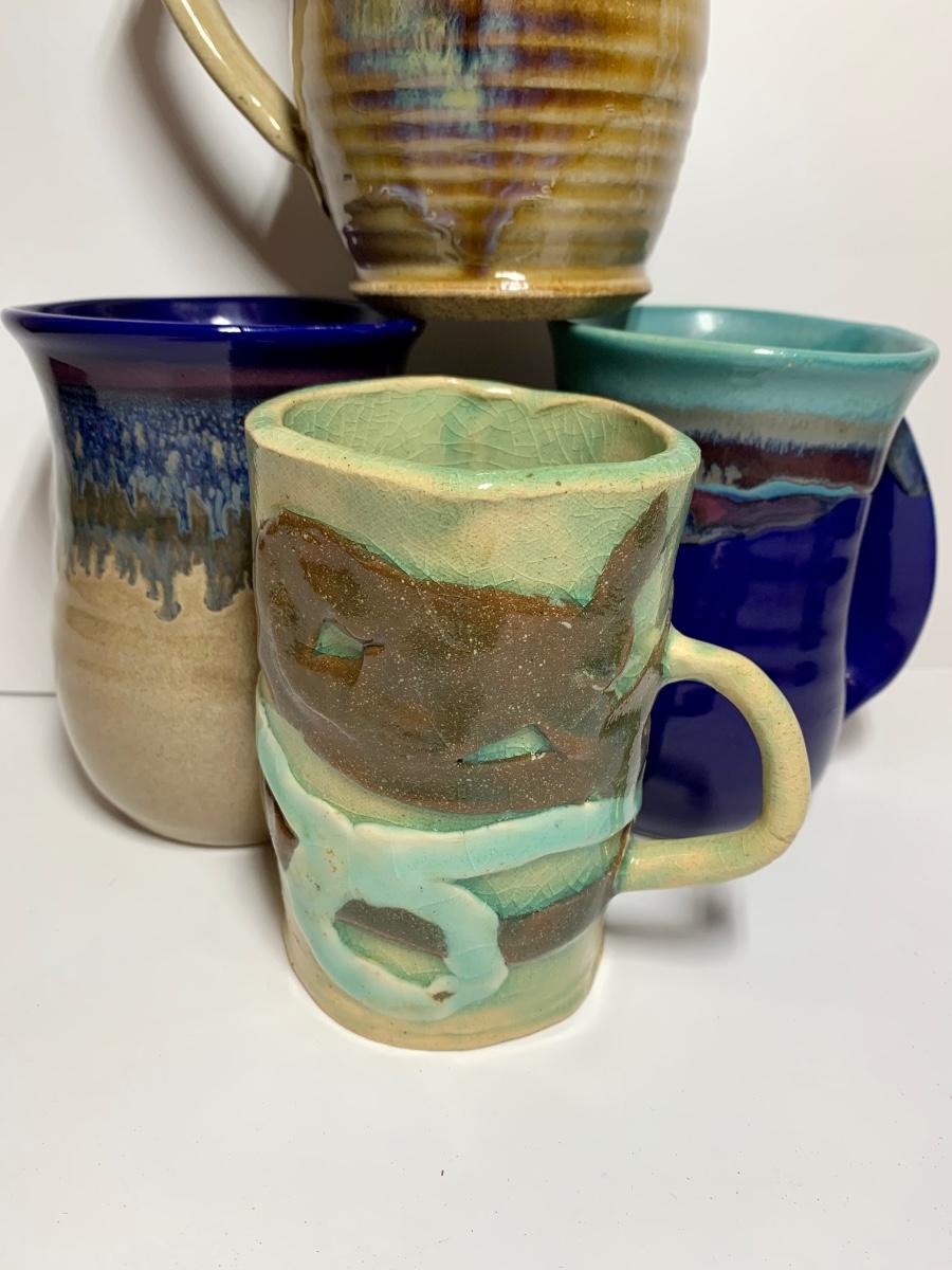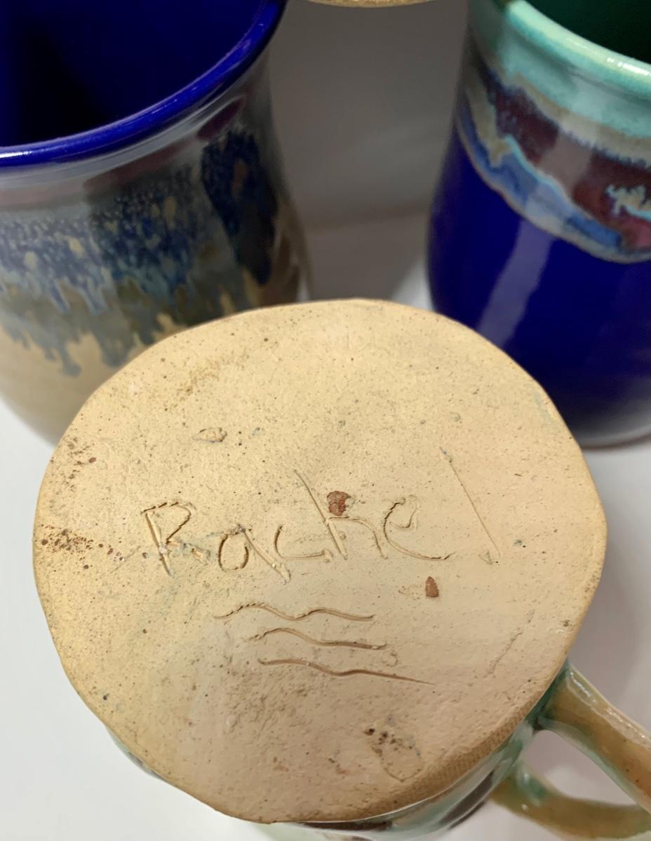 Set of 4 signed pottery mugs with 2 hand warmer/pocket mugs