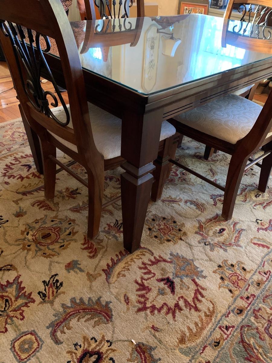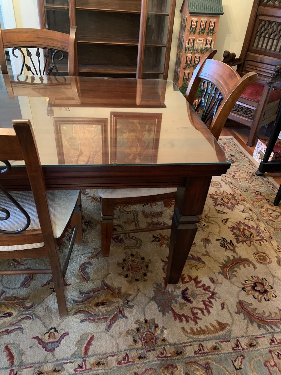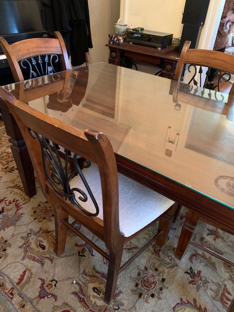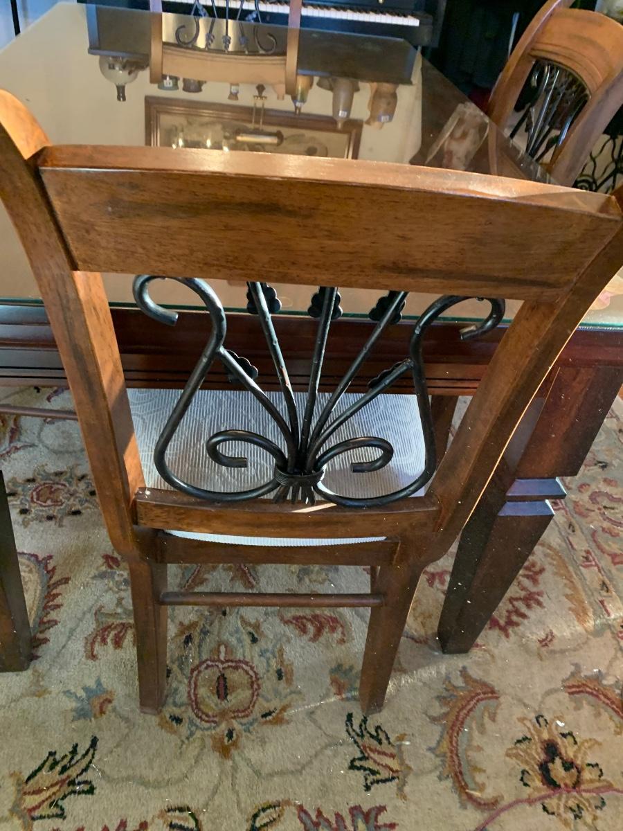 62 x 38 x 30 table & chairs set, This is a solid set and heavy. Has lovely scrollback design to the chairs, and a glass top to protect the wood.