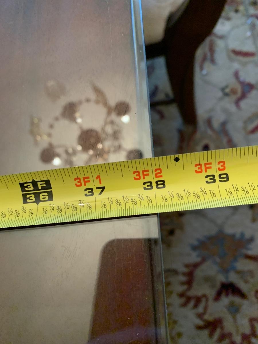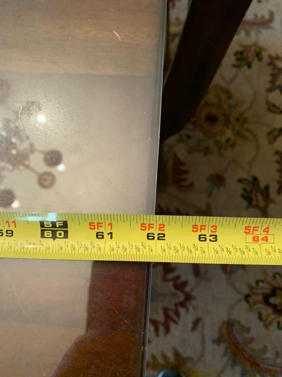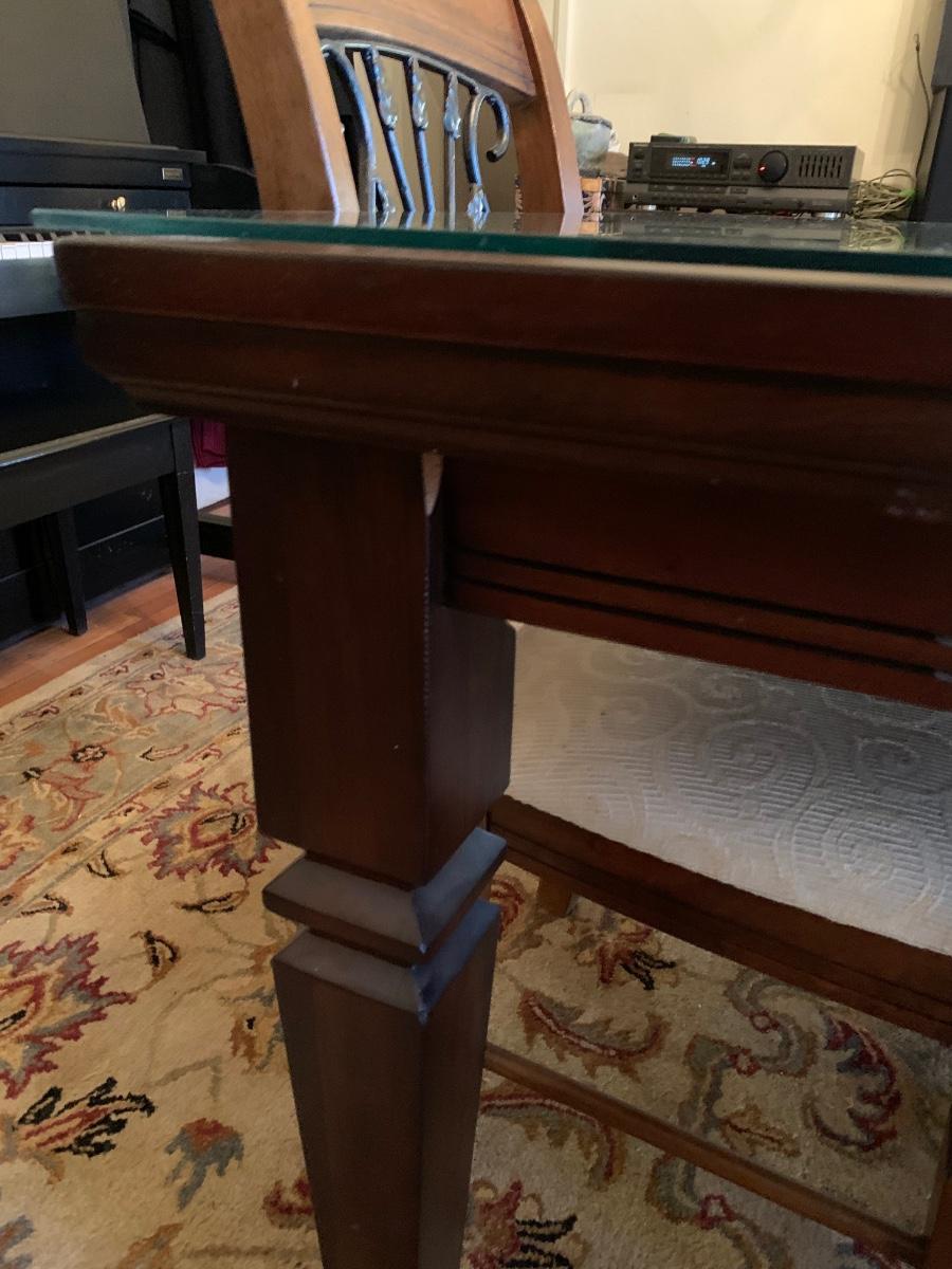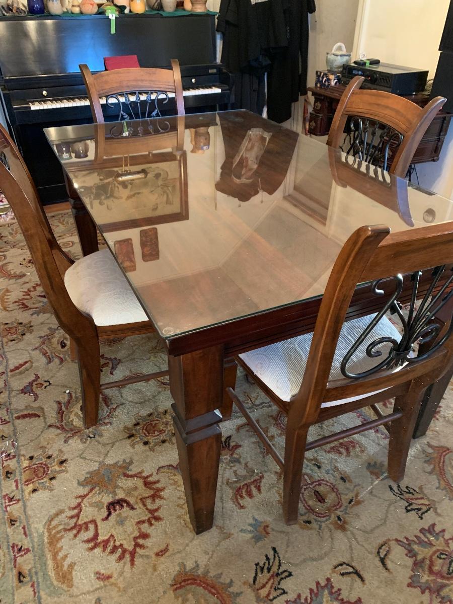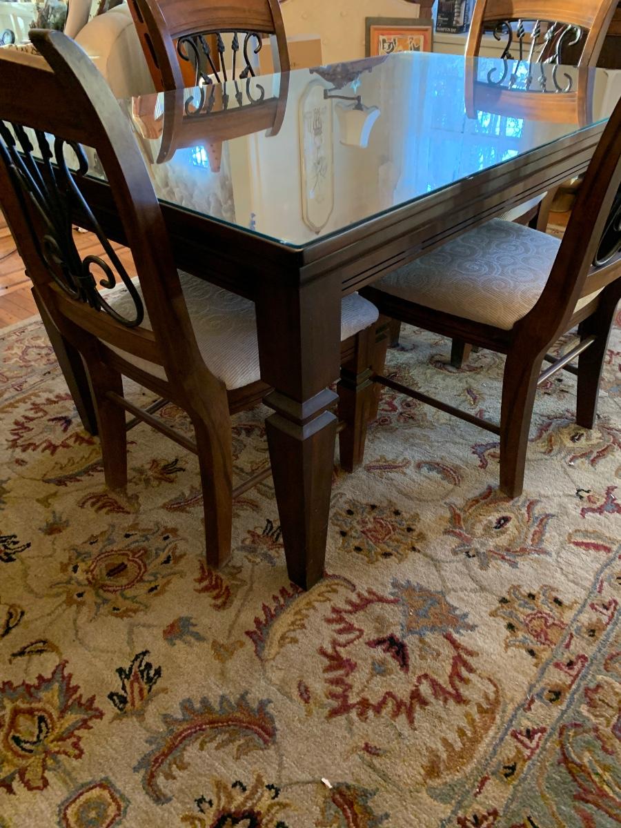 62 x 38 x 30 table & chairs set, This is a solid set and heavy. Has lovely scrollback design to the chairs, and a glass top to protect the wood.